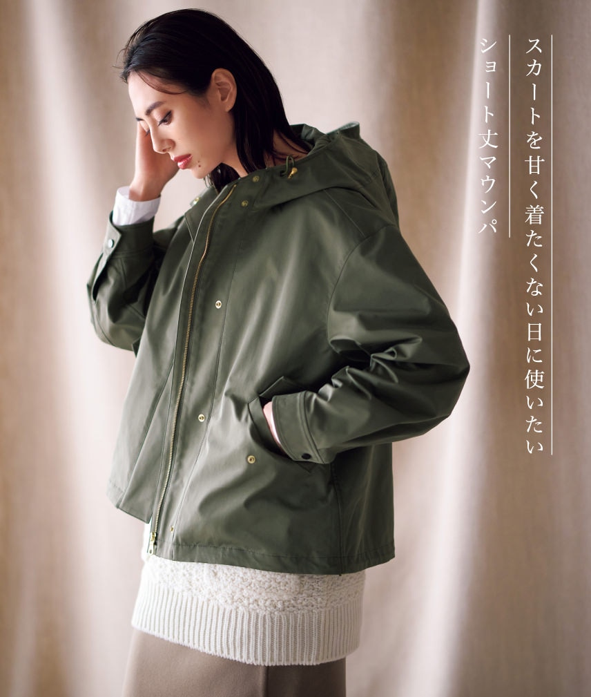 立体的なシルエットで今っぽく着られるマウンテンパーカー。付属部分のゴールド使いでカジュアルながらきれいめに着られます。ボトムスを選ばないショート丈で秋冬に大活躍。