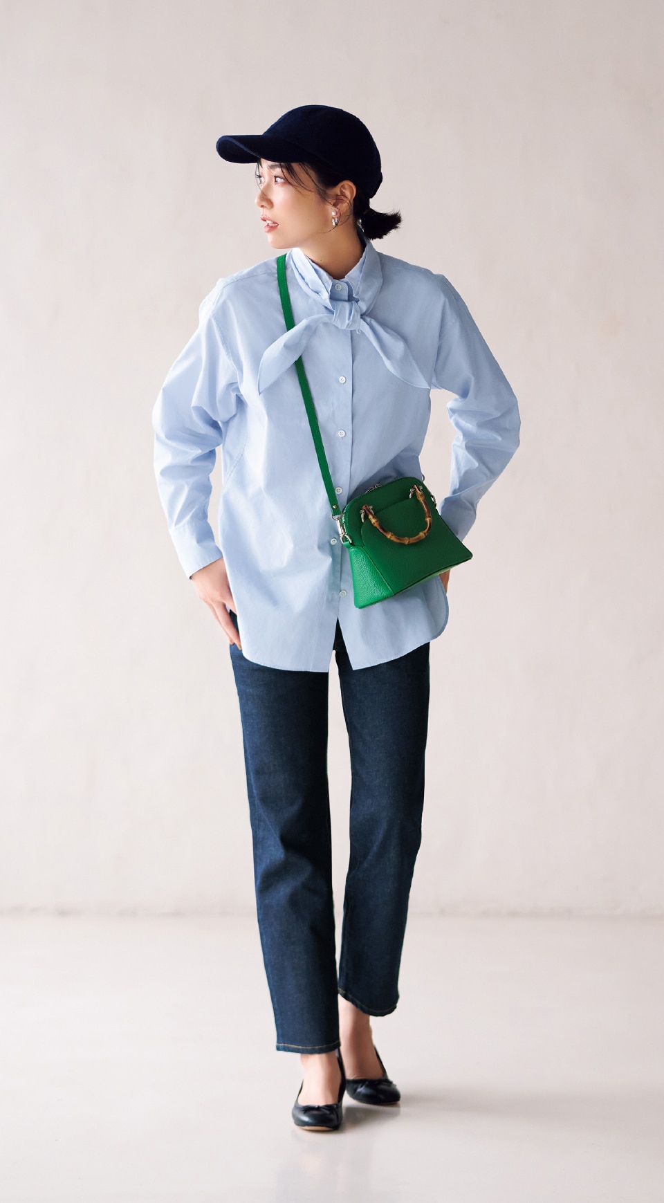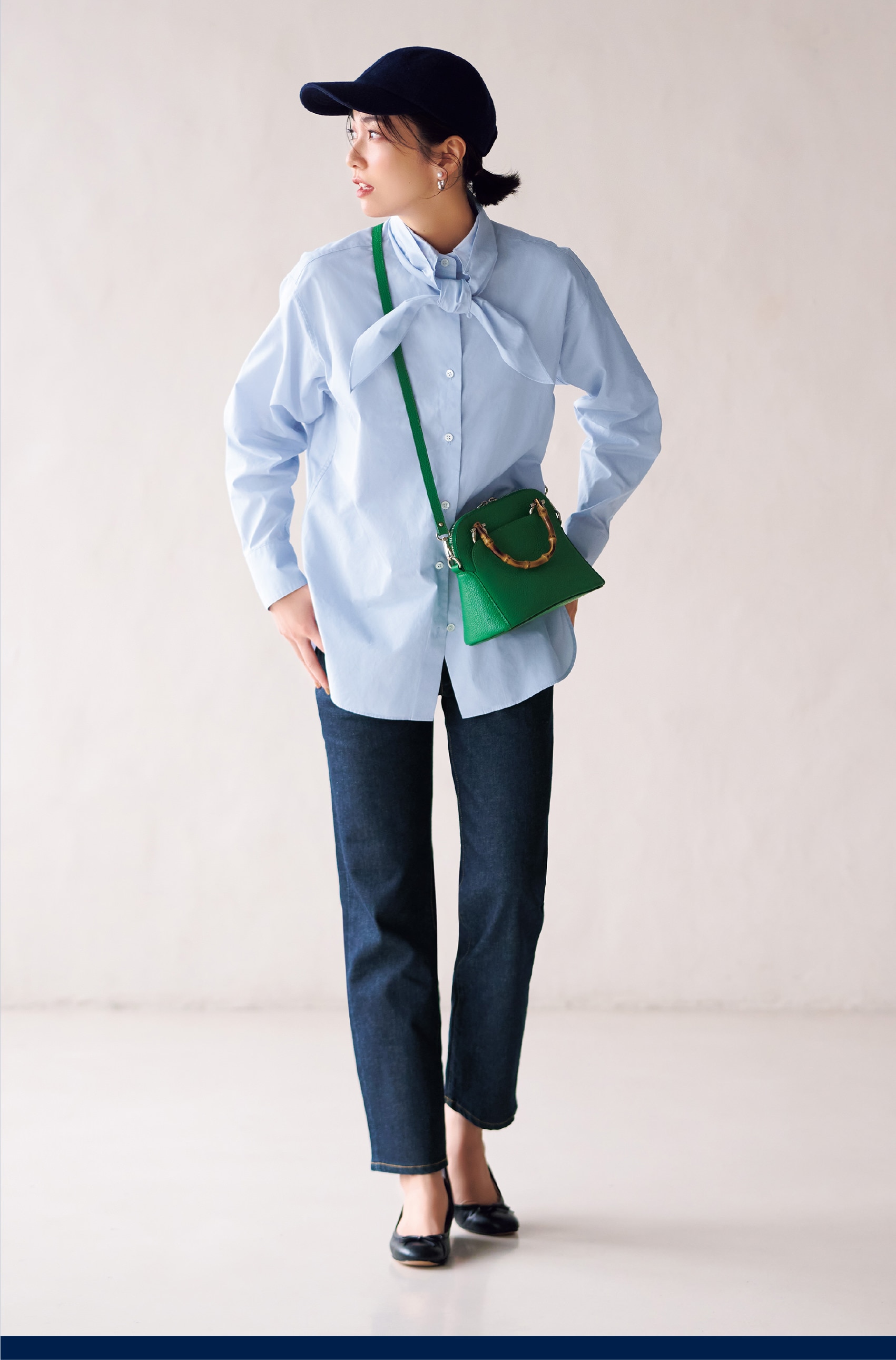 それだけできちんと感のあるスカーフシャツなので、あえてキャップやデニムで真逆のテイストを合わせると大人の品をキープしつつ、旬度の高いカジュアルが完成します。