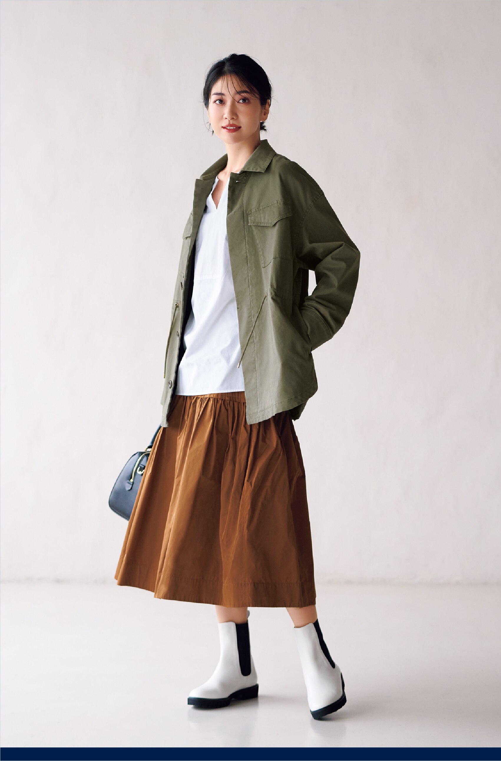 程よい光沢で上質感のあるブラウスとフェミニンなフレアスカートには、ミリタリー風なジャケットを合わせて外すことでキマりすぎていないアップデートされたオシャレに。