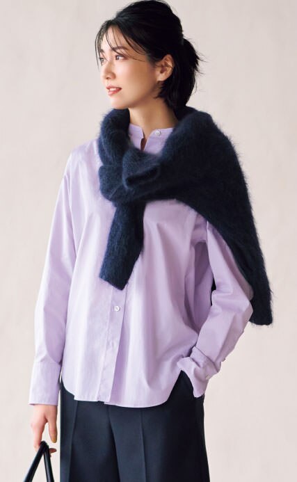 清潔感があり体型カバーも叶う私の偏愛アイテムでもあるシャツ。オケージョンも近所のスーパーもシーン問わずオールシーズン使います。時代の流行があっても永遠の定番なので歴代のシャツも着続けています。ただ背抜きや前だけINなど、着こなし方の変化には敏感でいることも大切です。さらにきちんと感とカジュアルのコントロールアイテムとしても便利!例えばラフなボトムスの時は端正なシャツというようにさじ加減の調節にもなります。時には息子のゆるっとシャツを着たり、クロップド丈を着たりとコーデの方向性によってサイズ感は変えています。男性と違い女性のシャツにはルールがないので、自分の好きなスタイルで想像力豊かに着こなしを楽しむといいと思います。