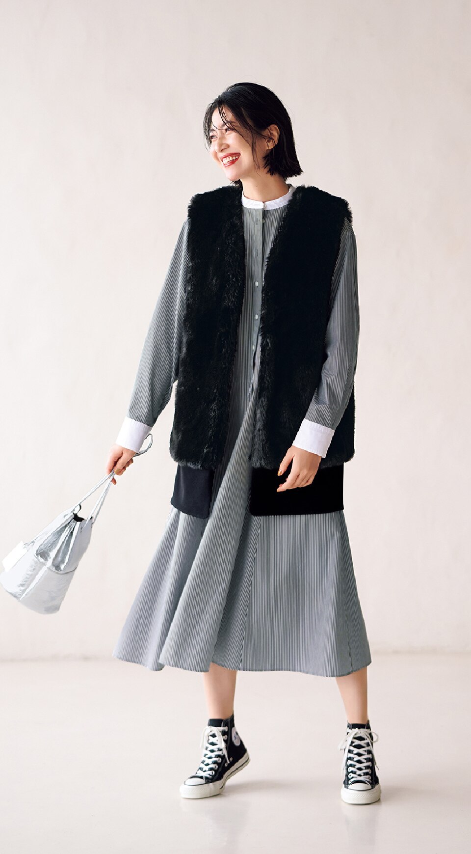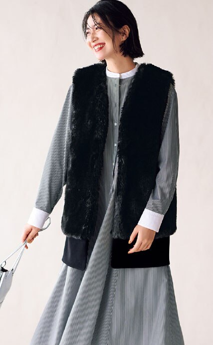 ジレ合わせならワンピースのフレアシルエットや襟や袖のデザインも生かしながらIラインも強調され締まります。エコファーのトレンド感とリッチ感の一挙両得を楽しんで。