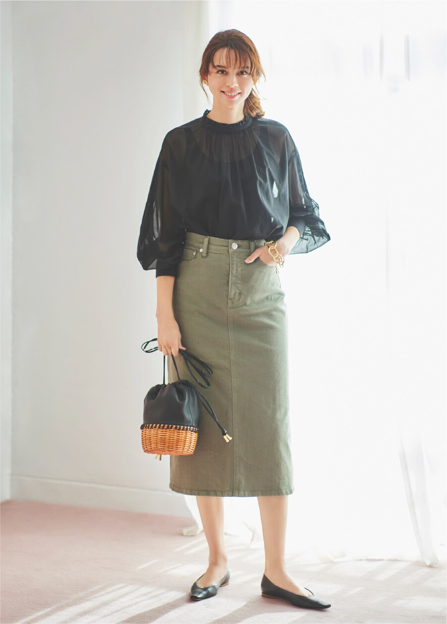 旬顔なカーキとギャザーブラウスの