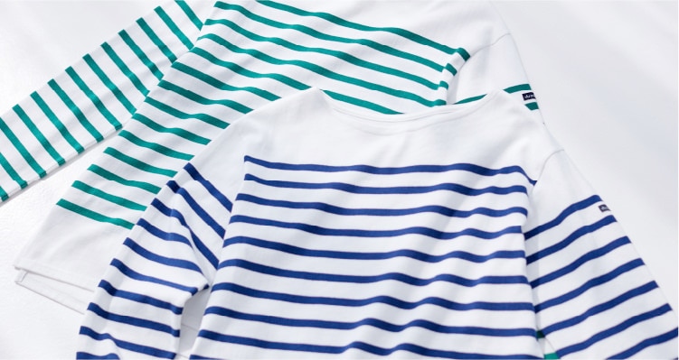 全体のベースを白で統一しながら、差し色は大胆に遊ぶ。おなじみなボーダーも新鮮カラーを選んでコーデをアップデートしたい。
