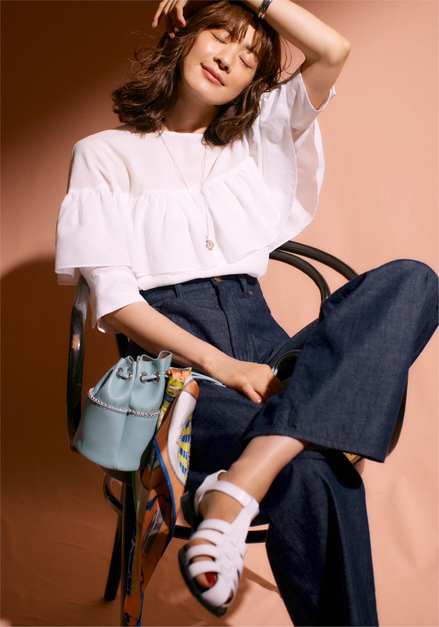 ブラウス以外を黒でまとめれば、白ブラウスがグッと引き立ち、クラシカルな印象に。トレンドのグルカサンダルで足元まで抜かりなく。インしてもアウトしても使いやすく、ボトムも選ばないブラウスはこの夏絶対に持っておきたい指名買いアイテム。