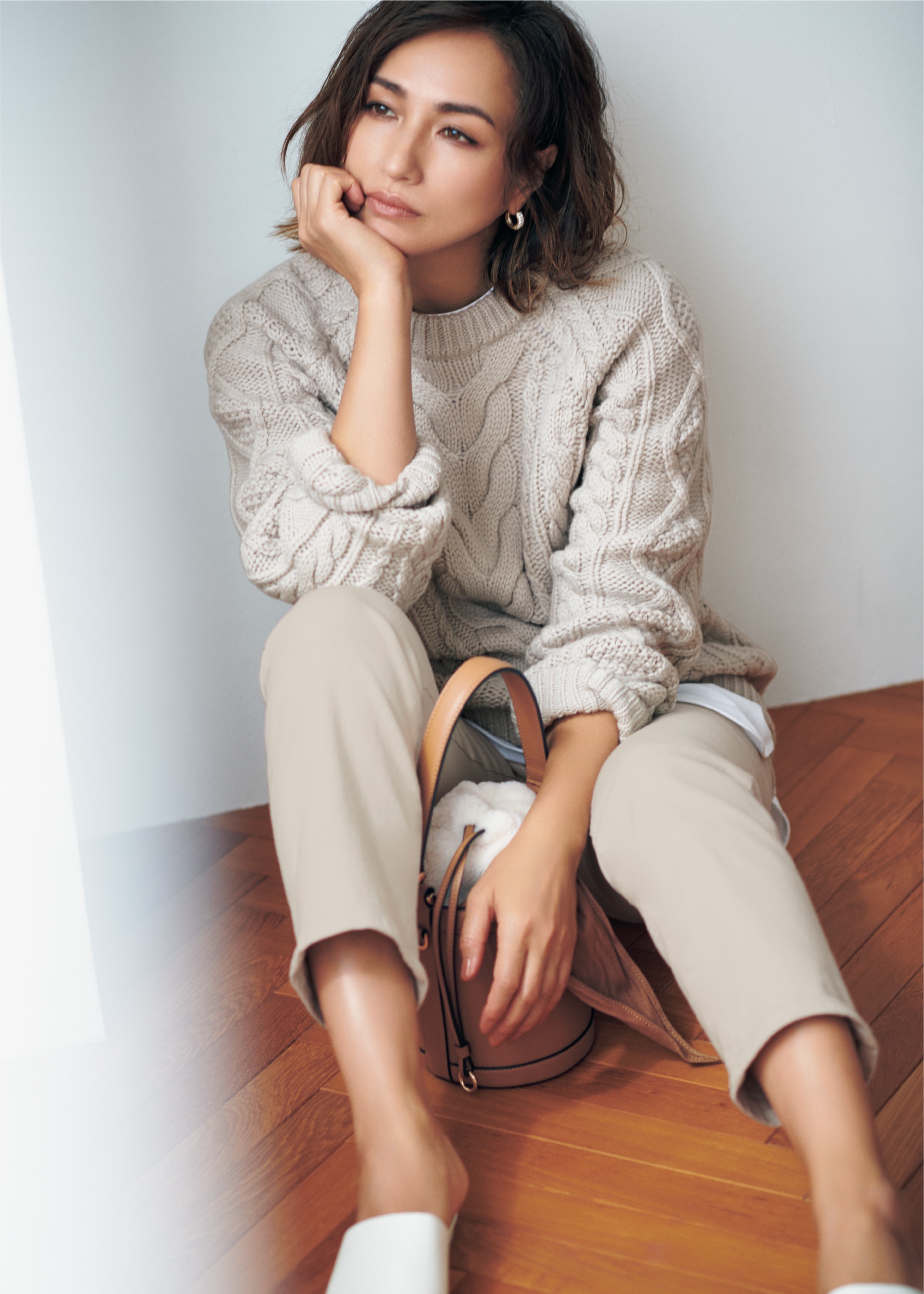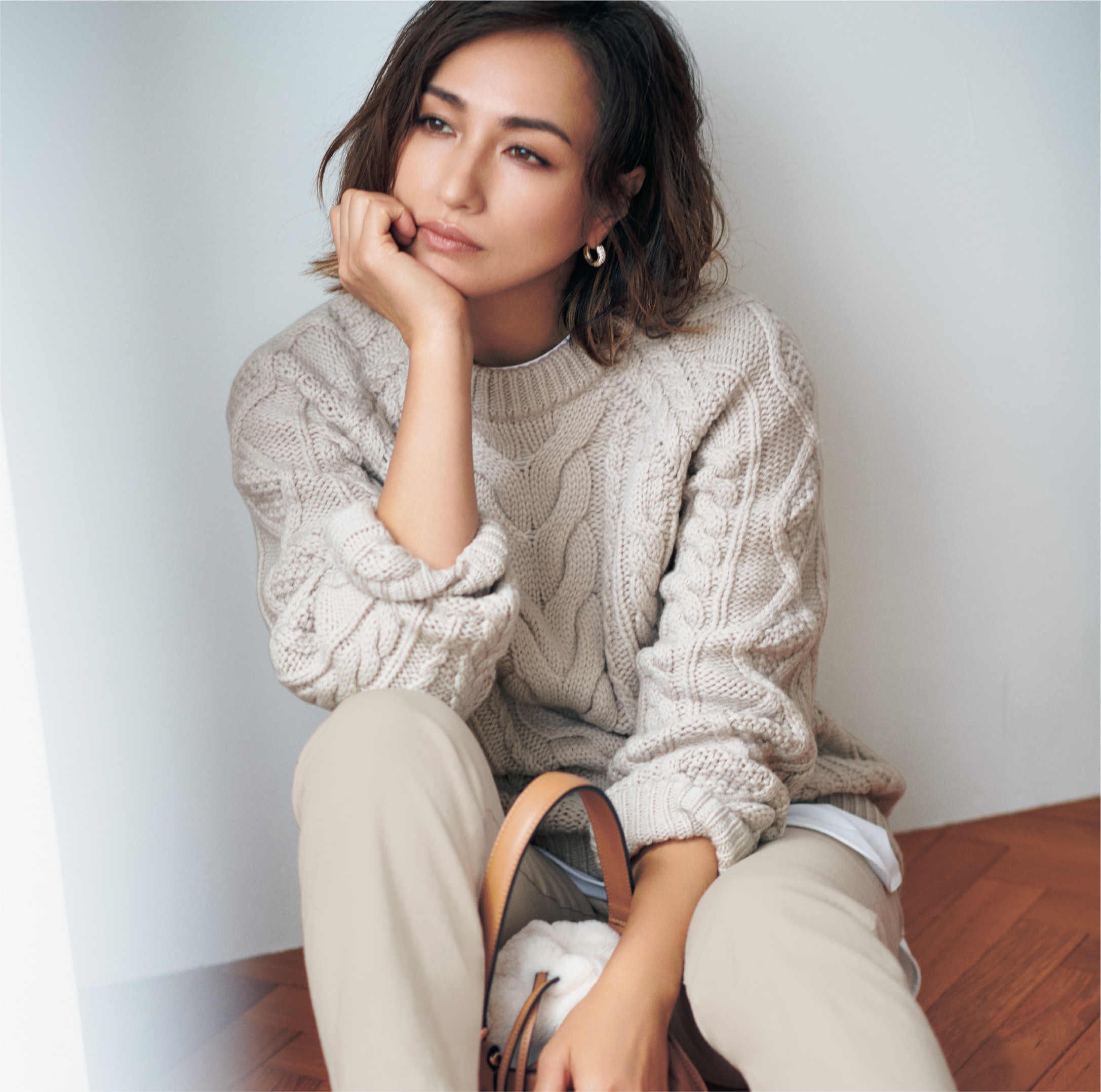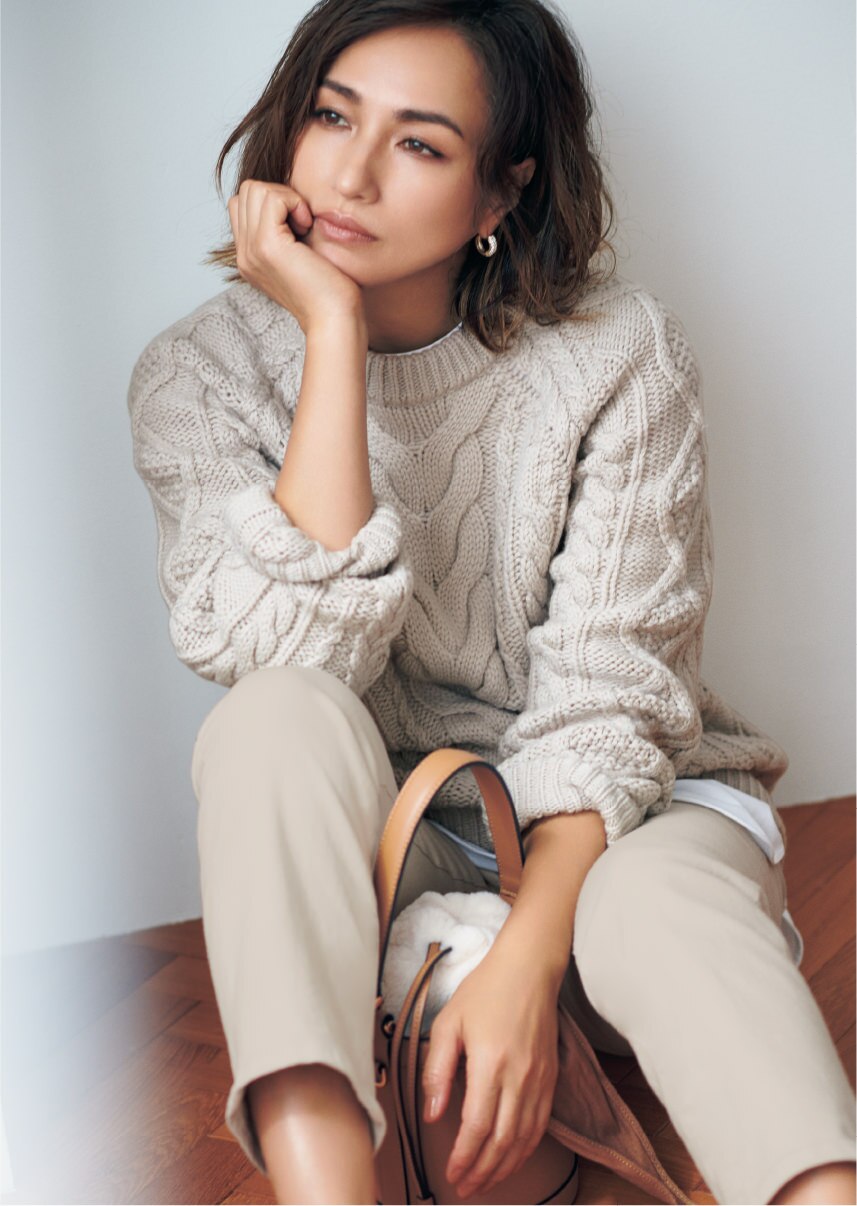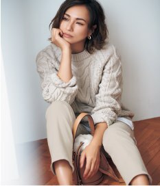 トラッドな印象のあるアランニットを、ベージュのワントーンで女性らしいソフトな印象に。編み目が立体的で表情のあるニットだから、シンプルコーデでも顔周りが華やぎます。厚手のニットは手元に抜け感を作ると、すっきり着こなせてより洗練された着こなしに。