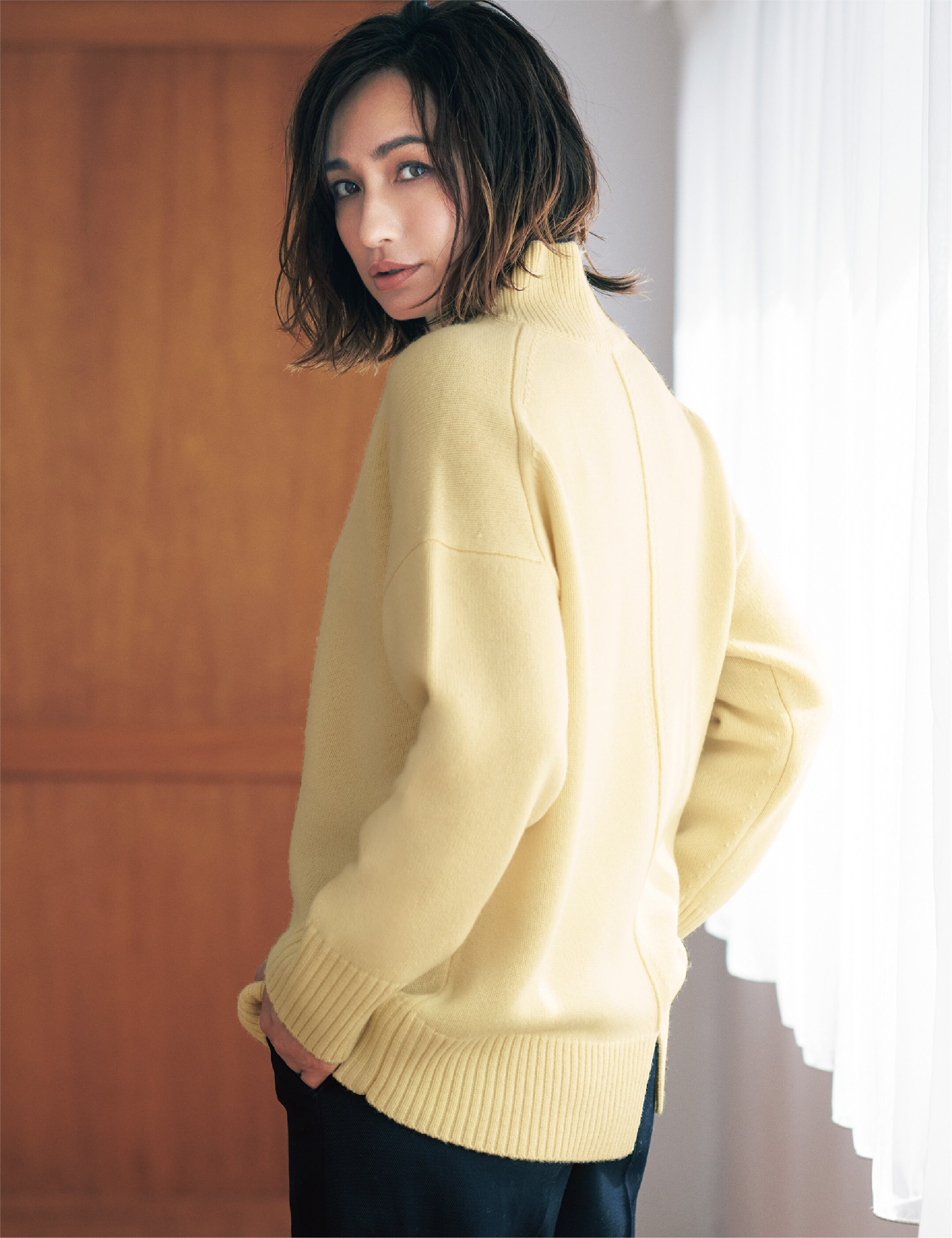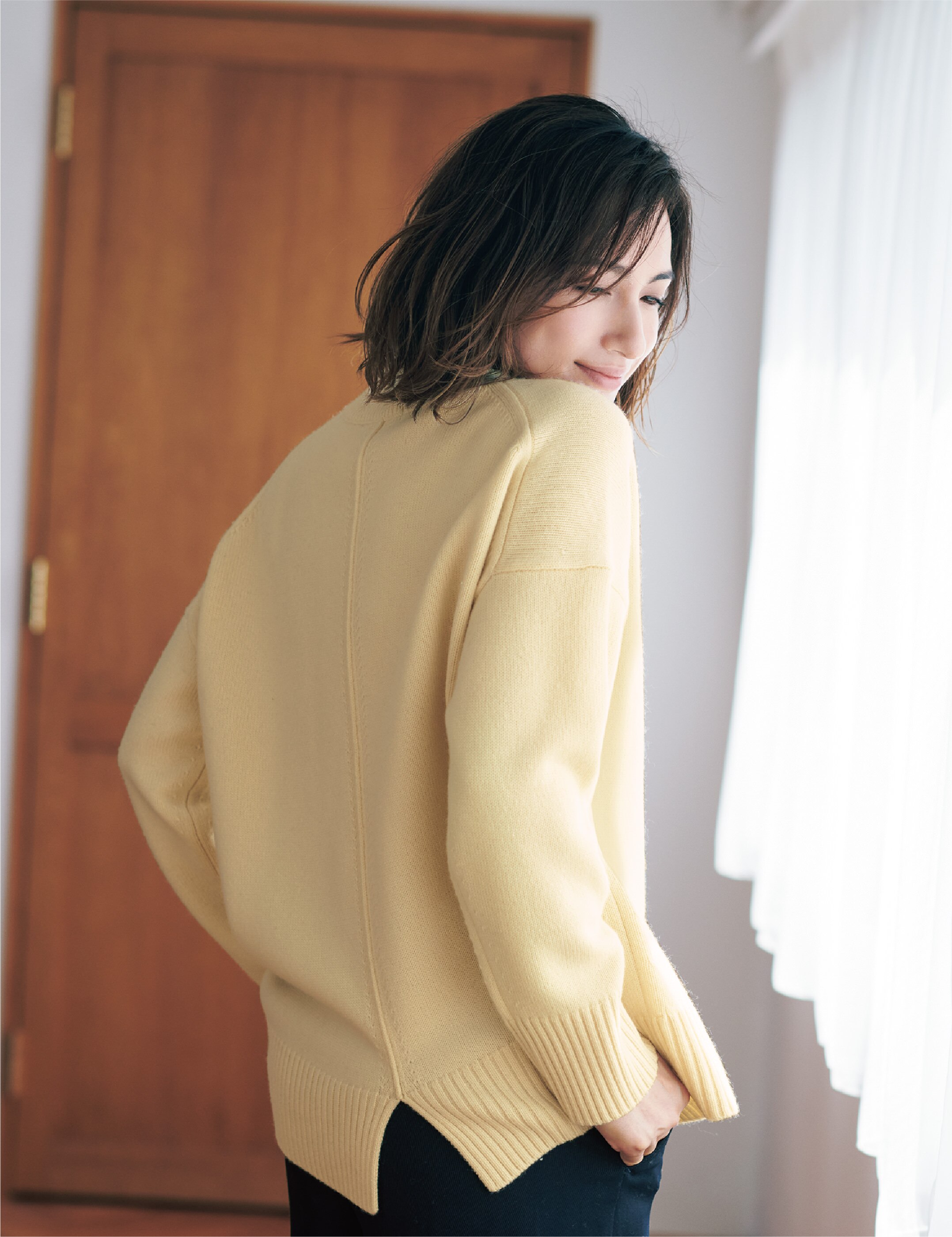 オリジナル素材を使ったカシミヤ混のミドルゲージニット。背中のタックの編み柄や裾スリットでバックスタイルにも表情が出るので、コートを脱いでも様になります。ゆったりしたシルエットや前後差のある丈感でレイヤードも楽しめ、コーデの幅も広がります。