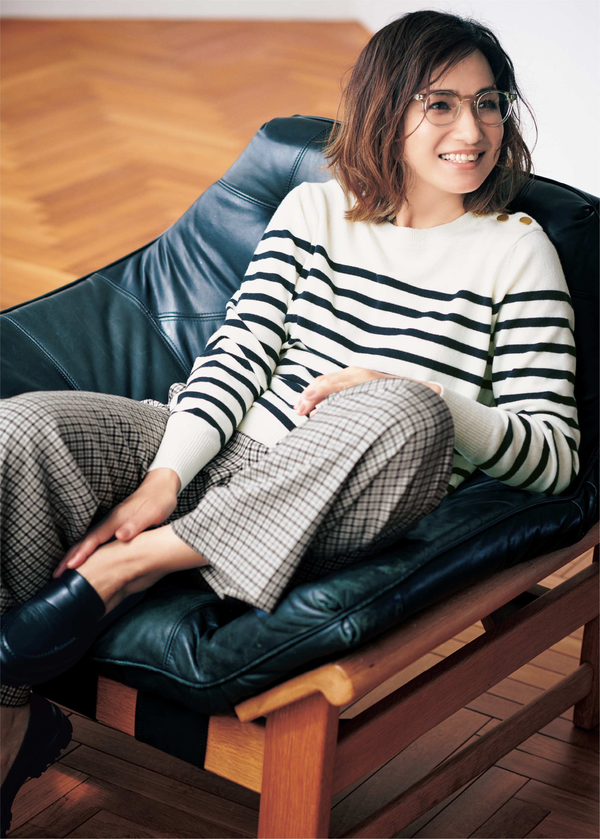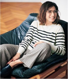 しなやかなウールの素材や肩に施された金ボタンで、ボーダーの持つカジュアルな雰囲気を品よく昇華。顔周りにラインのないパネルボーダーも、すっきり見えるポイントです。トレンドのチェックパンツを合わせれば、定番なボーダーの着こなしも一気に上級者に。