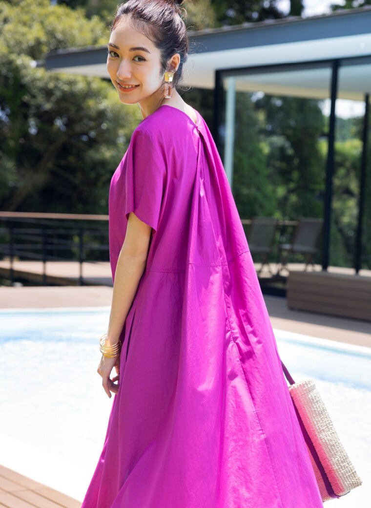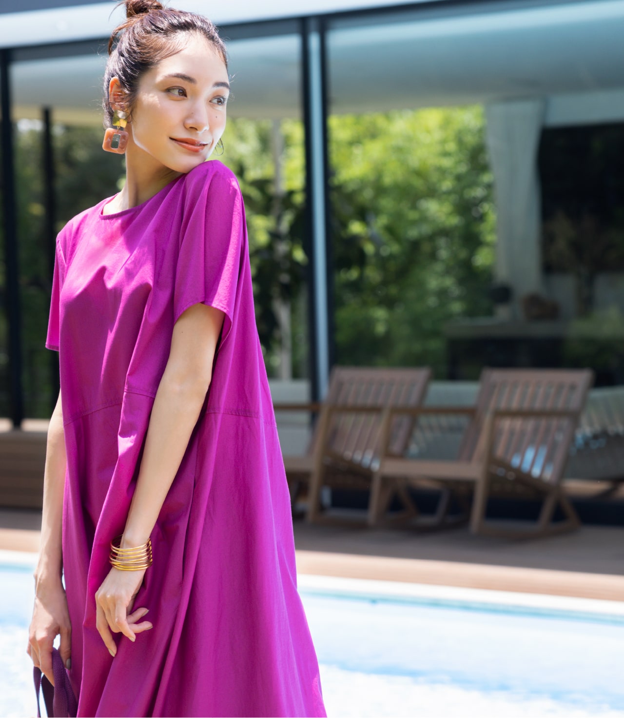 風が通り抜けるような心地よいドライな風合いと、発色の良さはナチュラル素材ならではの魅力。深みのあるパープルカラーがタウンでもビーチでも鮮やかに映える。やや高めのウエスト設定、二の腕が隠れるくらいの袖丈、絶妙な分量感を生み出す背中のタックデザインのおかげで、さらりとシンプルに着るだけでこなれた夏スタイルが完成。