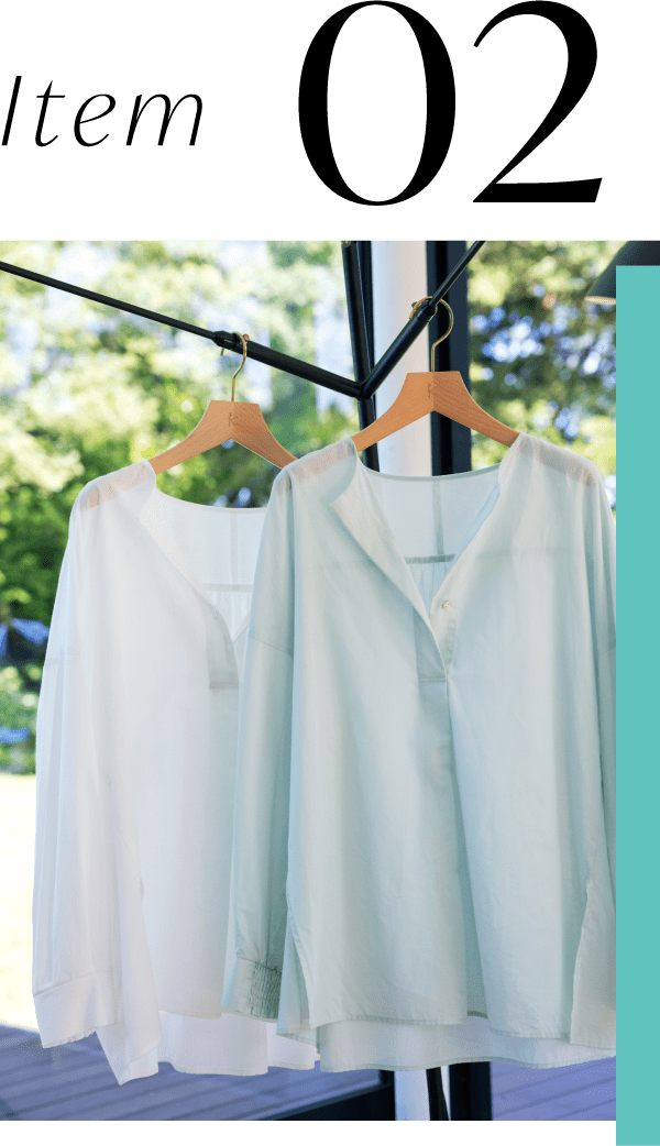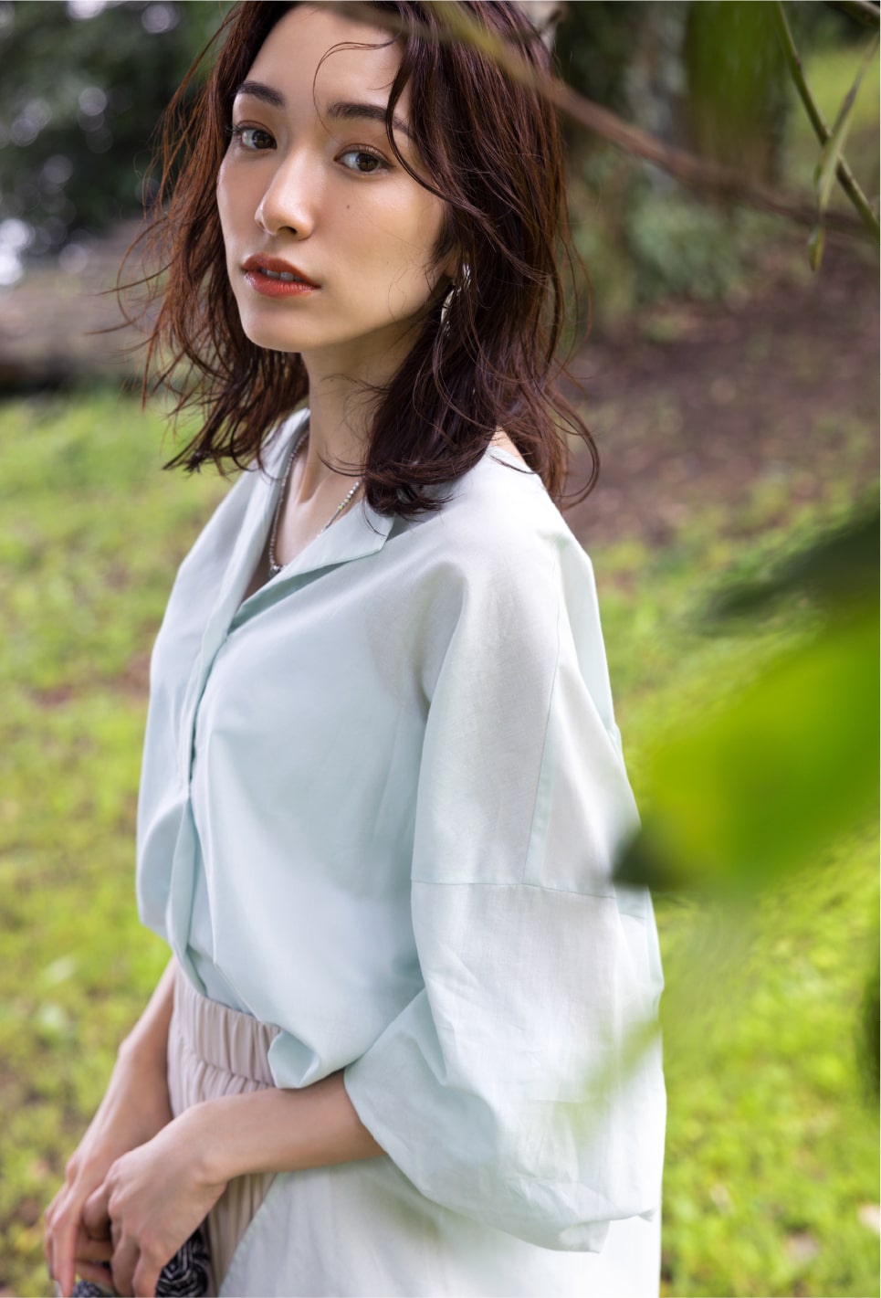 夏のリラクシースタイルにはナチュラル素材とカラーの力を借りて。質感のあるコットン・リネン素材のほどよい肌見せと透け感で、ヘルシーな色気を醸す。たくしあげた時の袖のボリューム感や、立体的でゆったりとしたフォルムで、抜け感ある着こなしに。シャーベットを思わせるひんやりとしたミントカラーで、見た目から涼やかに。