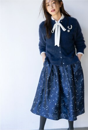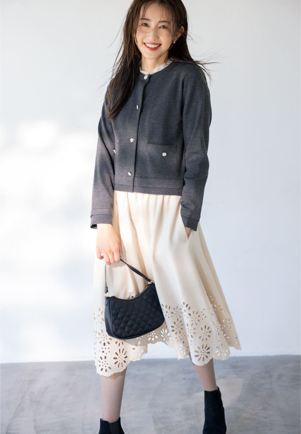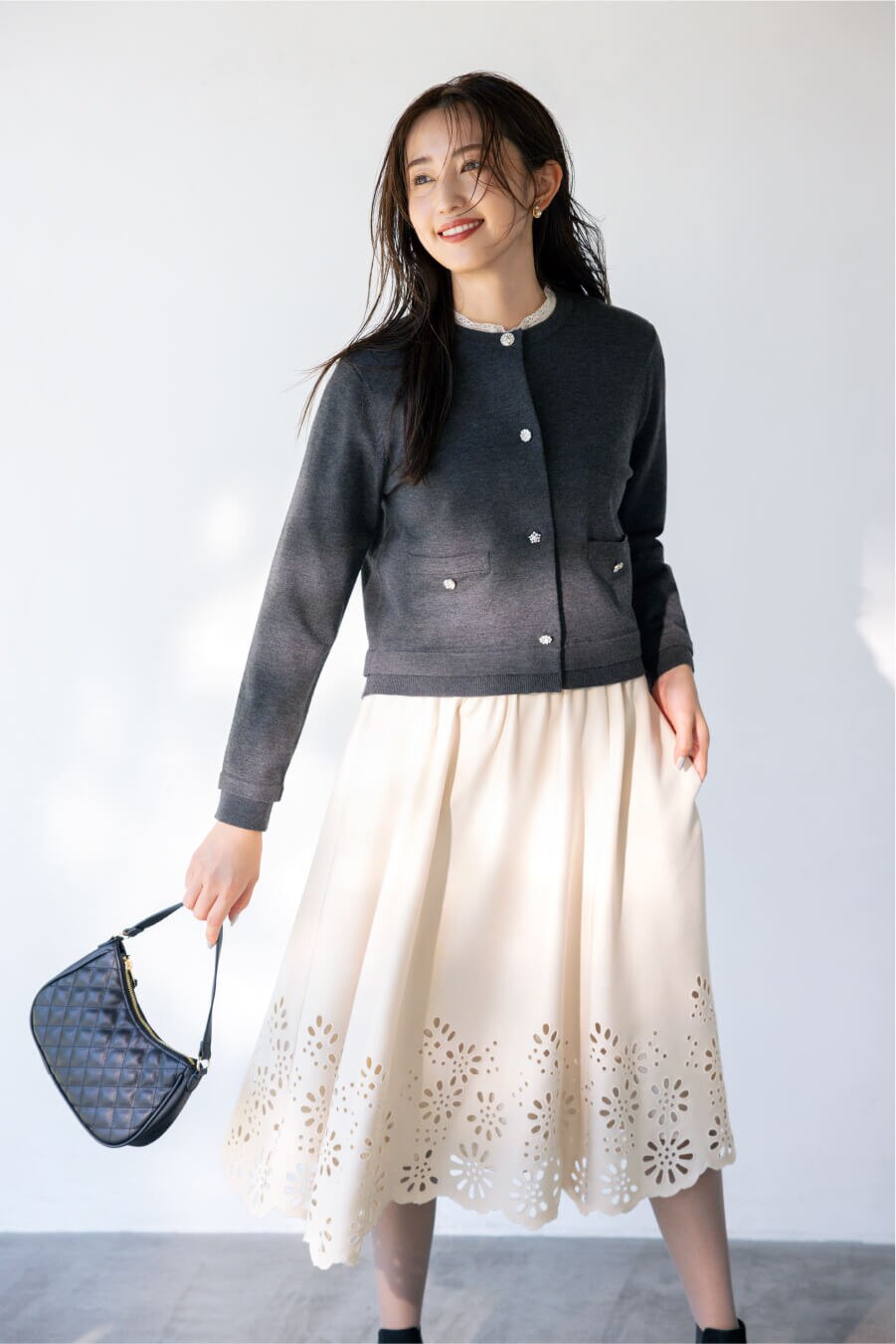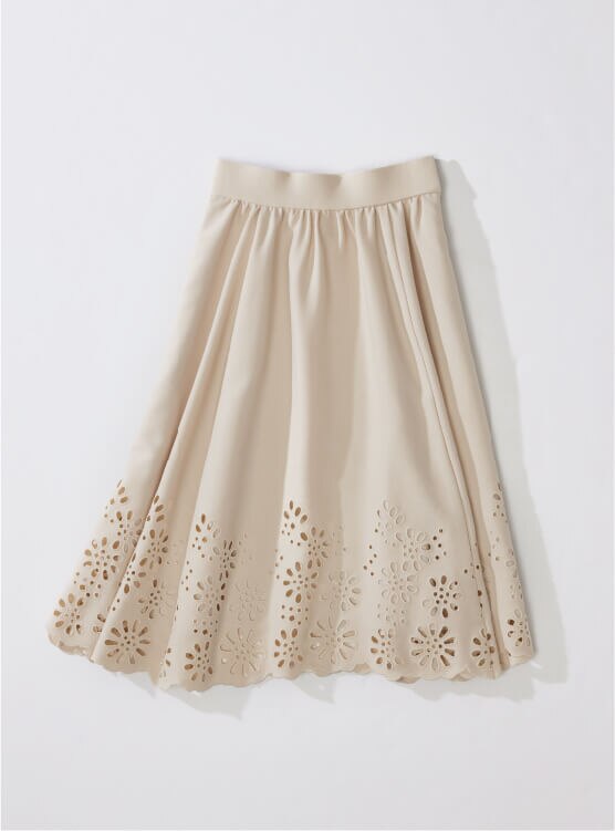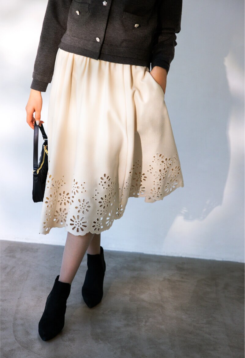 裾に大胆なアイレット刺繍を施したフレアスカートは、ギャザーやタックを入れることで歩くたびにふわりと揺れ、華やかなシルエットになるよう仕上げました。ウールライクな素材はふくらみとウォーム感があり、冬にぴったり。まろやかで優しげなカラーやデザインで女性らしさをとことん堪能できるスカートです。