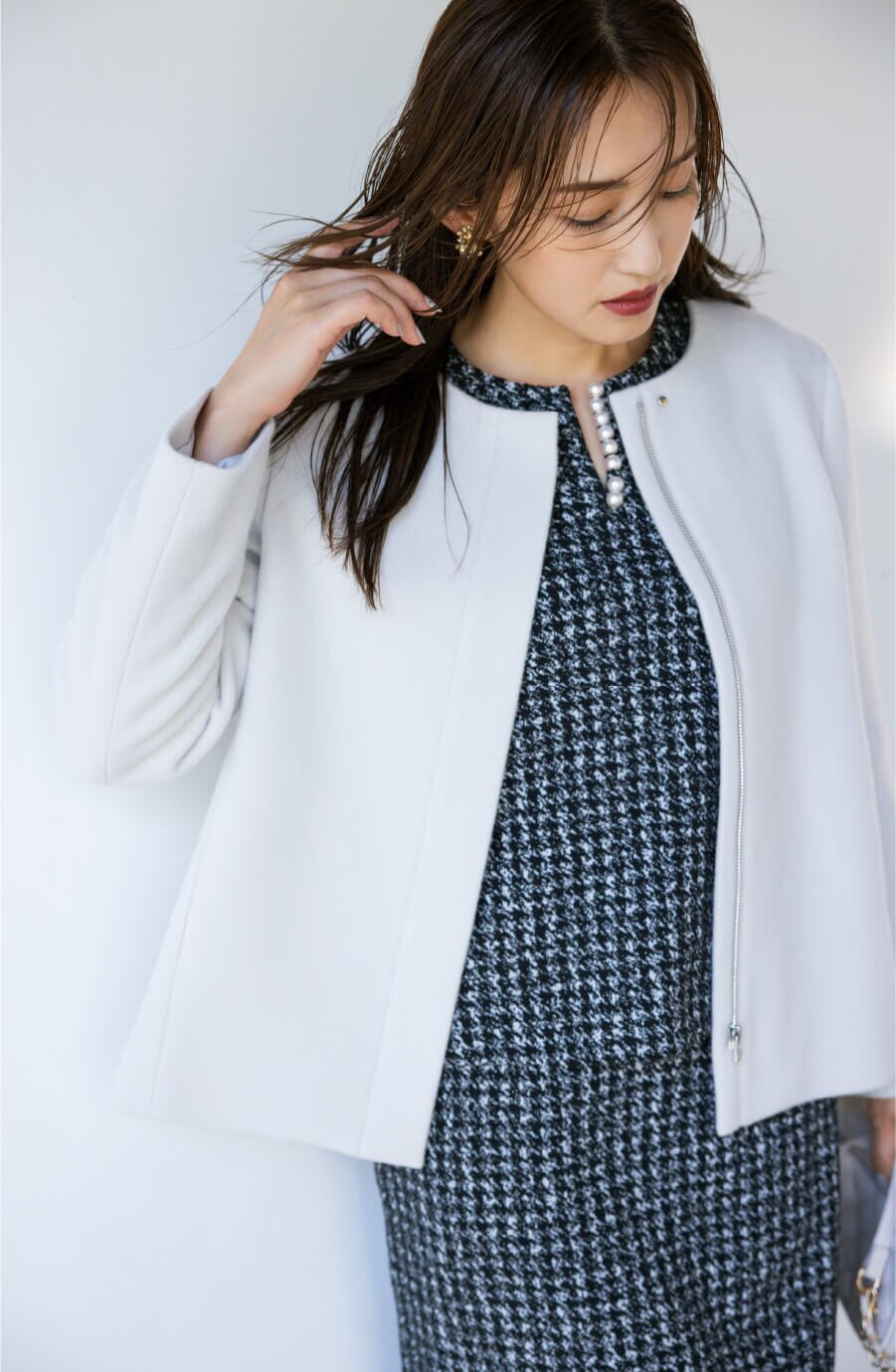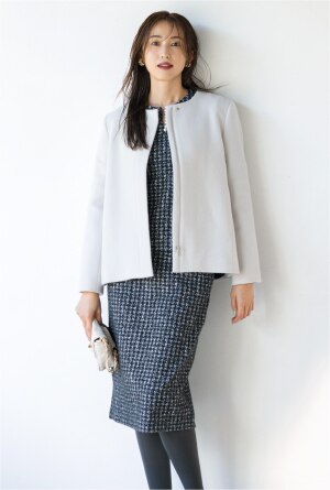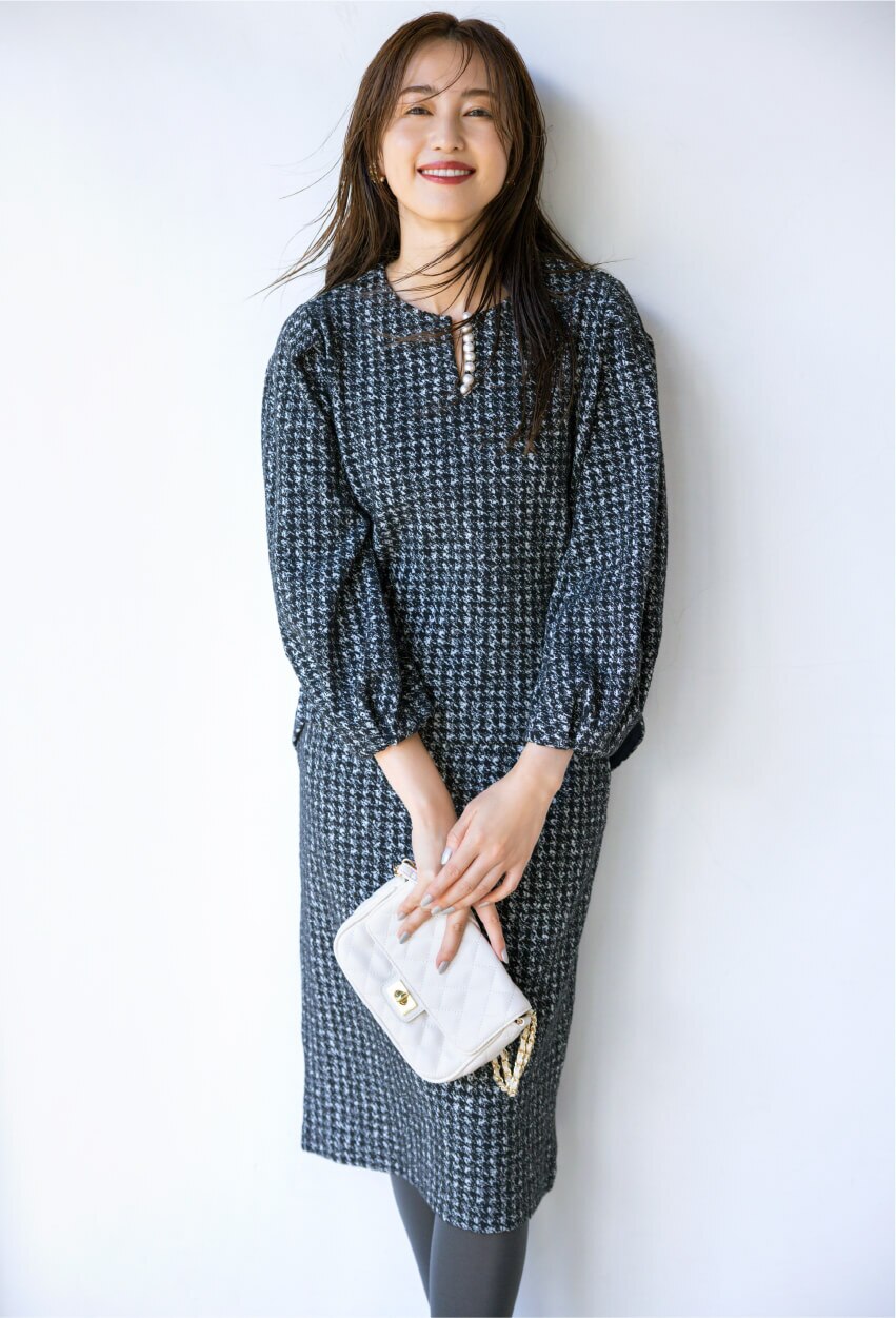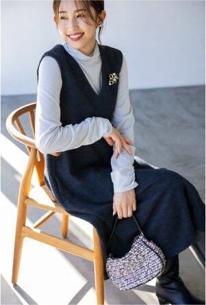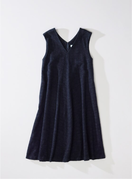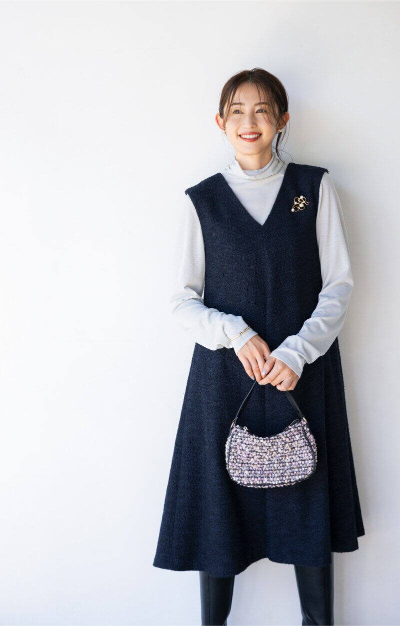 毎シーズン人気を博しているジャンパースカートはツイードならではの品の良さと表情感がポイント。ほどよいⅤネックとゆるやかなフィット&フレアデザインが美シルエットを際立たせ、大人の体をすっきり見せてくれる。ニットやブラウスなどインナー次第で幅広いスタイリングが楽しめるのもジャンスカならでは。