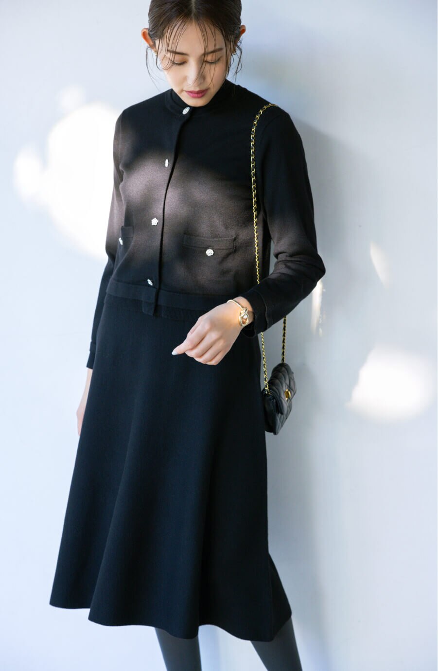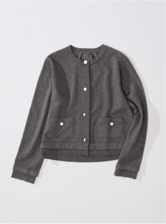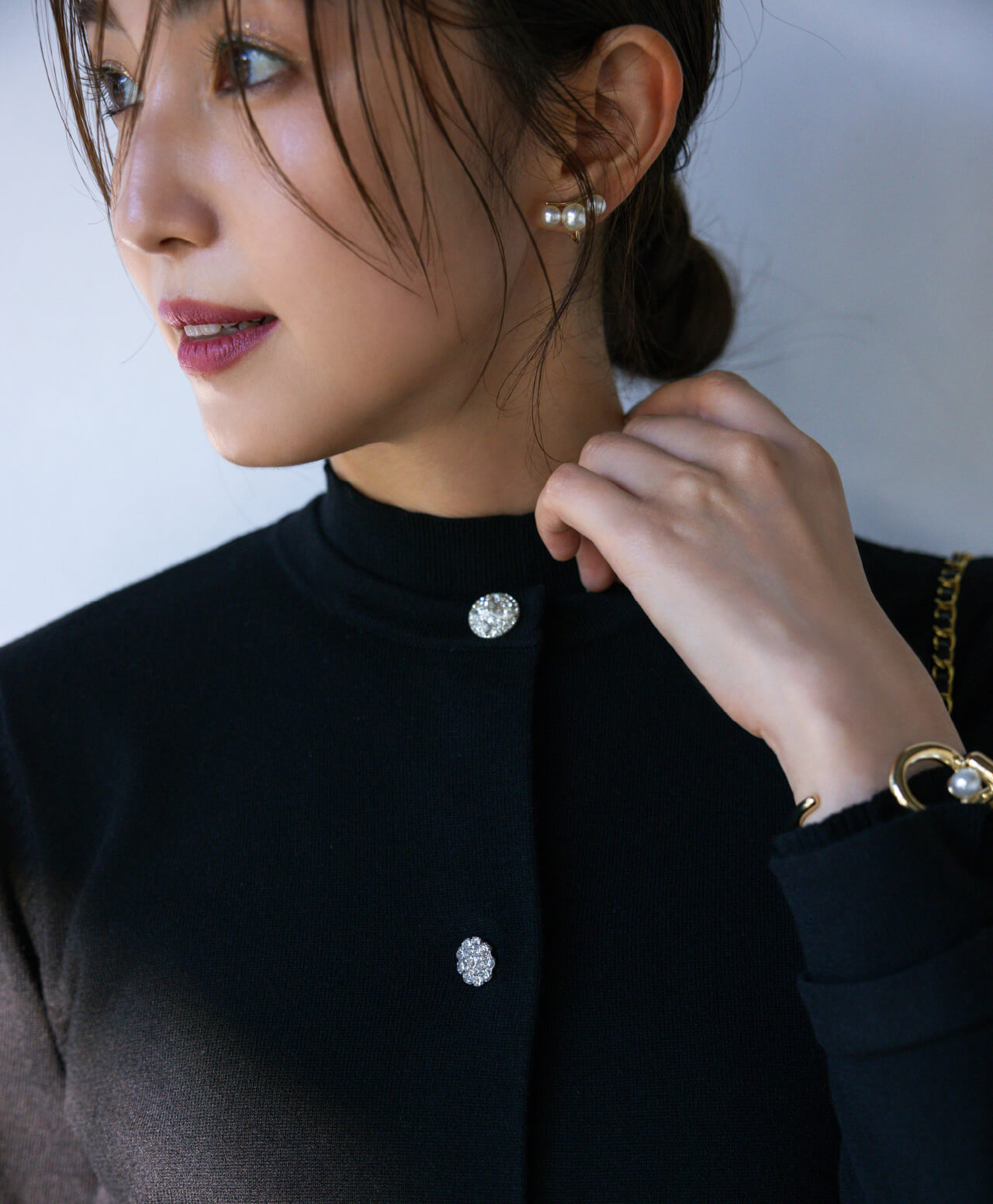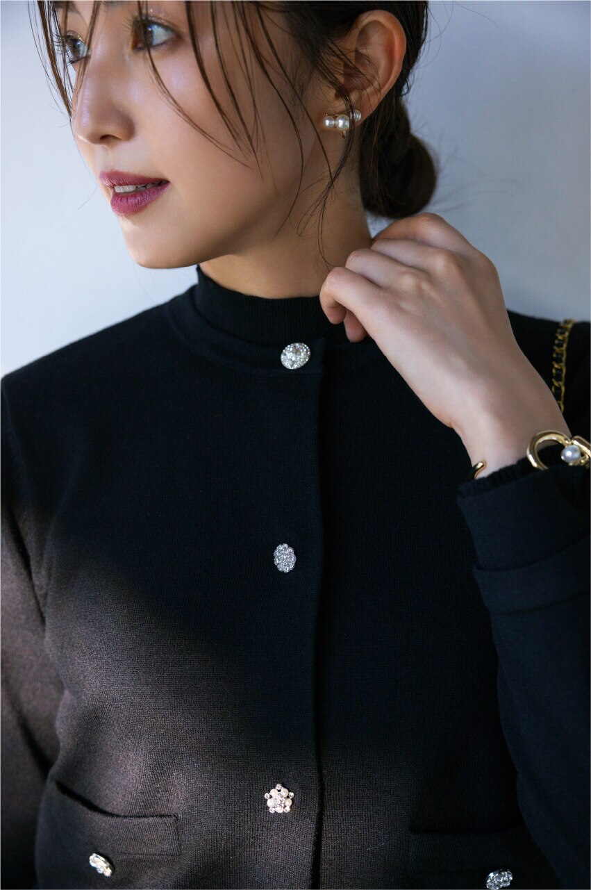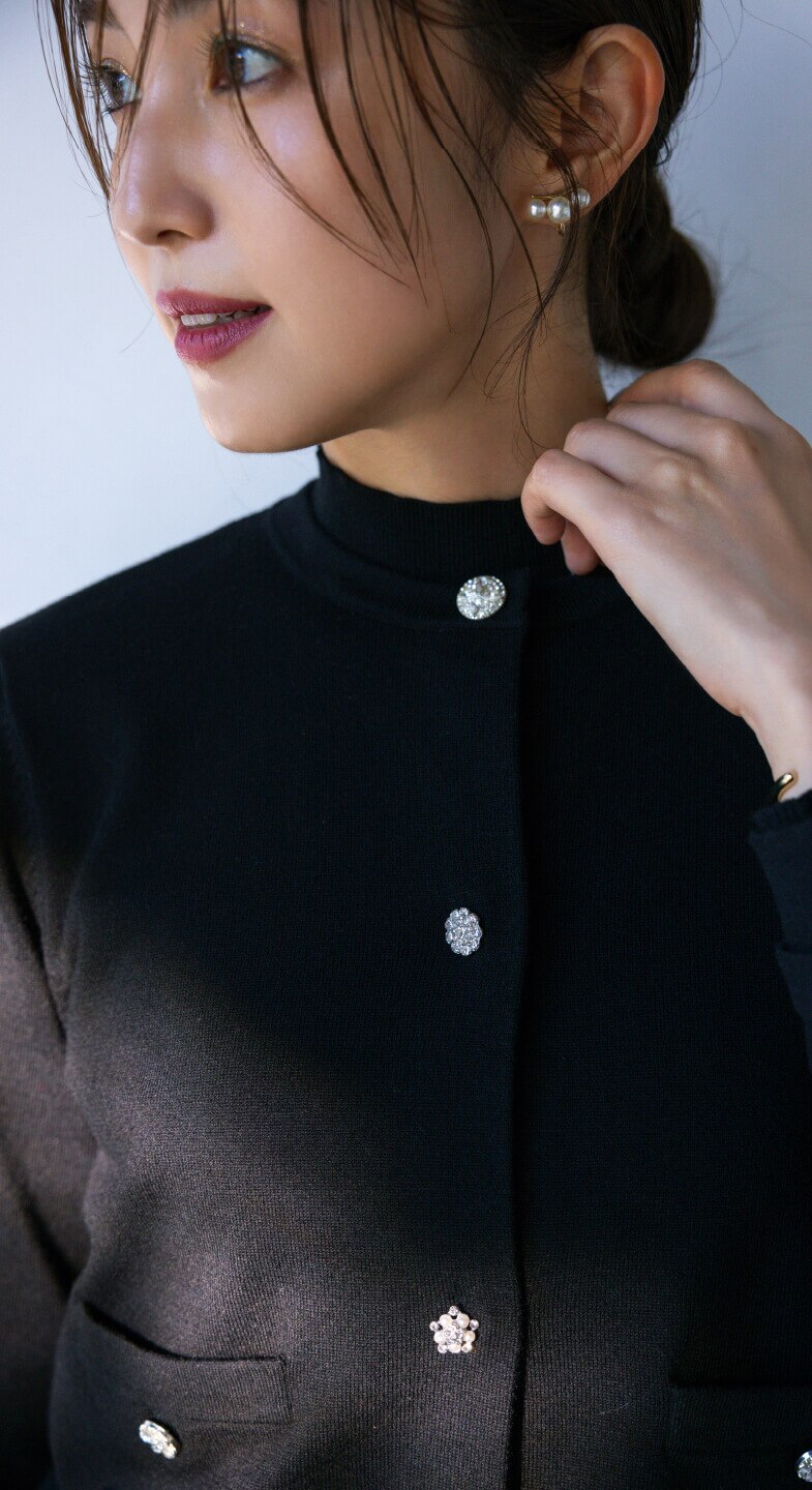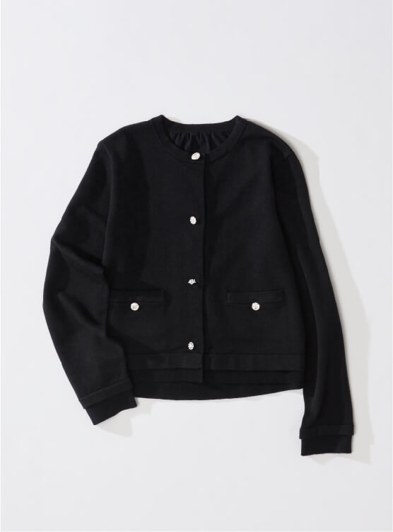 異なるデザインのビジューボタンが美しくあしらわれたカーディガンは主役級の華やかさ。ノーカラージャケット風の上品なデザインはボトムやインナーを選ばず、シーンレスに使いやすい。ニットの着心地の良さとジャケットのきちんと感どちらも楽しめる一枚に仕上げました。同素材のニットスカートとのセット着用もおすすめ。