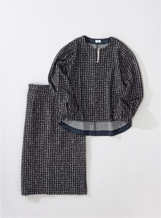 お出かけにも通勤にも、この時期大活躍するのがきれい見えセットアップ。立体的な袖デザインや胸元のパール使いで一枚で着映えるトップスと、お腹周りをすっきり見せてくれる使い勝手の良いナロースカートがセットになったアイテムです。伸縮性のある素材でシワにもなりにくく旅先でのドレスアップにも最適。