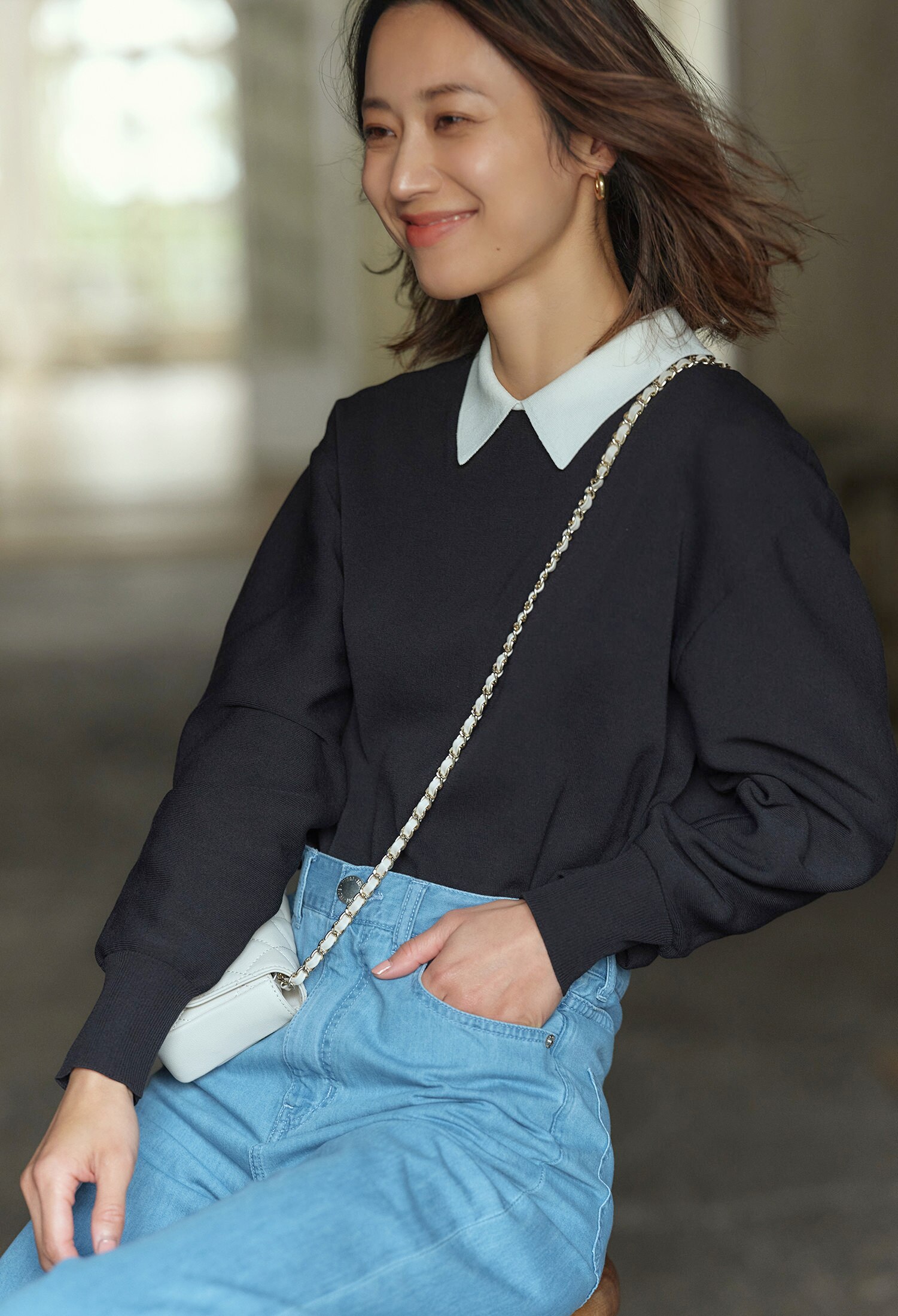 無難なモノトーンで終わらせない、春色カラーのニットを肩掛けにしてアクセントを。