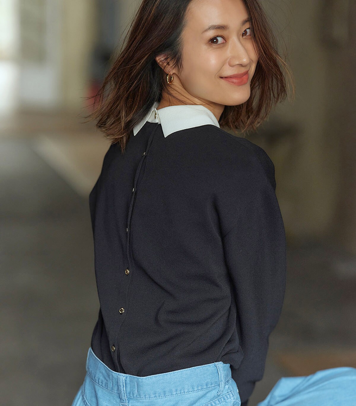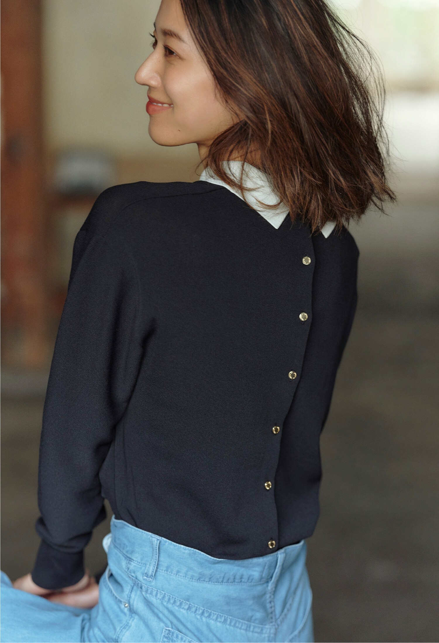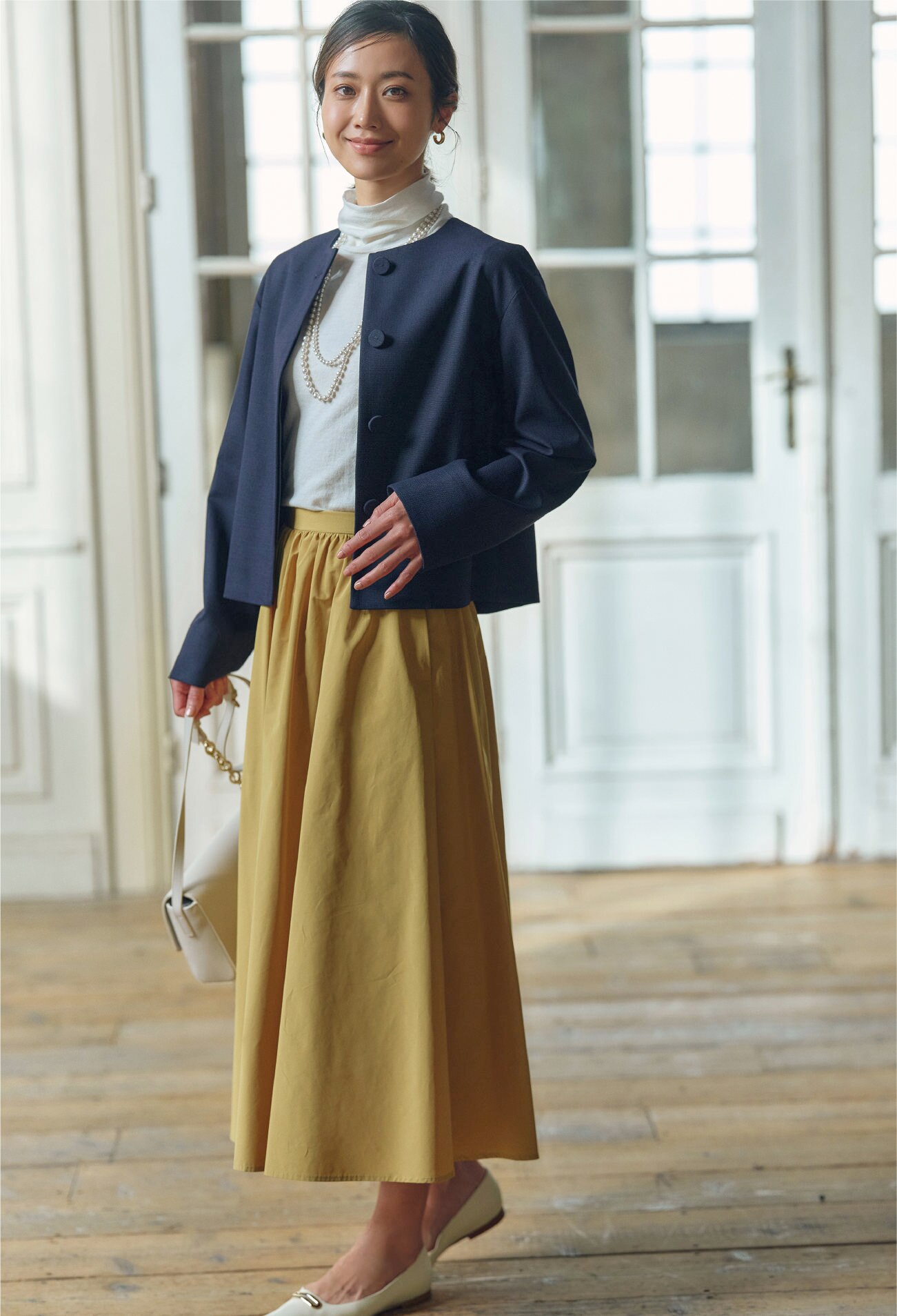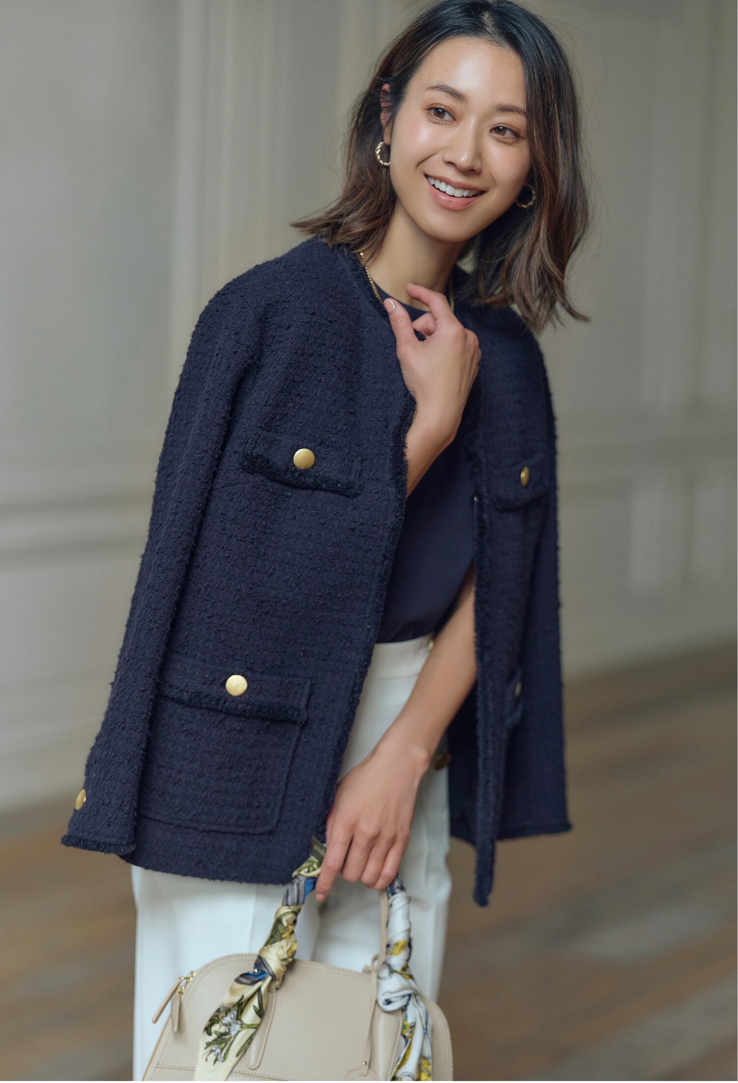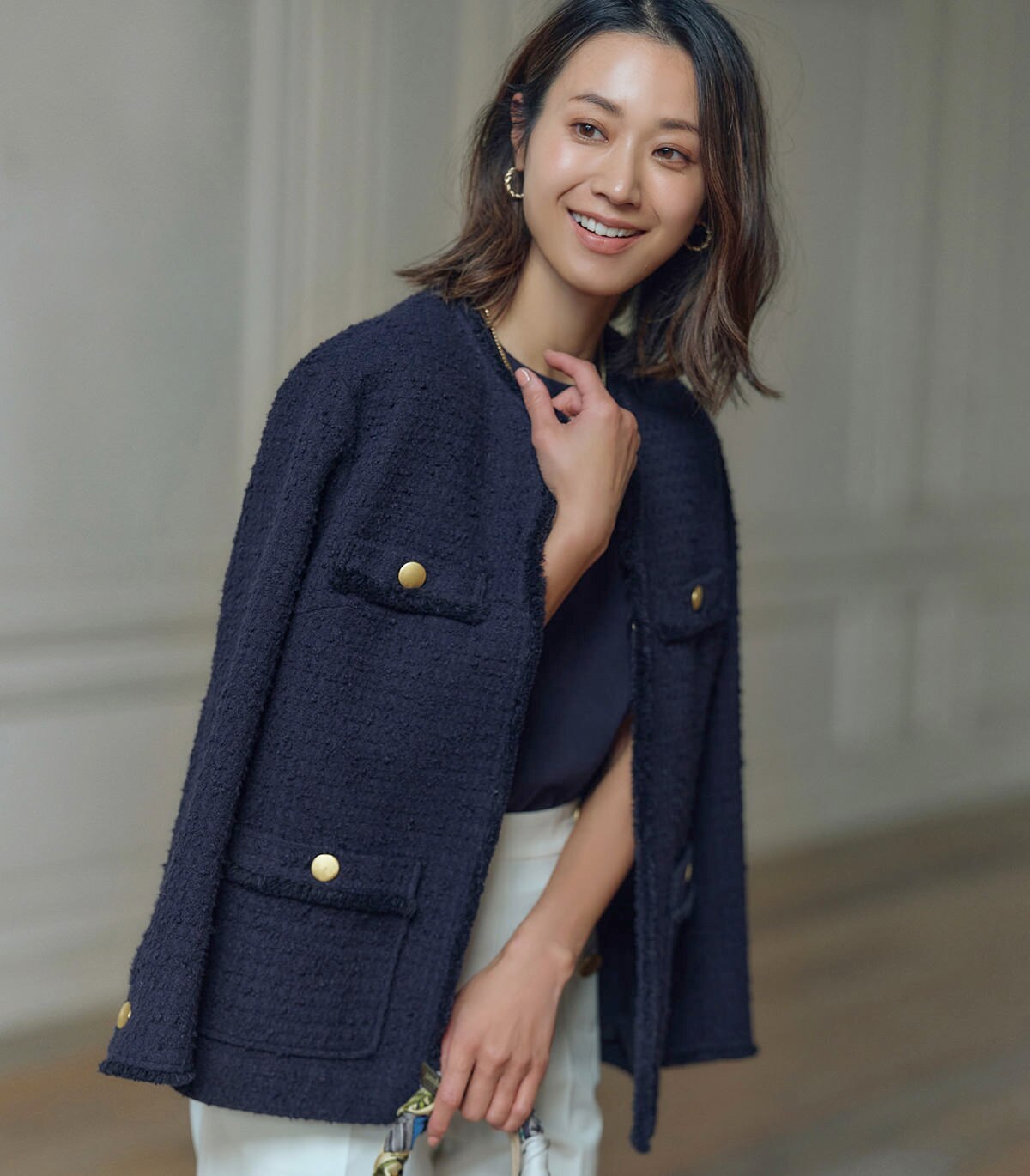 アイテムの持つ上品さに、ややゆったりとしたシルエットとメタルボタンが程よいカジュアルさをプラス。