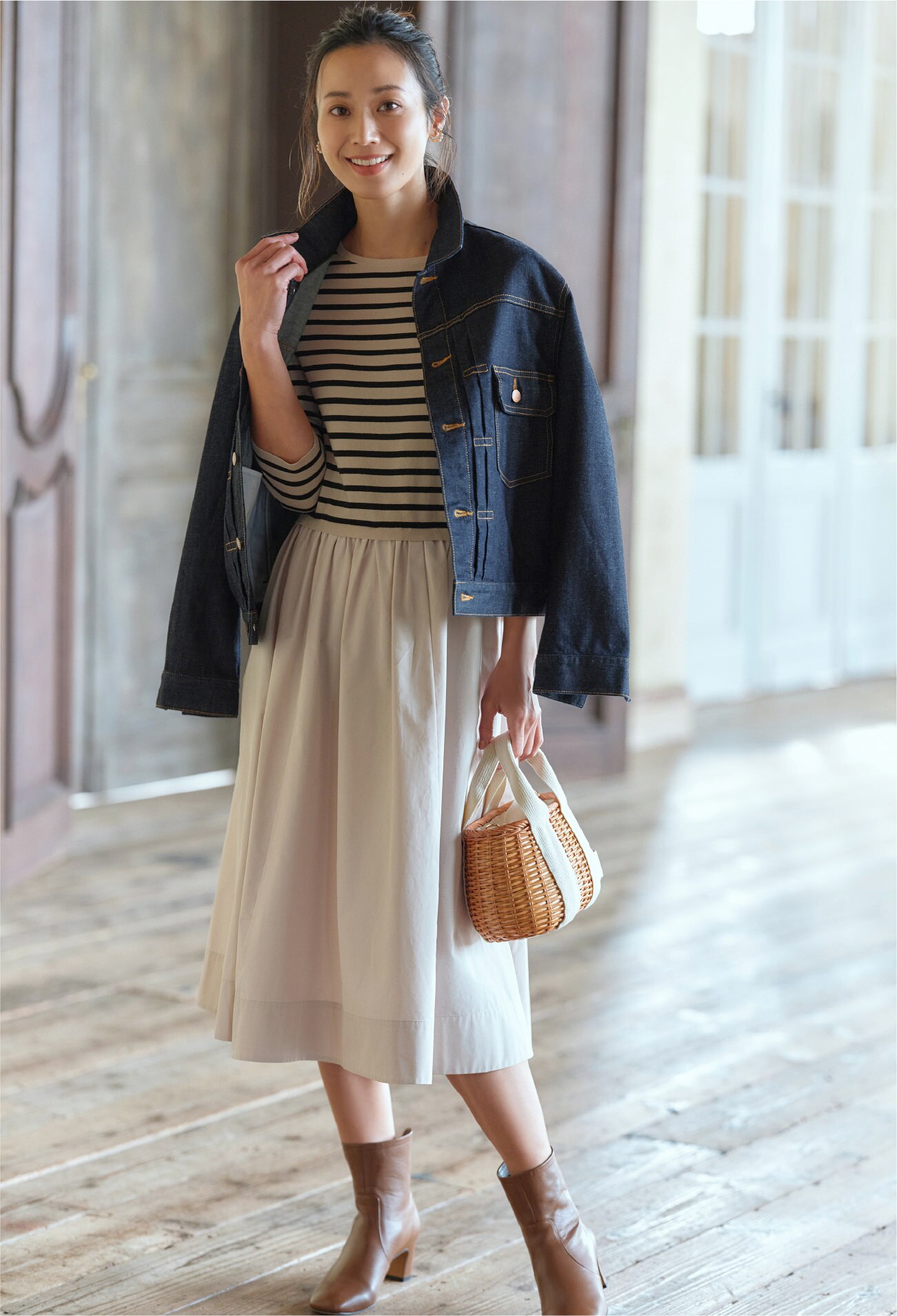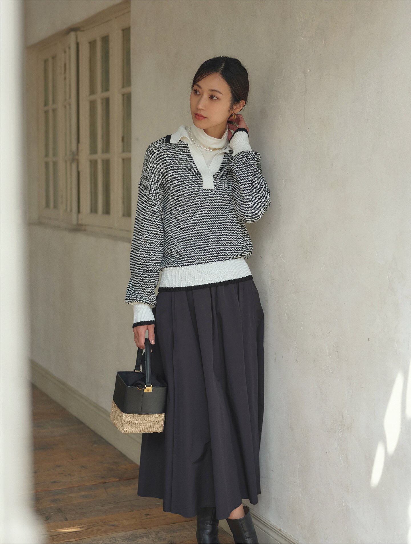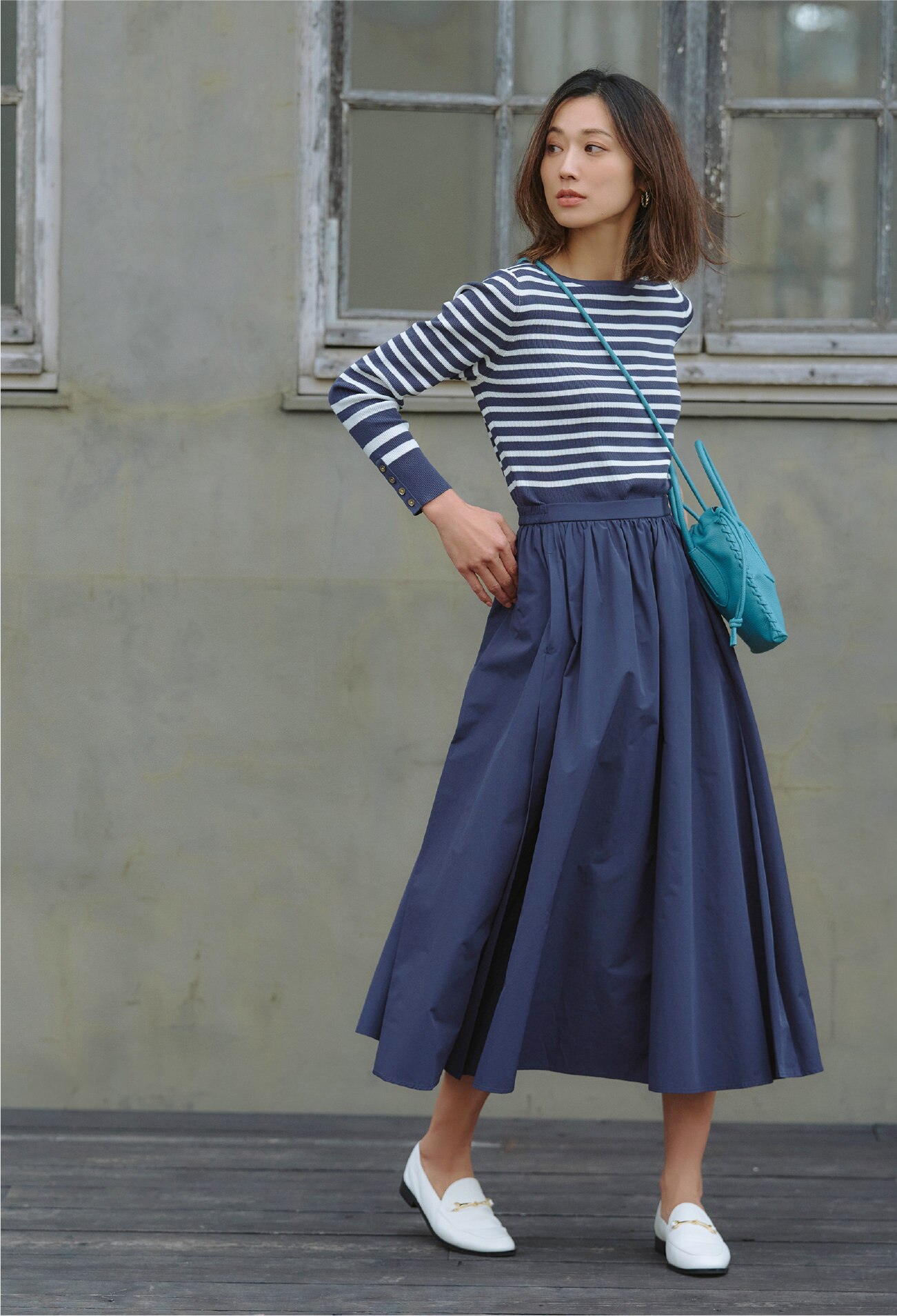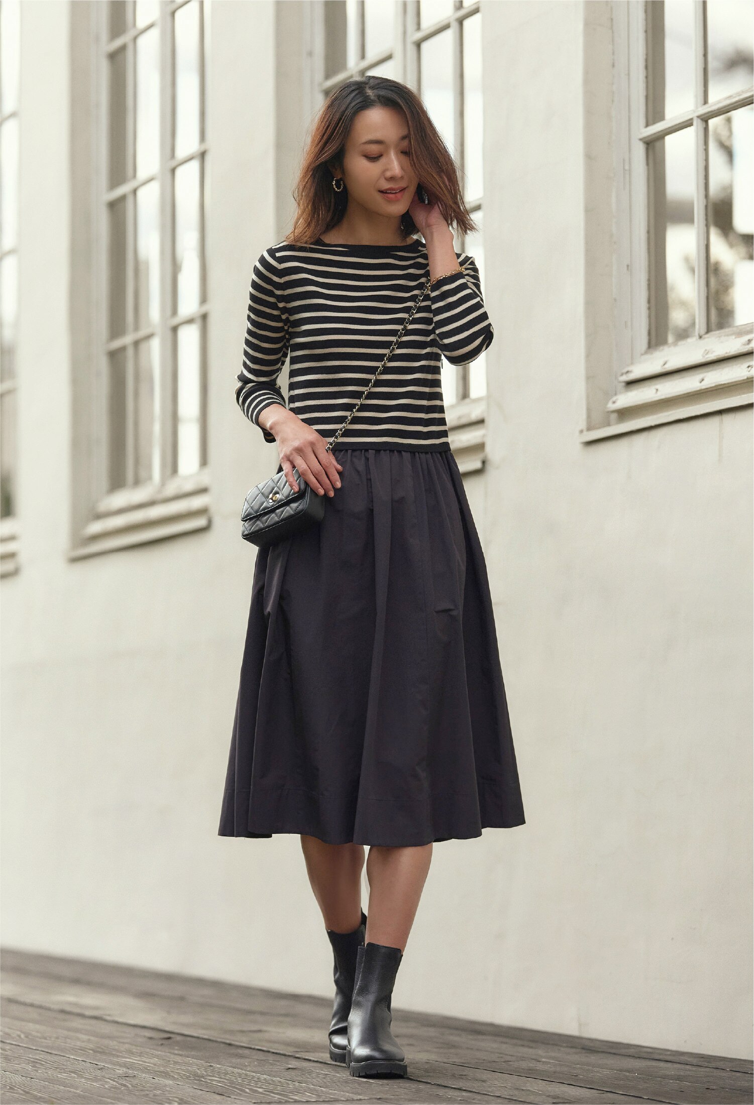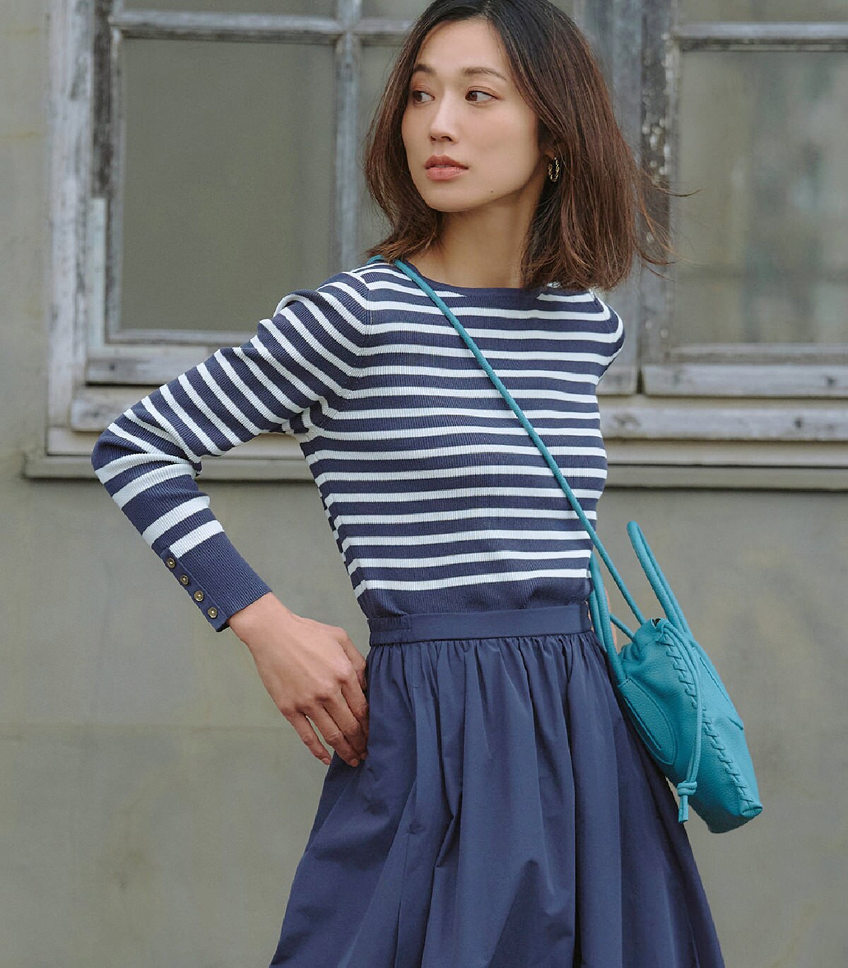異なるボーダーピッチや袖もとのボタンが目を引く春ニットは同色系のスカートと合わせてワンピ風に着こなしてみる。
