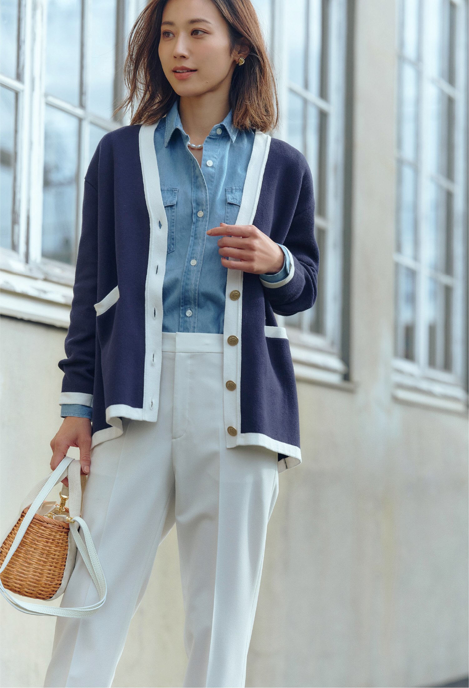 大胆な配色使いのマリン調カーディガンは一枚あればすぐに春顔になれる存在。