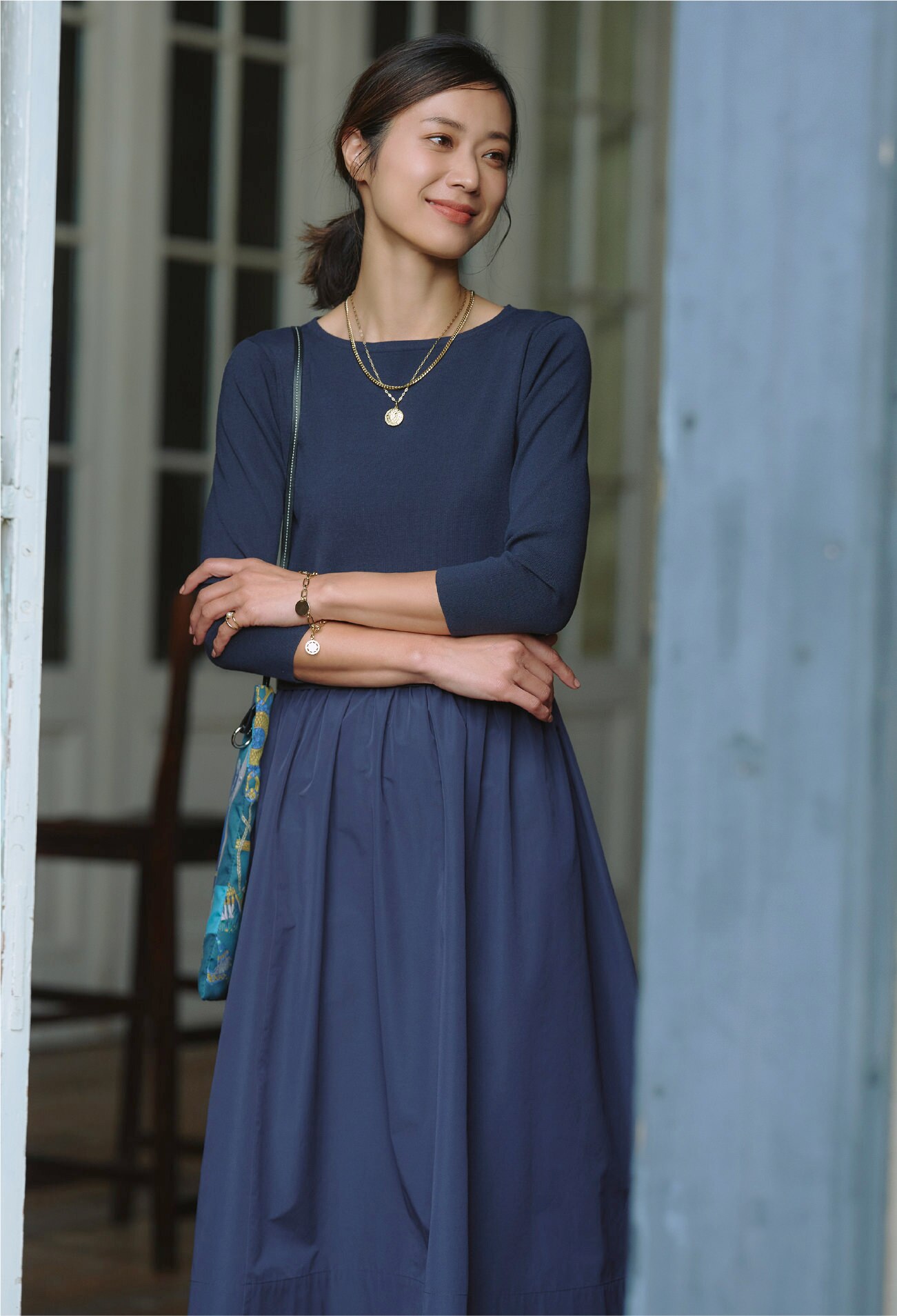 合わせるもの次第でカジュアルにもキレイ目にもなれるネイビーのワンピースは大人女子に欠かせない。