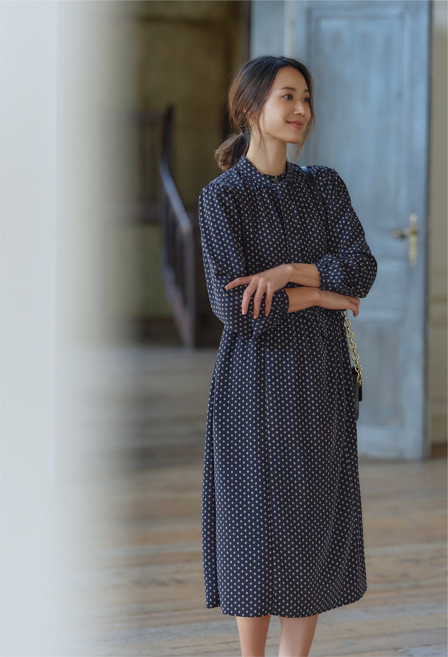 繊細なプリーツスカートが美しく、袖口についたパール釦がアクセントに。