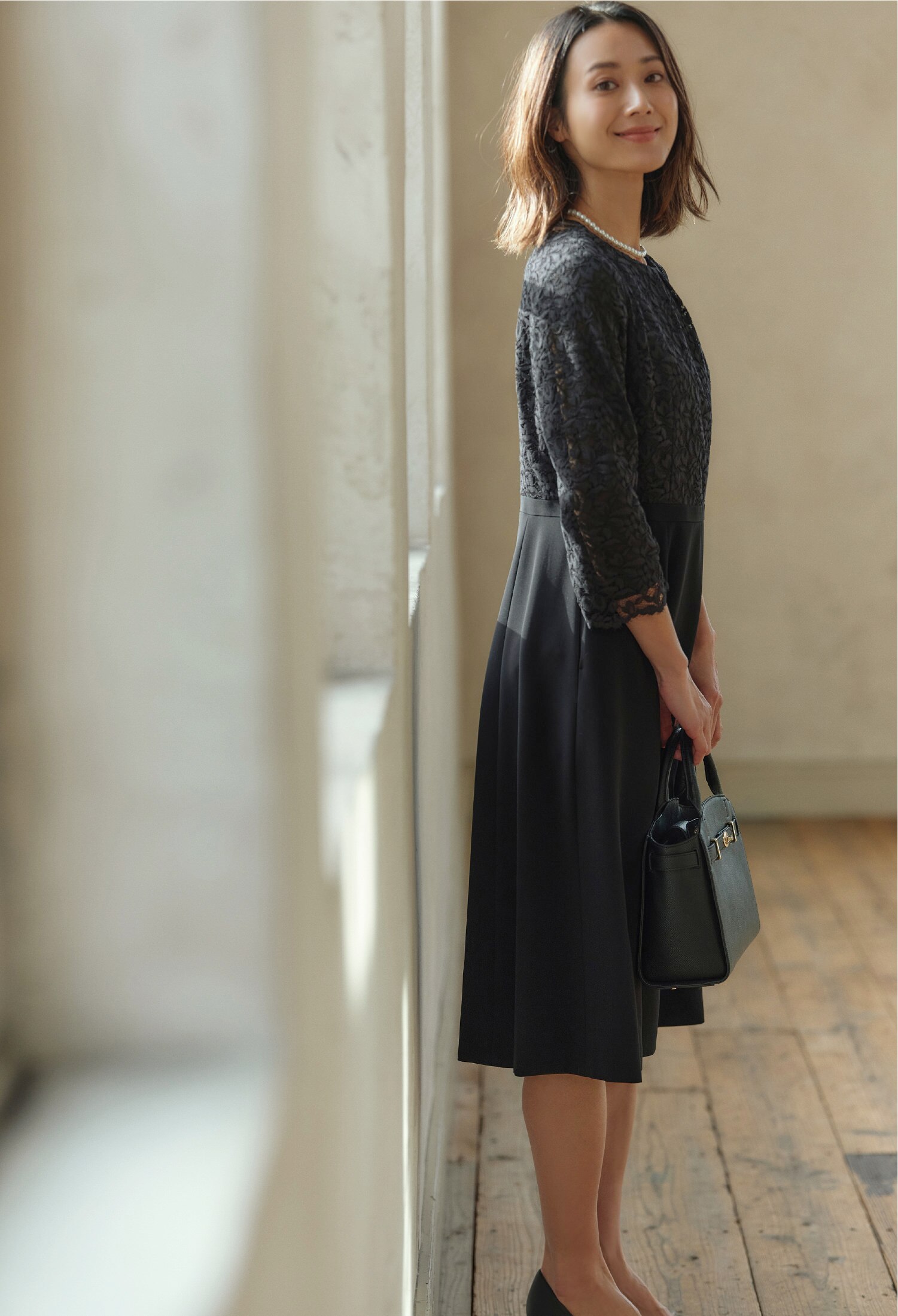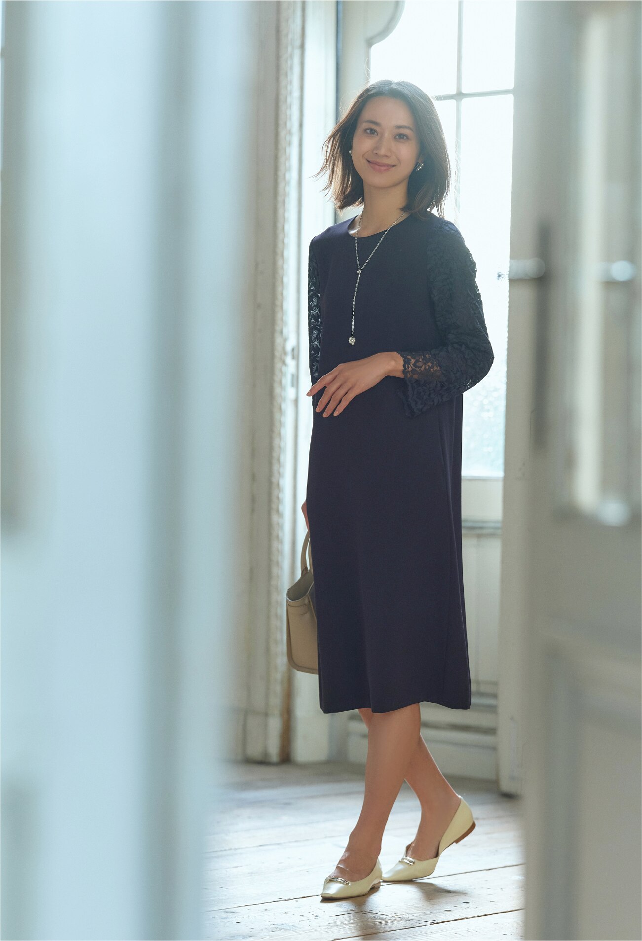 セレモニーシーンに活躍してくれる袖のレース使いが大人の上品さを醸し出すサック型のドレス。