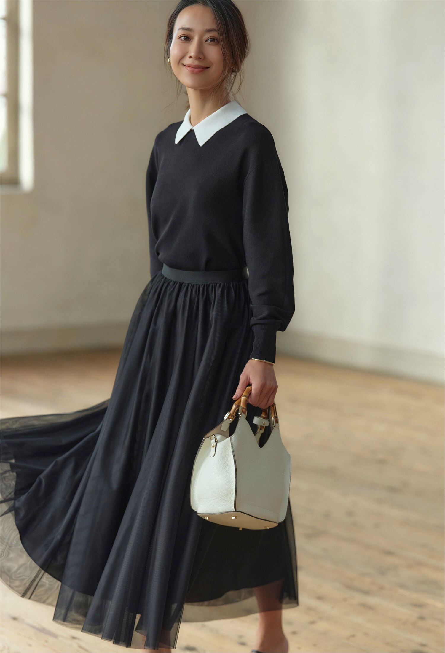 襟付きニット×チュールスカートはどちらも大人の甘さを最大限引き出す今っぽアイテム。
