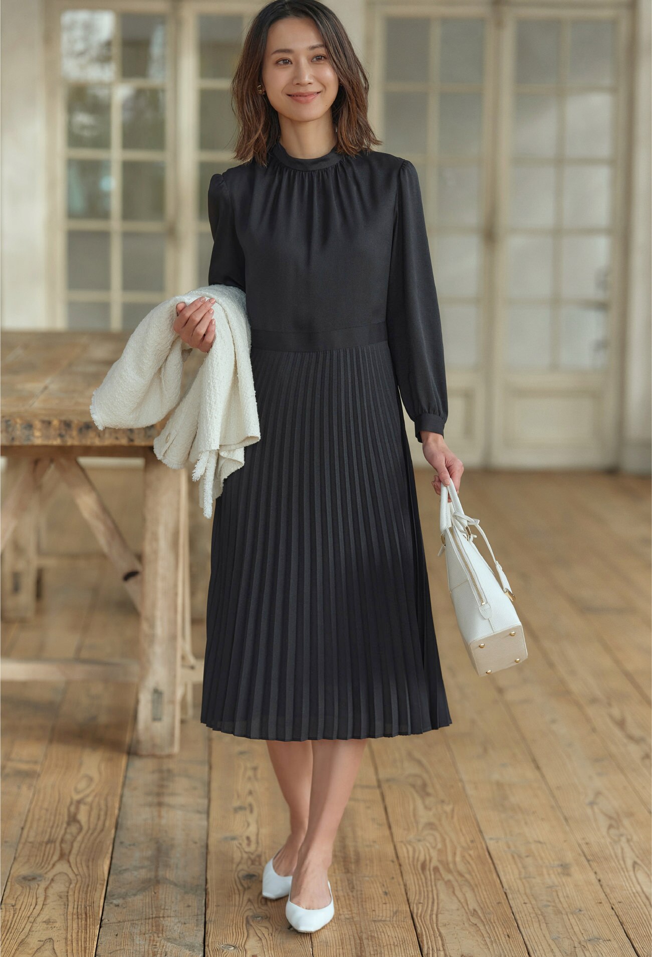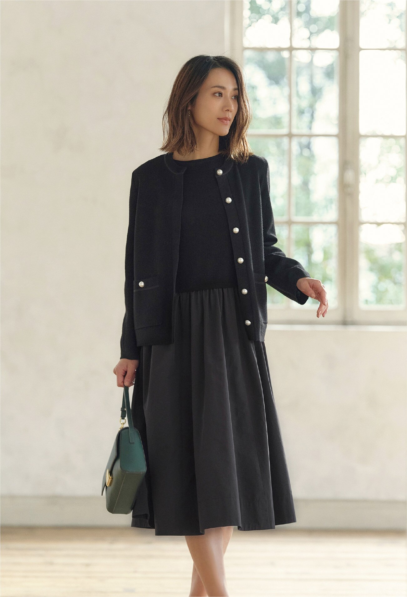 冬はこの上からコートを羽織り、春先はカーデをアウター替わりにでき、カーデは開閉可能なため印象チェンジもお手のもの。