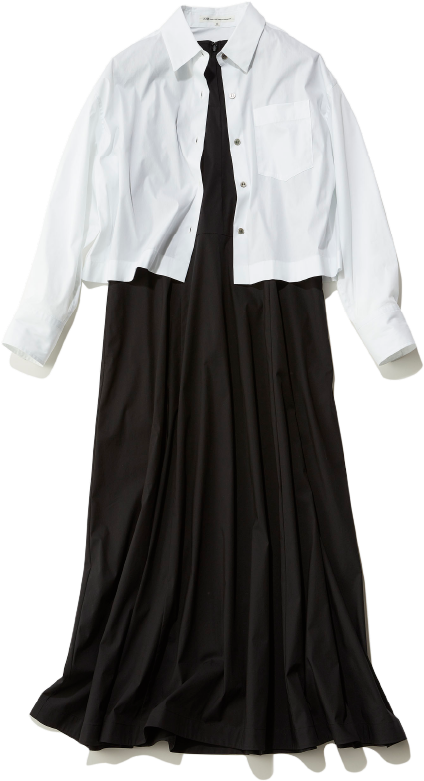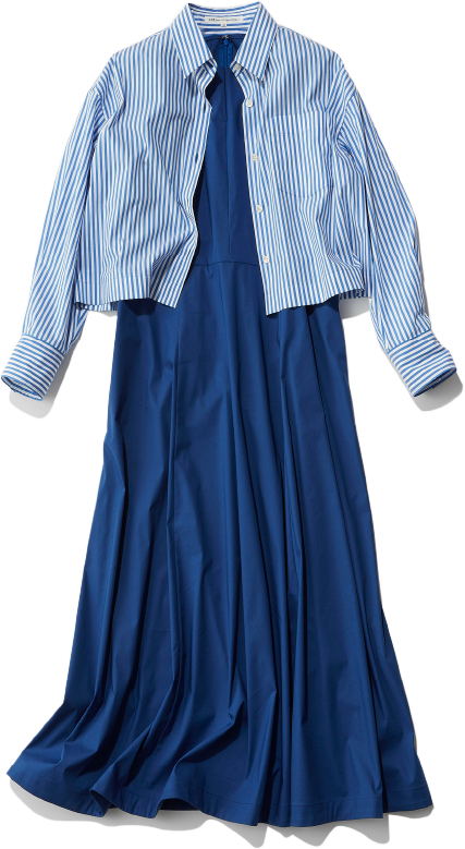 それだけでサマになるブルーワンピ、クロップドシャツを羽織れば都会に似合うモダンなルックスに。シャツはコンパクトなシルエットながらストレッチが利いていてストレスフリーな着心地。