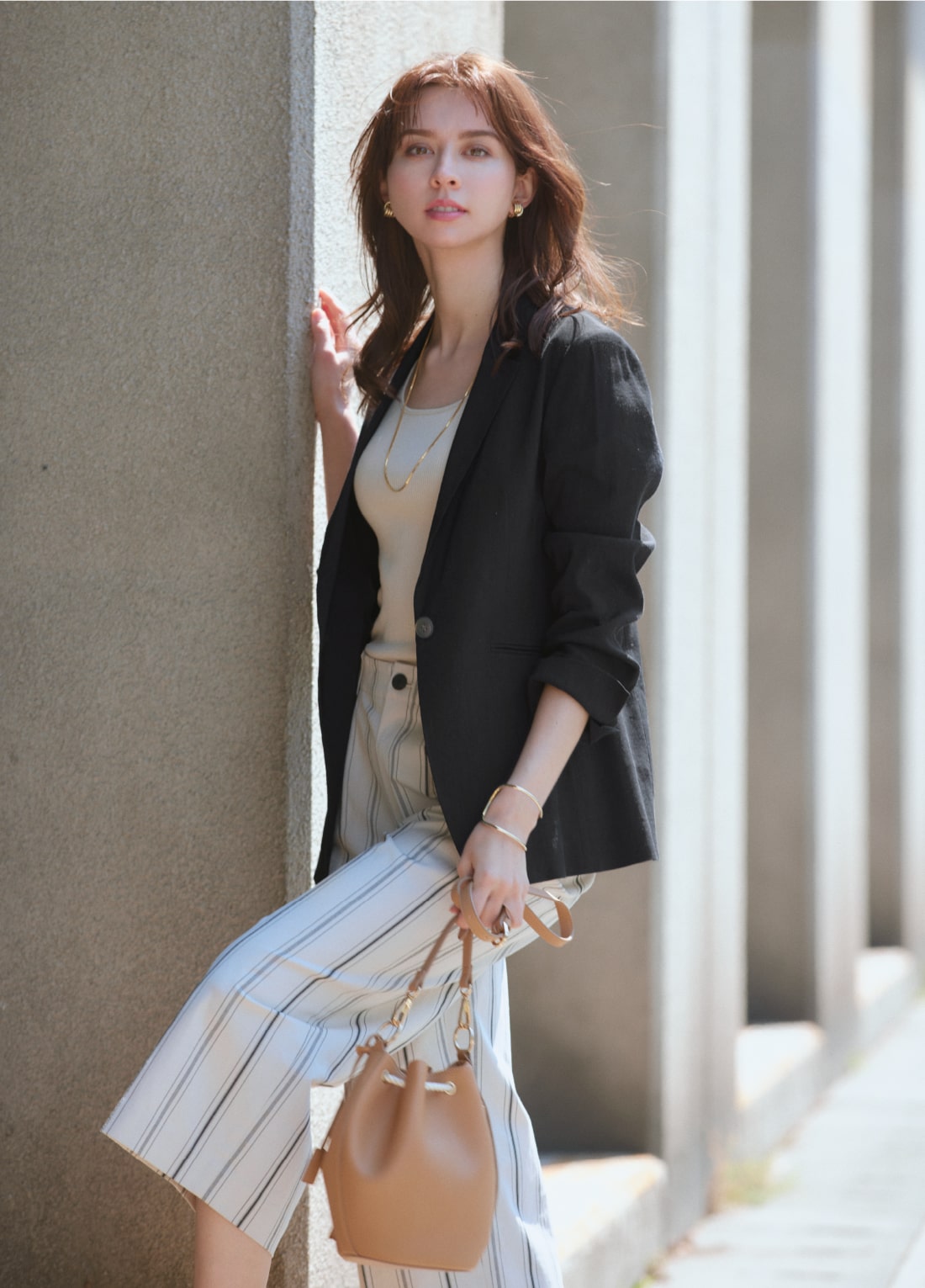 麻混のマリンパンツとロゴTシャツをコーディネートし、ノーカラージャケットをとことん自分らしく着こなす。