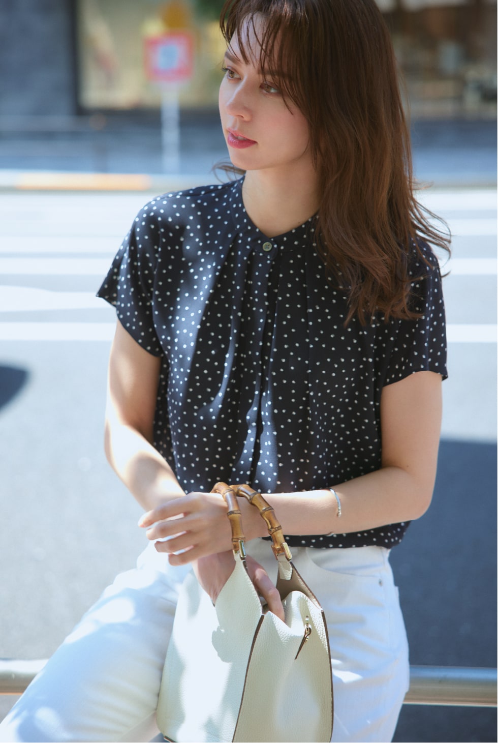 好印象なネイビー地のドットプリントとホワイトデニムで、誰にでも好かれる美人コーディネートに。