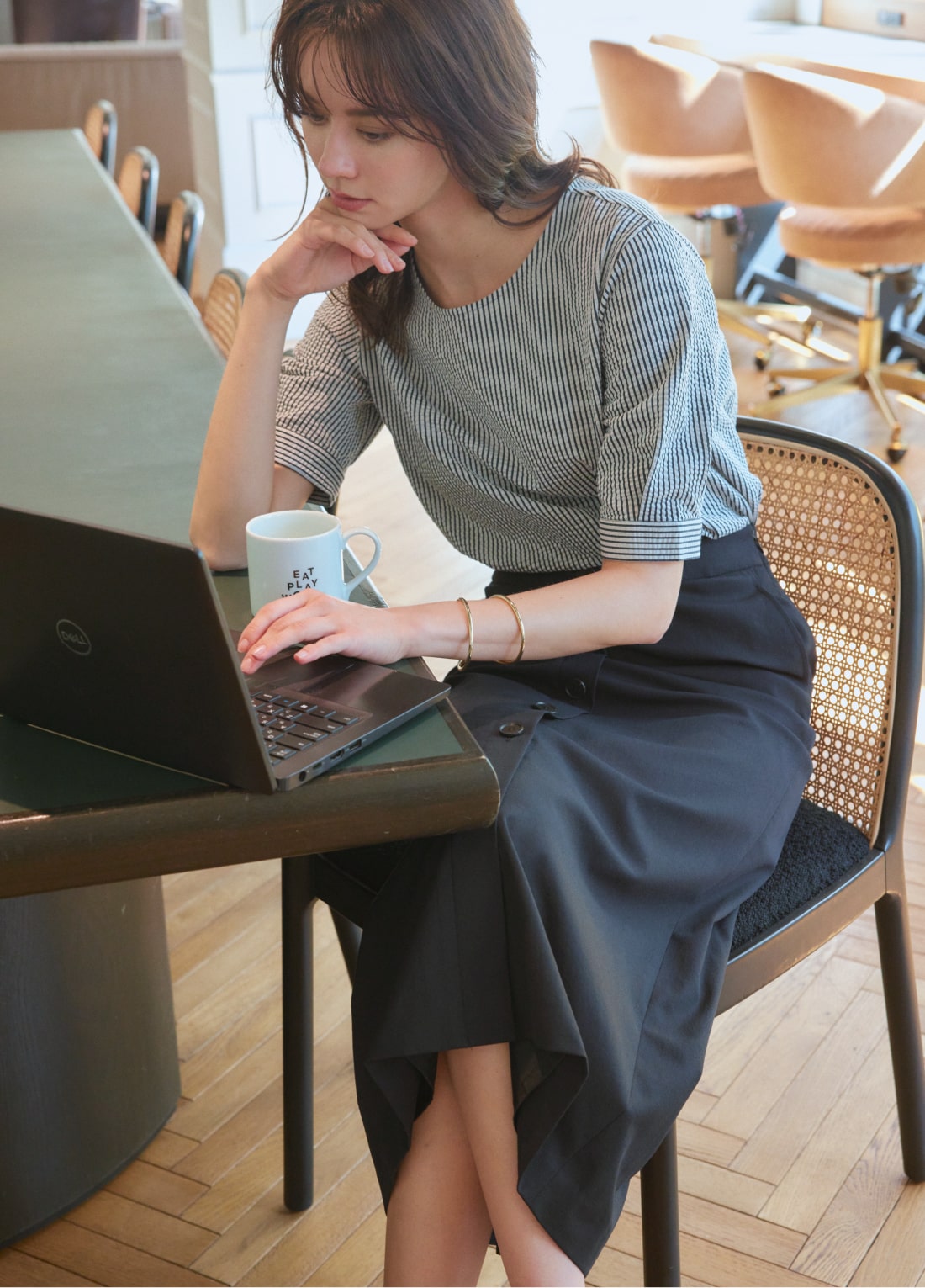毎年大好評のサッカー生地カットソーは、ちょっとした袖のデザインがポイント。ストレスフリーな素材でお仕事を快適に。
