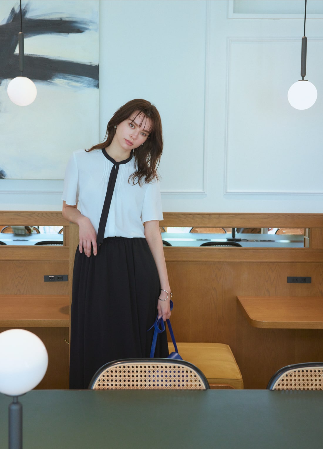 フェミニン風が気分の日には、ボウタイブラウスをチョイス。全体のトーンを合わせて甘さ控えめに。