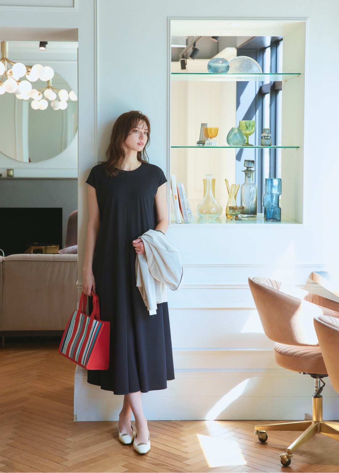ジャージーの着心地がポイントのキレイ目ネイビーワンピースを、カラーバッグでカジュアルダウン。