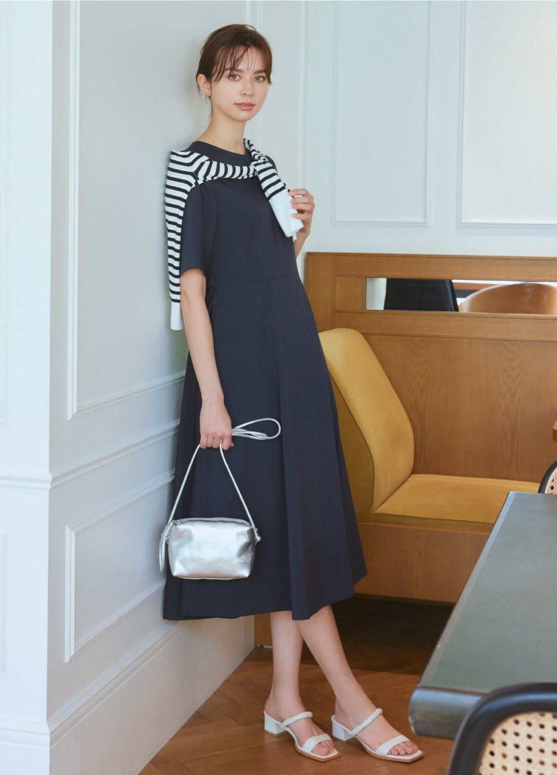 フィットアンドフレアのお出かけワンピにボーダーのカーディガンを肩掛けして親しみやすい上品さを演出。
