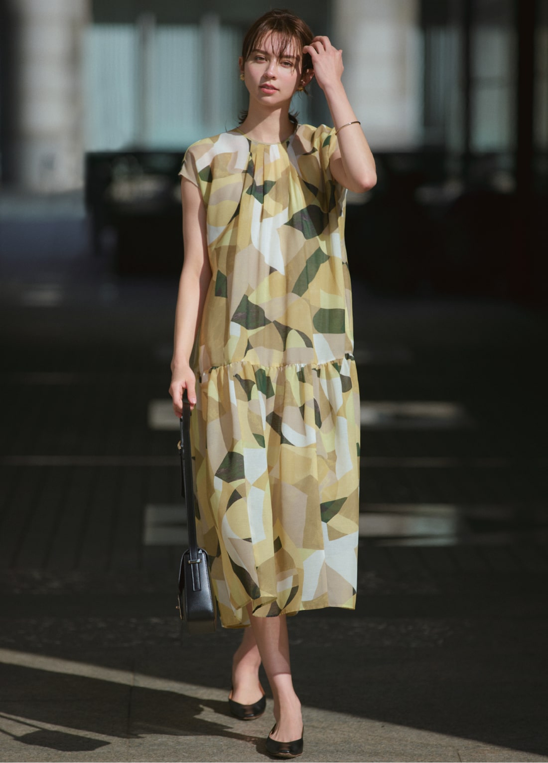 小物をブラックで統一し、インパクトのある柄物ワンピを上品に昇華。