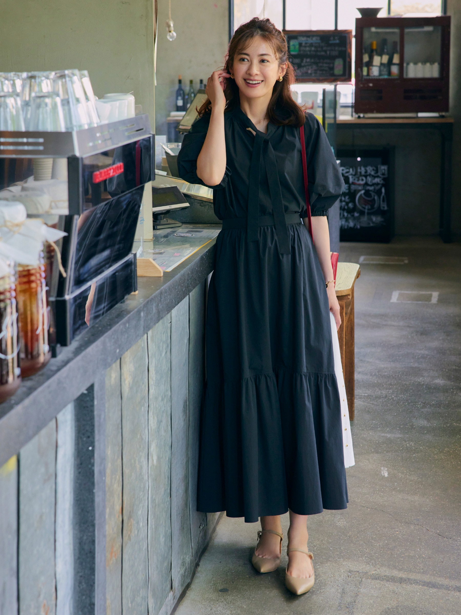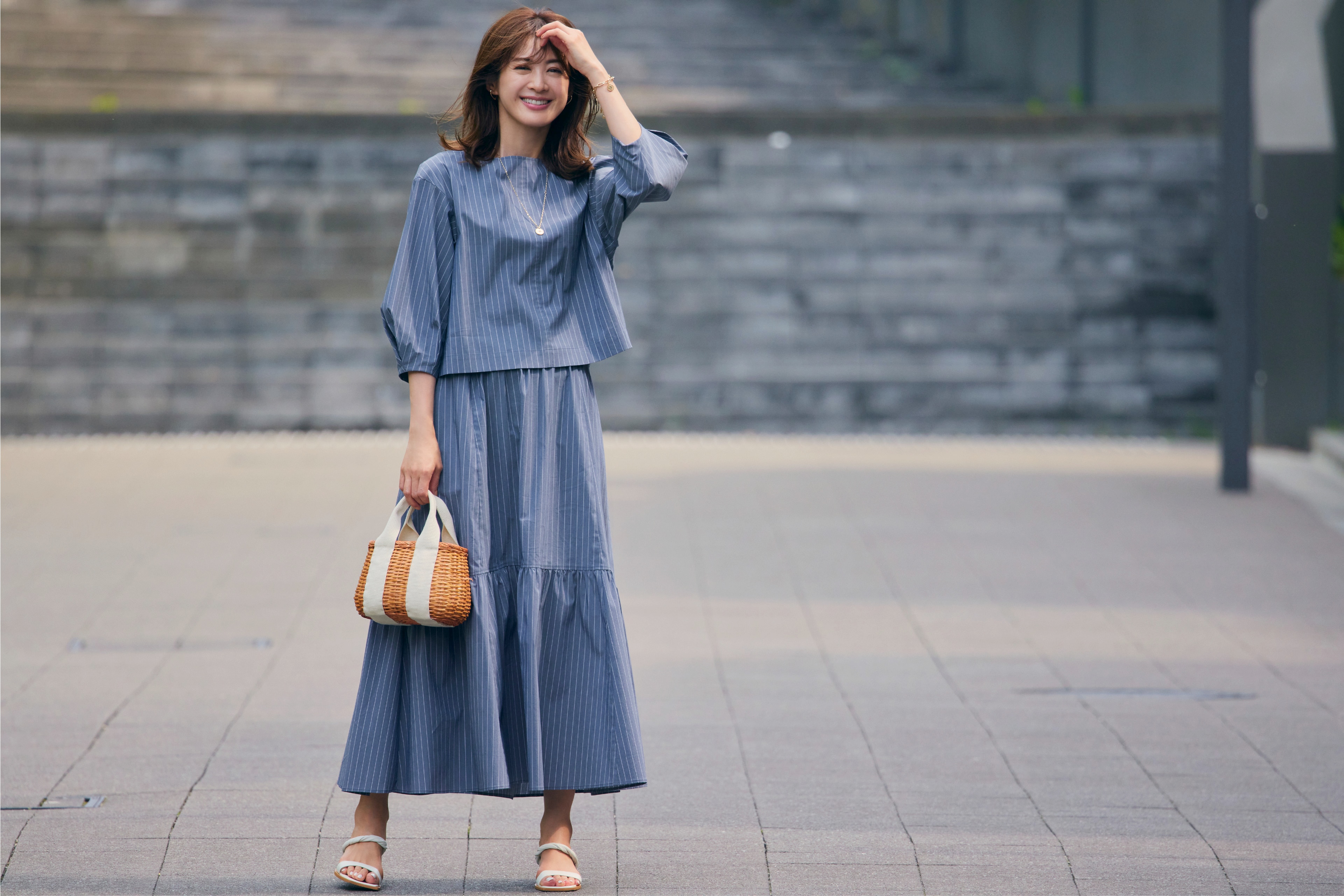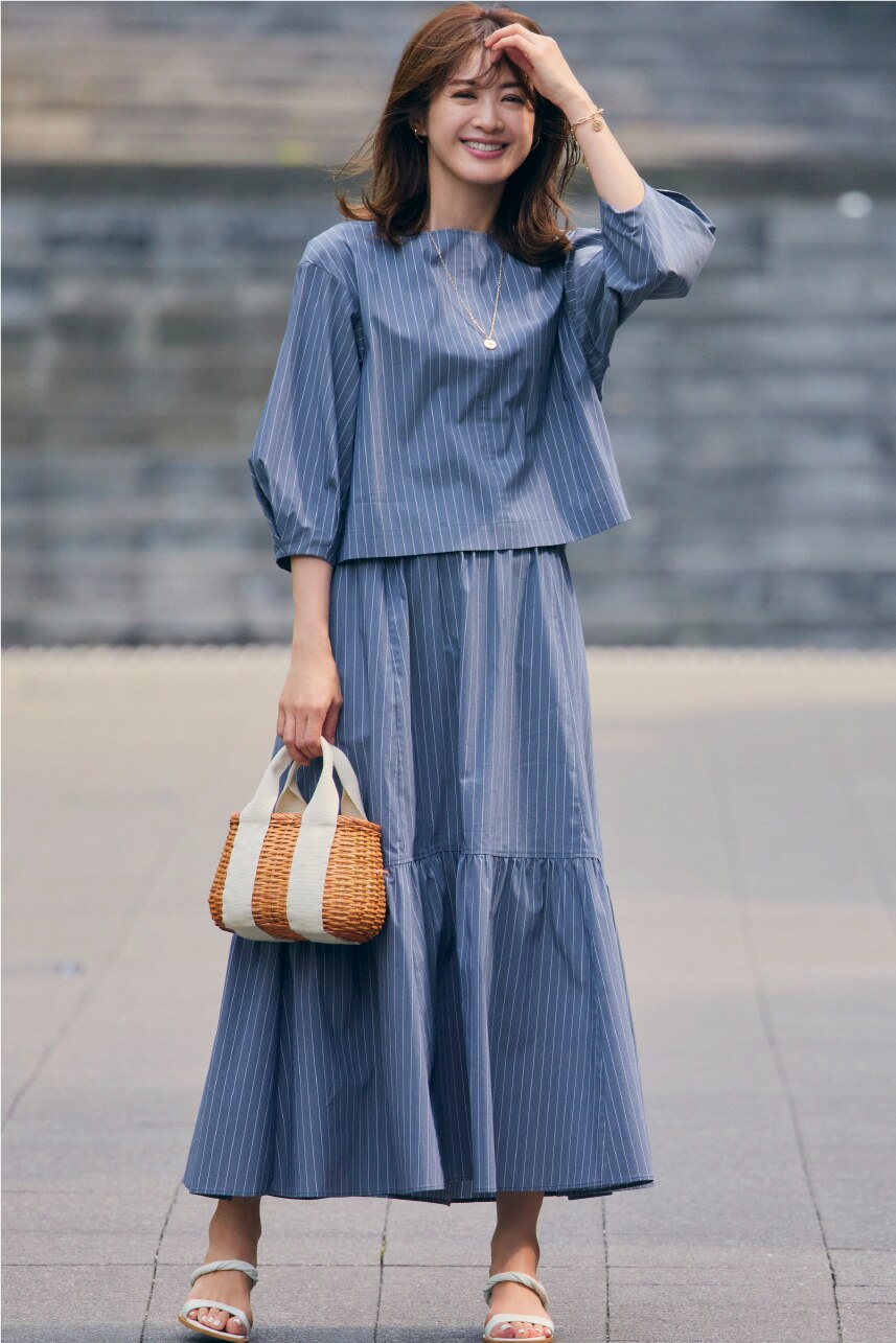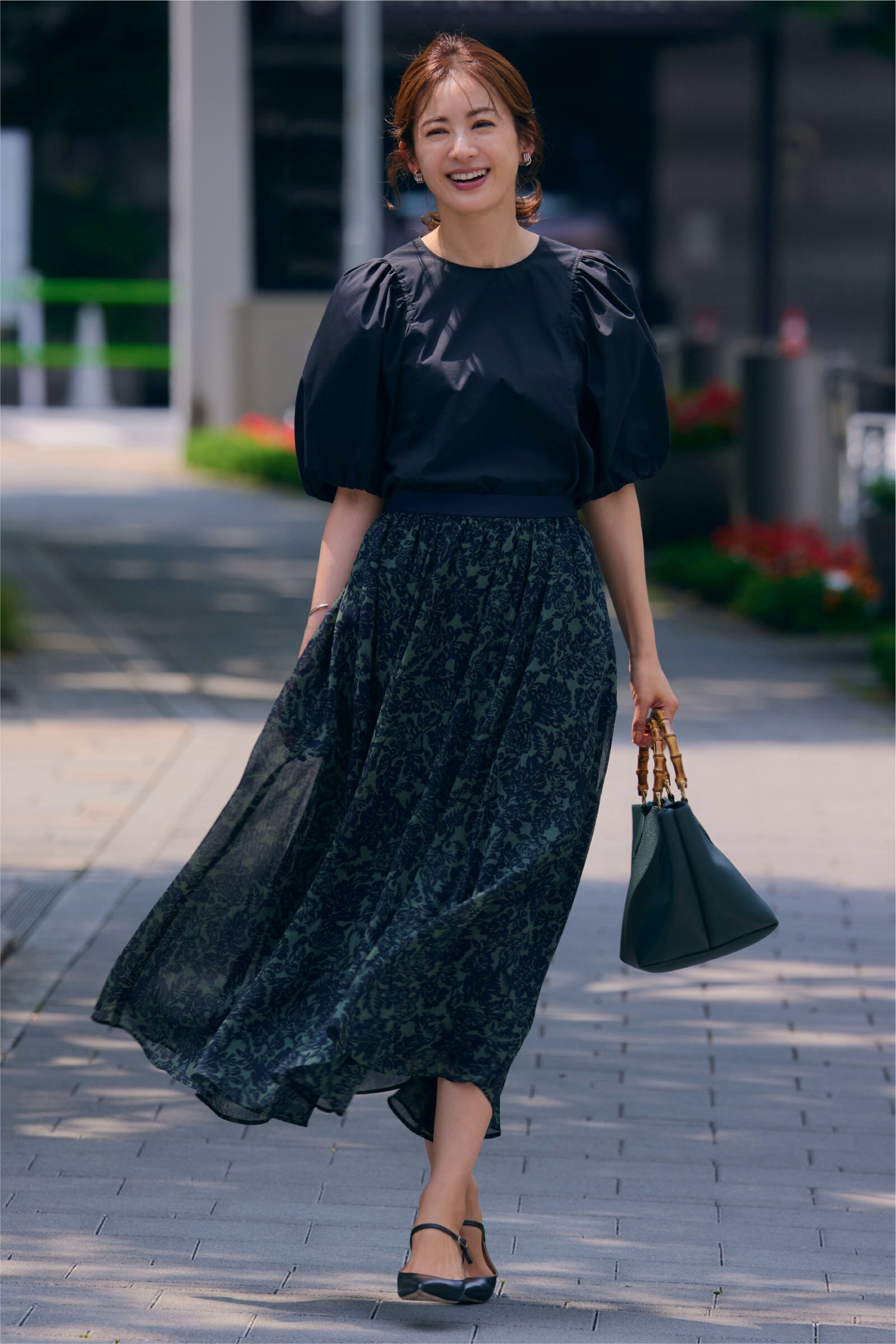構築的な袖デザインとトレンドの短丈が今っぽいブラウスと、適度なティアードが大人世代に効くスカートのワンピ見え「ワンツーコーデ」。