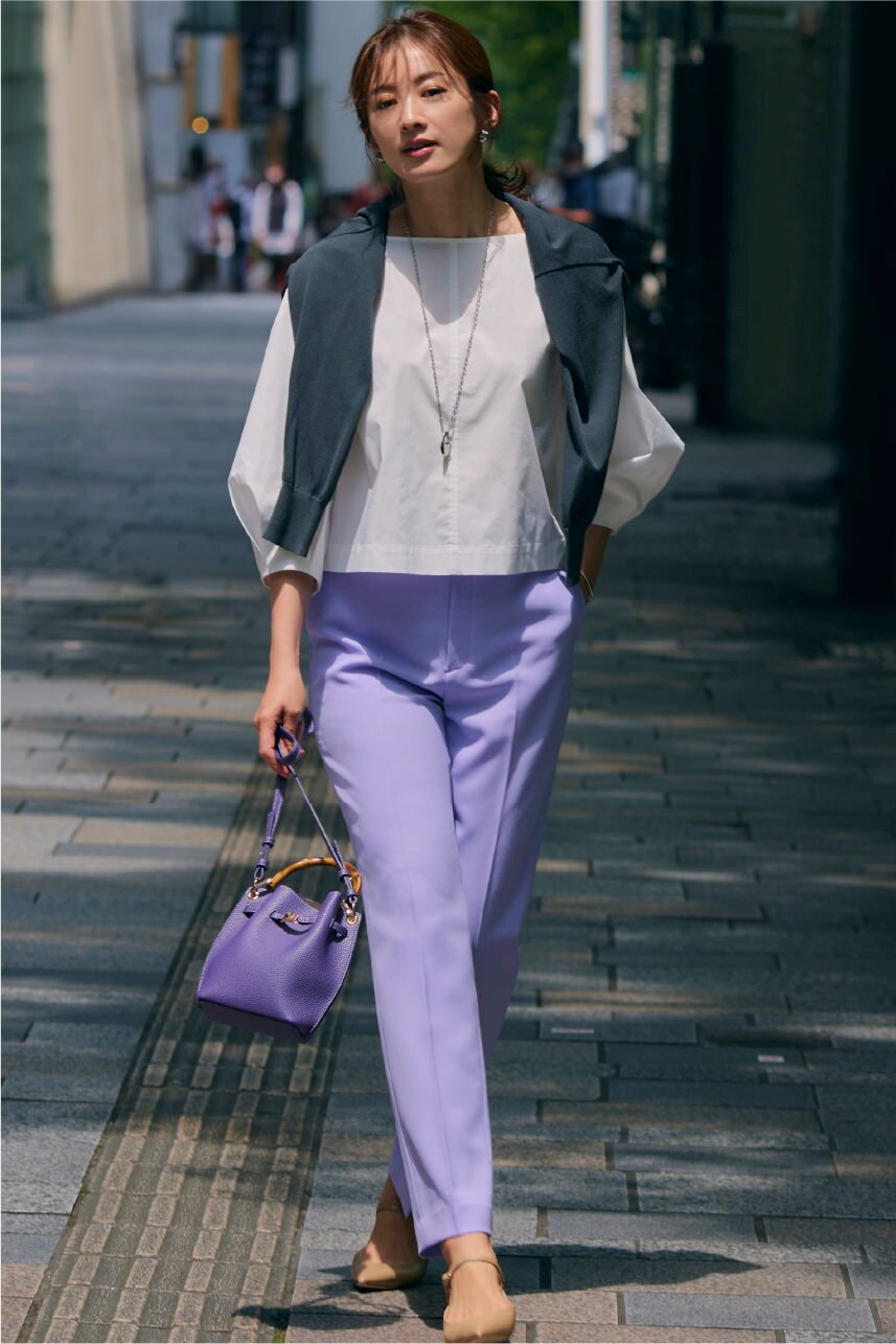 グラデーションを意識したラベンダーのデニムと合わることで、旬度の高いカラーコーデを堪能してみて。