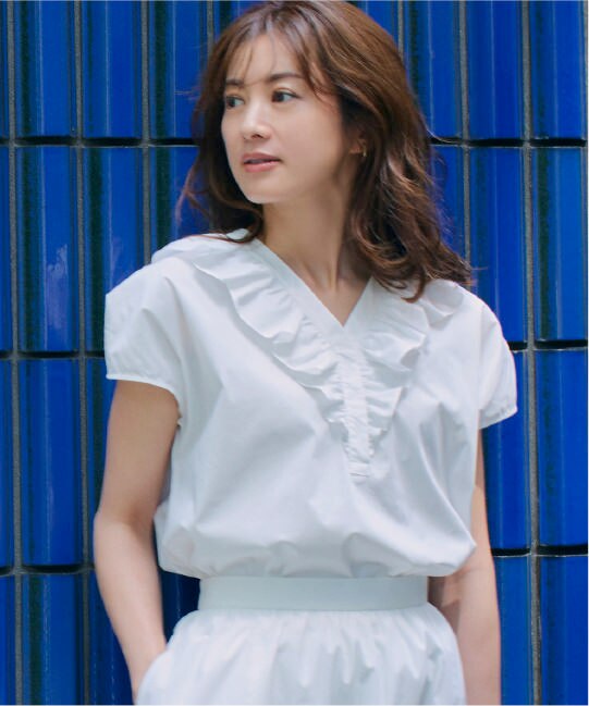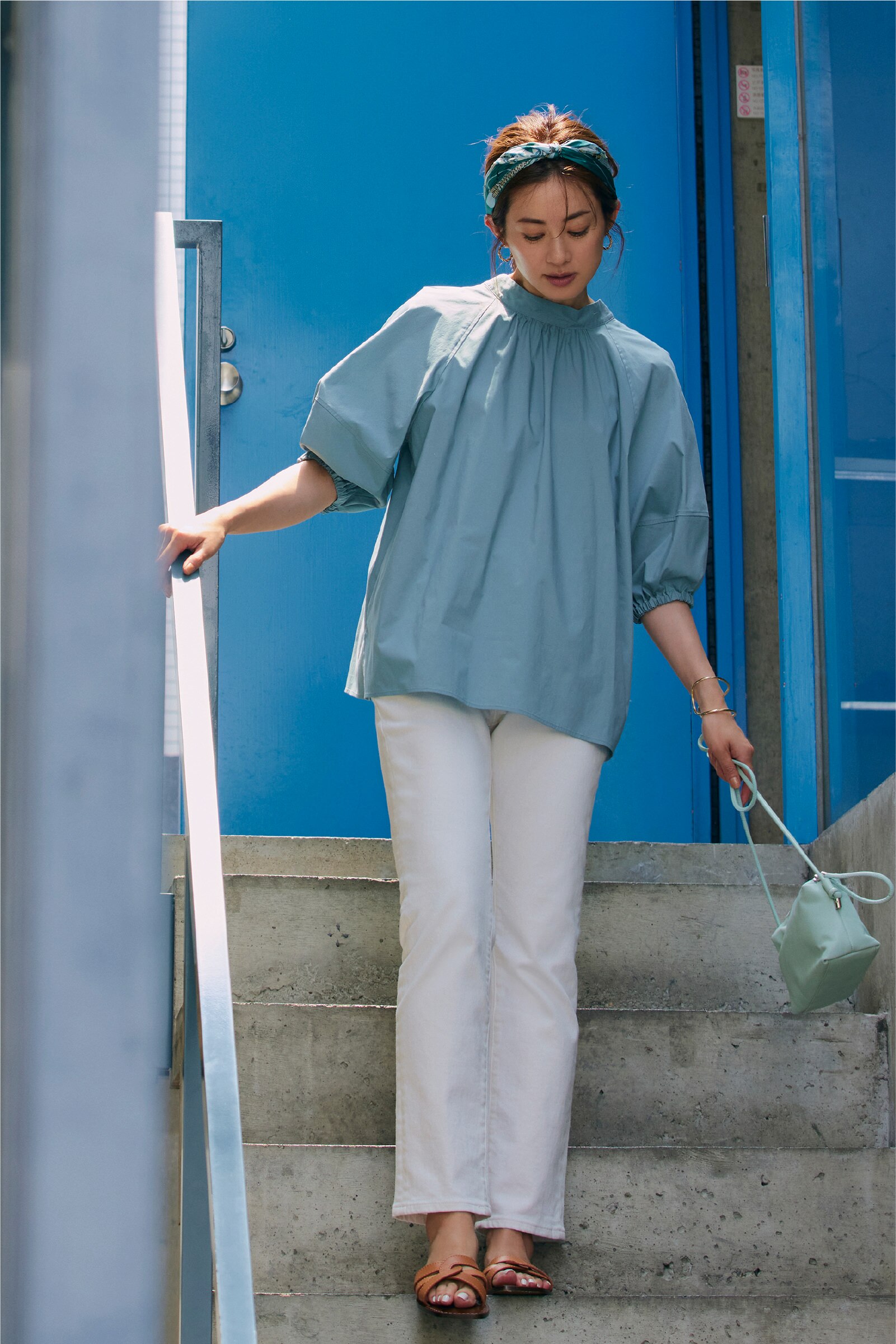 ブラウスは淡いブルーを選べば優しい雰囲気に。