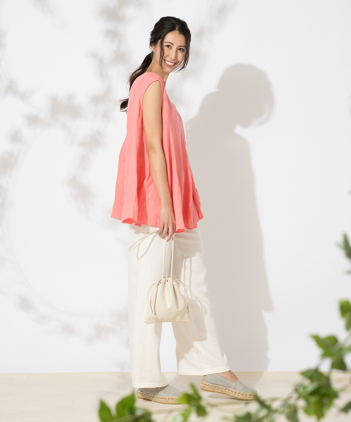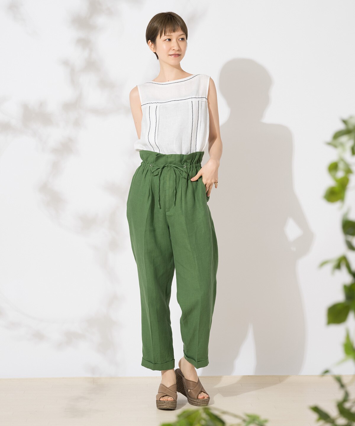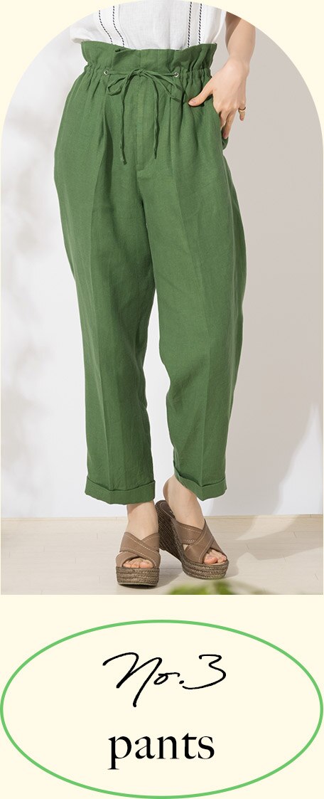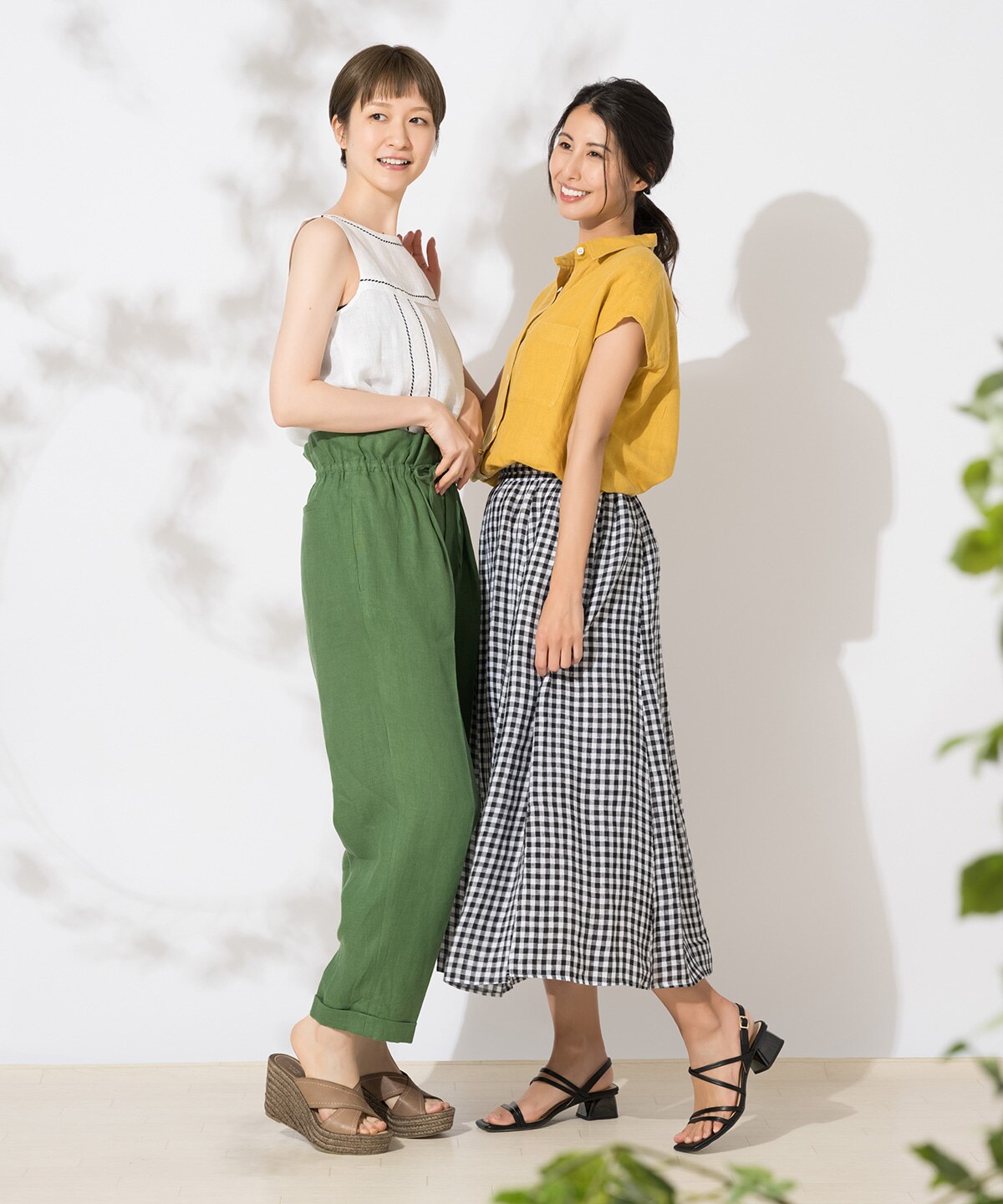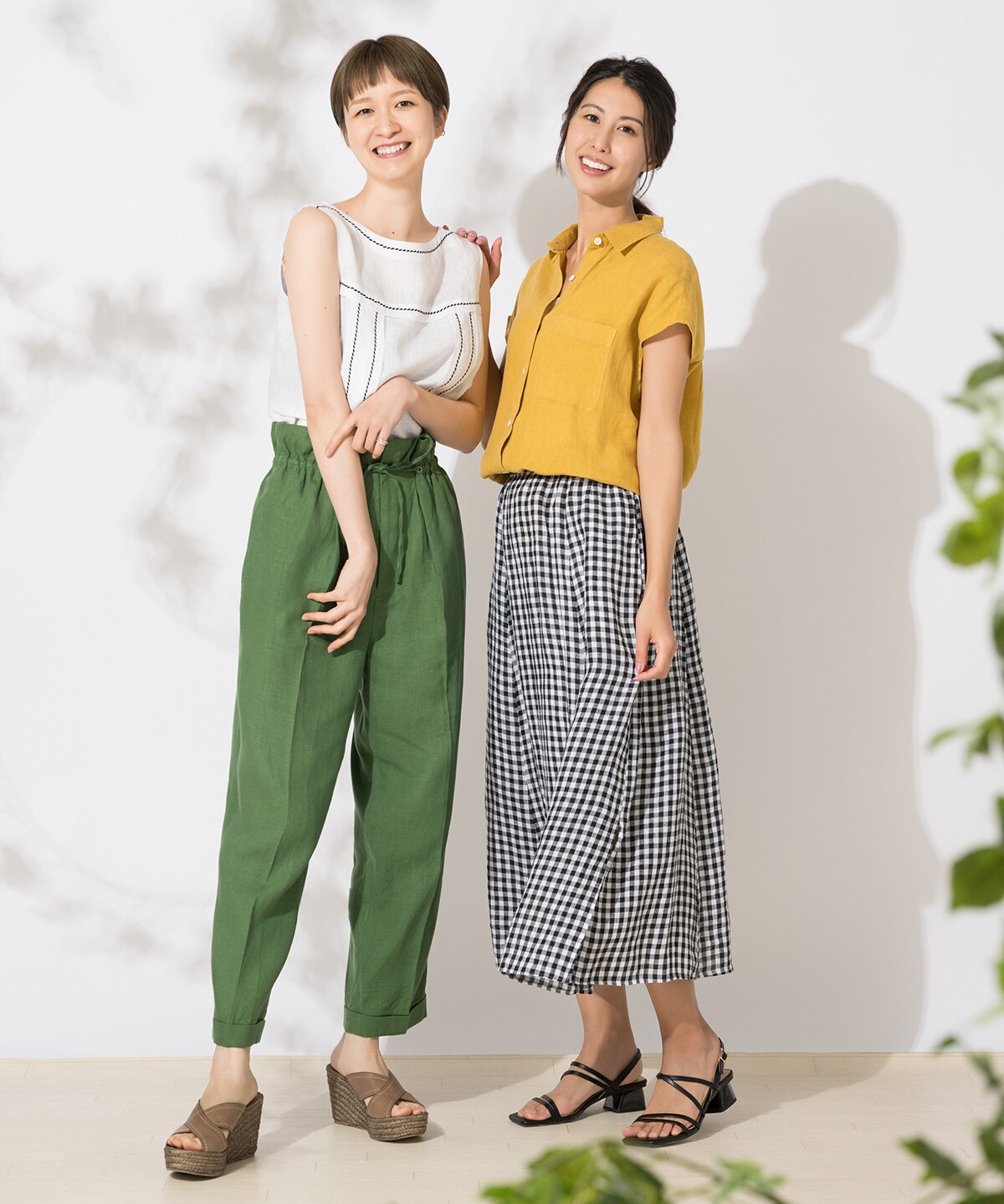 カラーボトムも麻の素材感のおかげで自然に取り入れることができ、