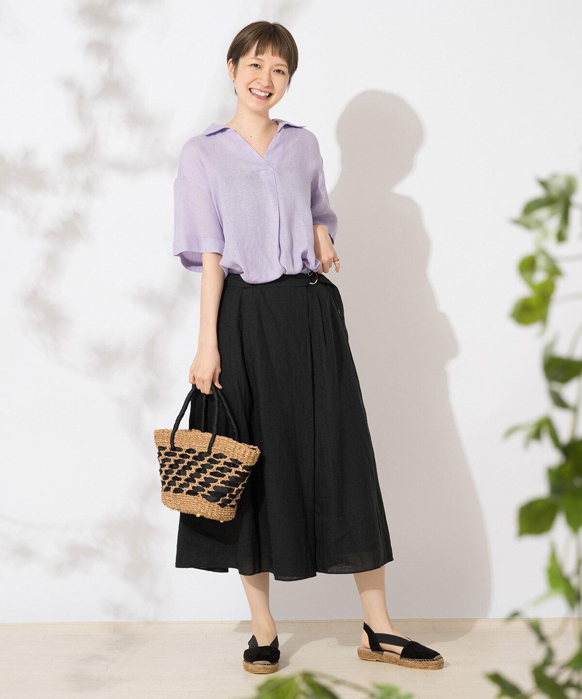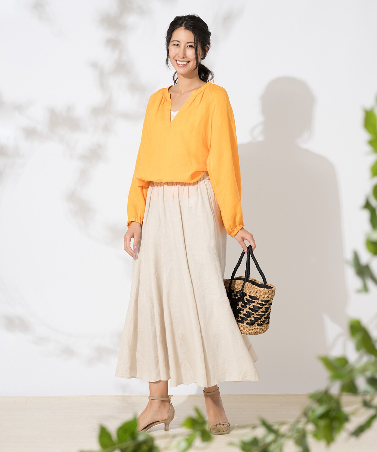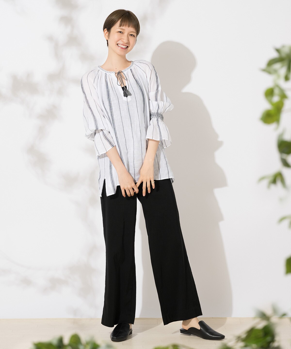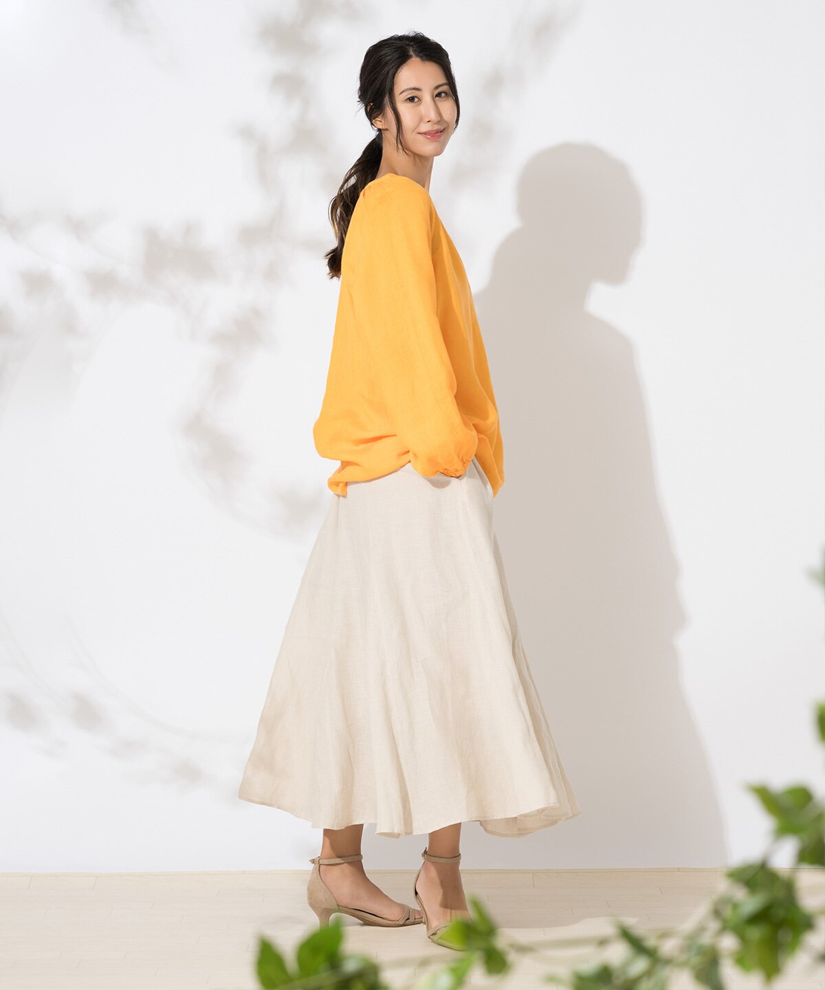 カラーボトムも麻の素材感のおかげで自然に取り入れることができ、