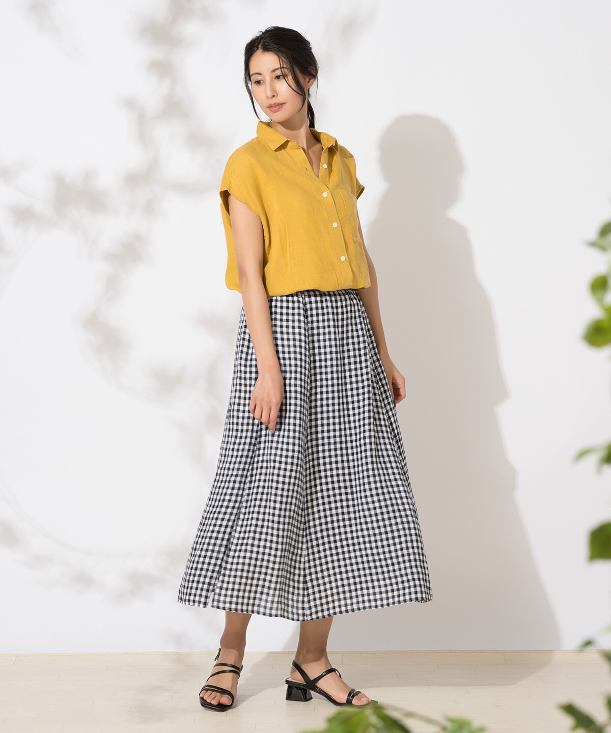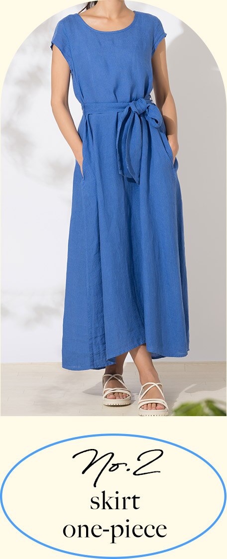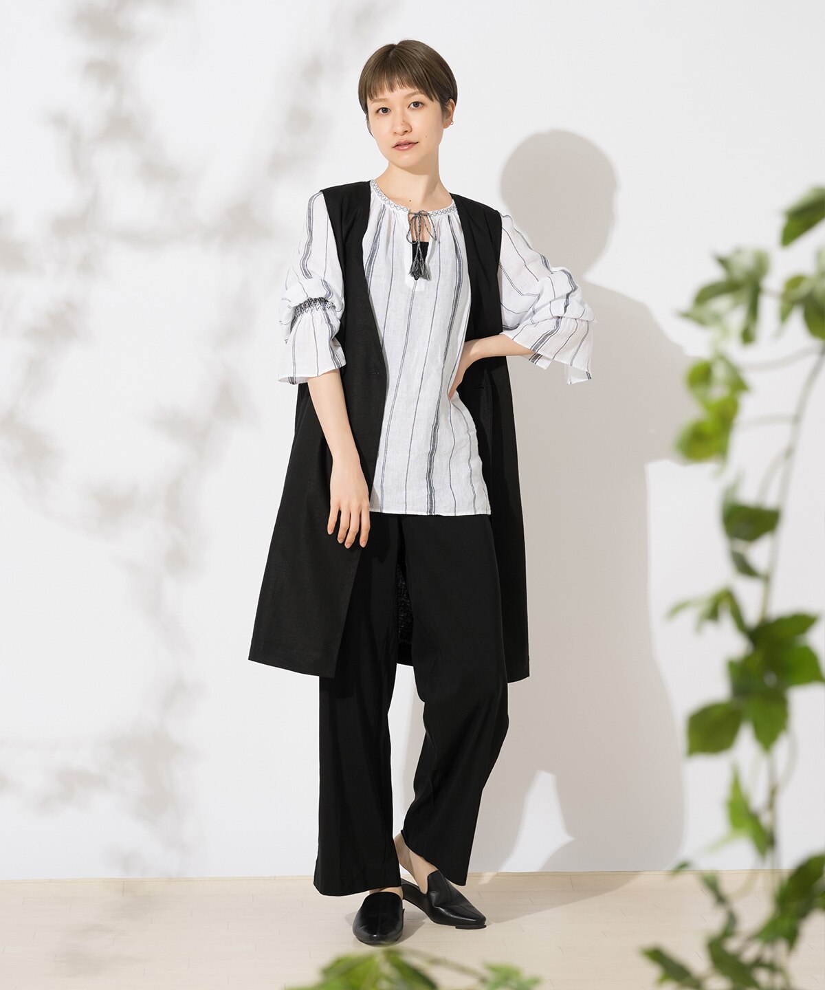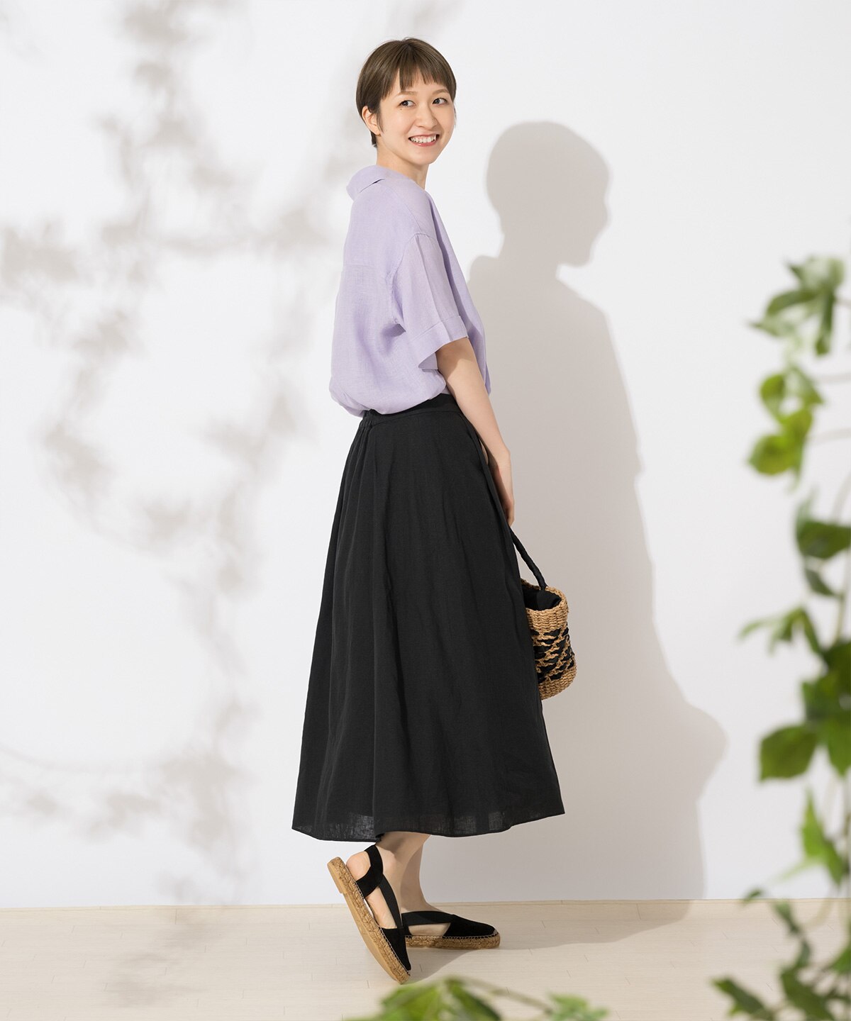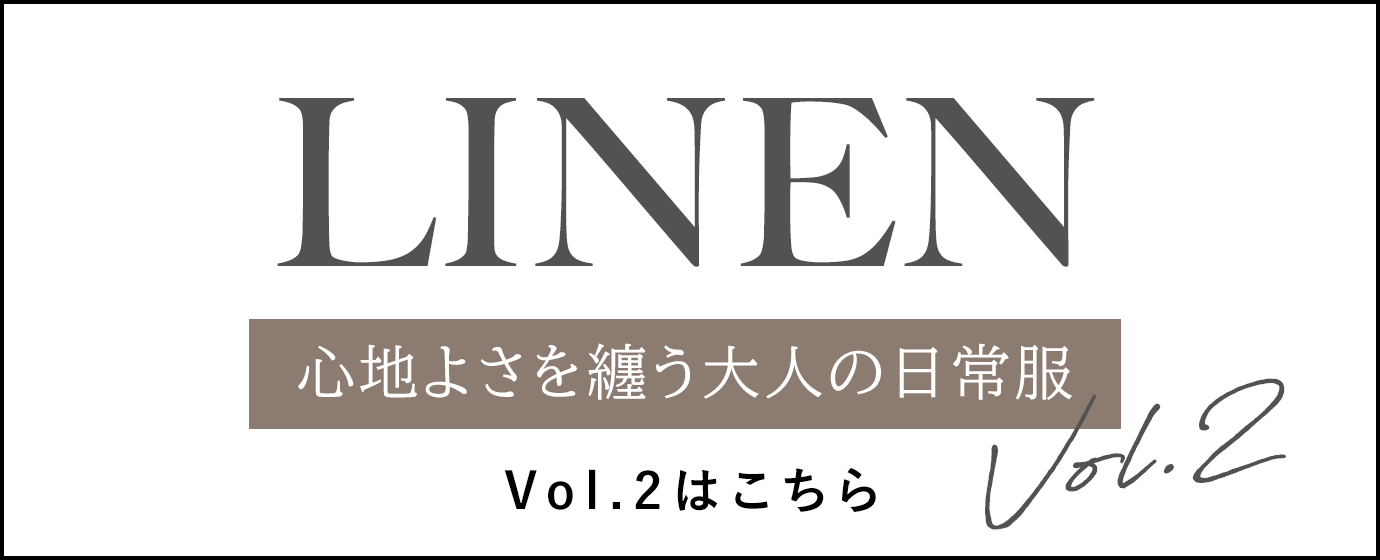 カラーボトムも麻の素材感のおかげで自然に取り入れることができ、