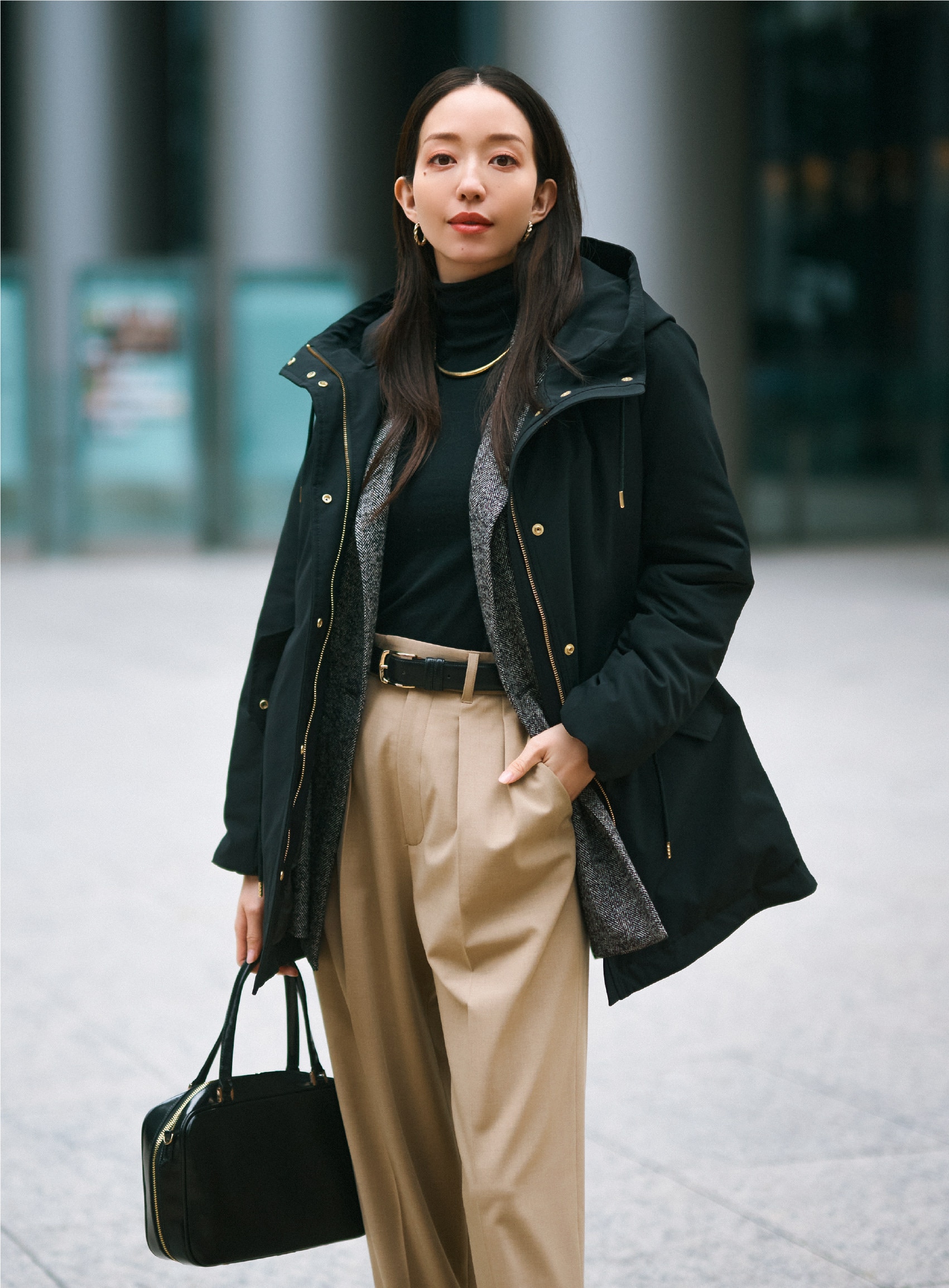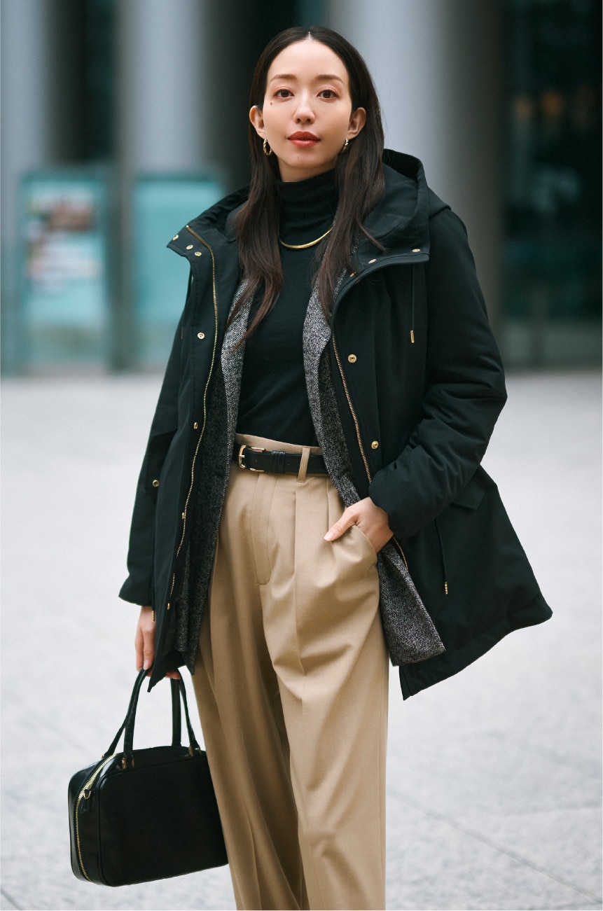 ジャケットスタイルと合うように、アウターはダウン特有の凹凸感のないアイテムを選んでみて。モノトーンでまとめつつ、1点明るめのカラーを投入することで女性らしさもプラス。
