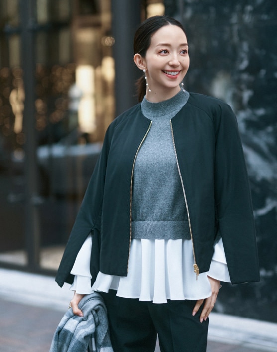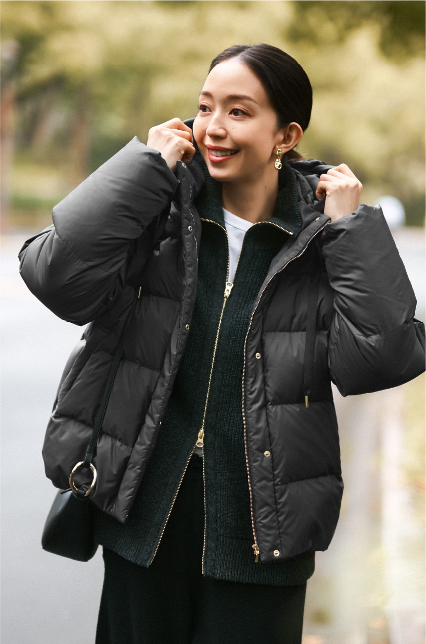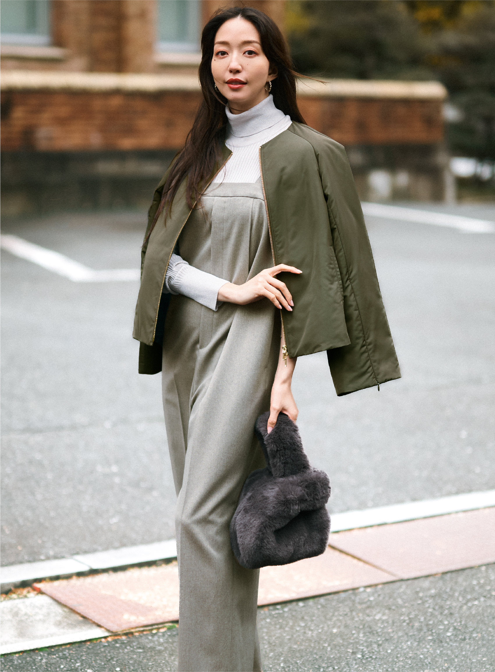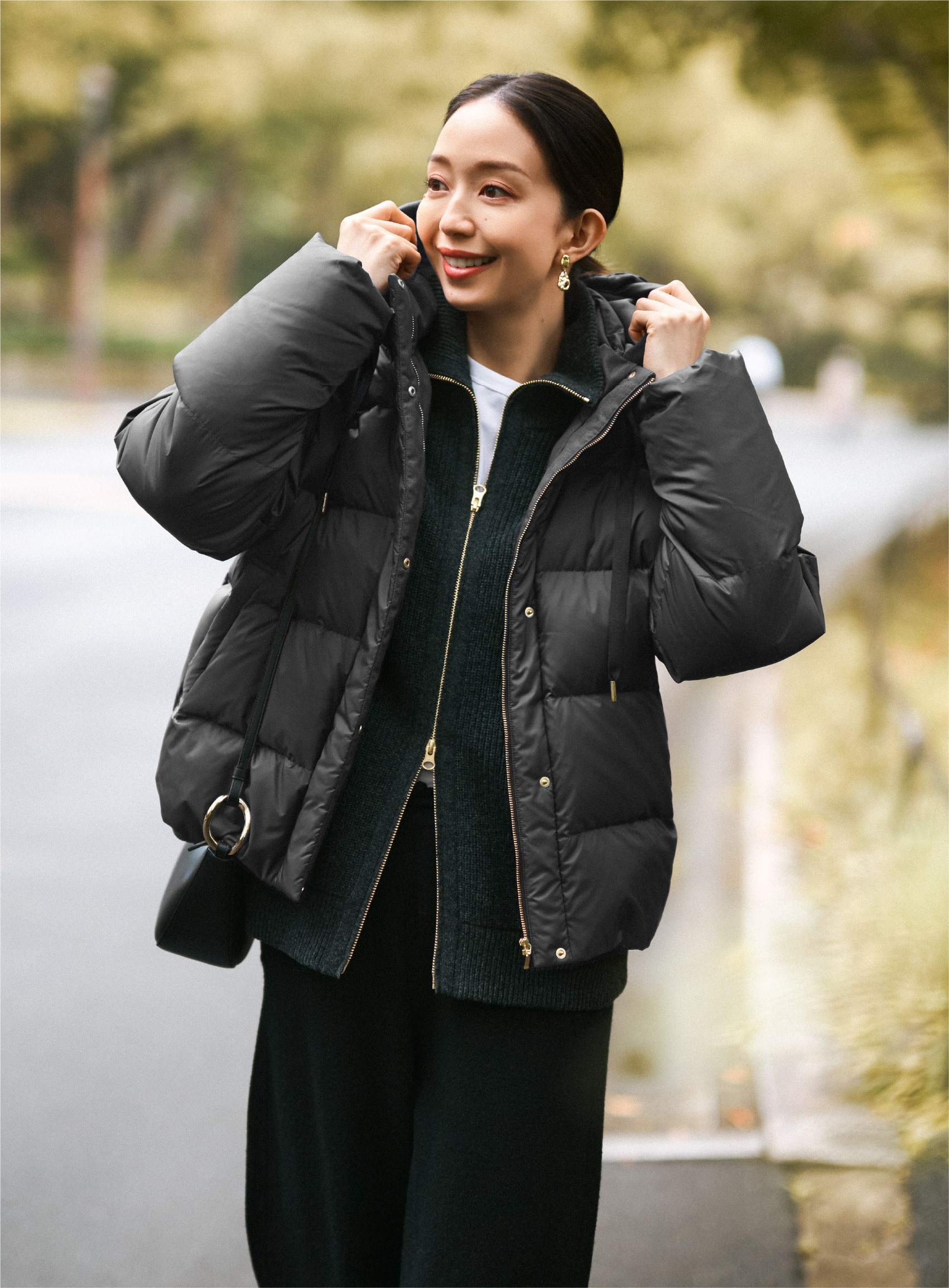 軽やかな中綿のジャケットはゴールドのジップがアクセサリーのようで、ネックレスいらずのアウター。他の飾りはそぎ落として、アウターとニットのデザインを際立たせて。シンプルなのに普通には見えない、大人のきれいめコーデが完成するはず。
