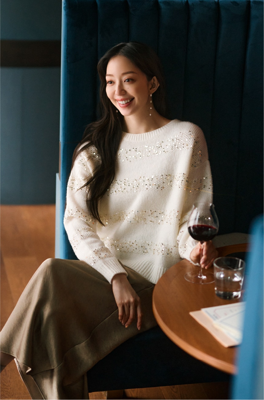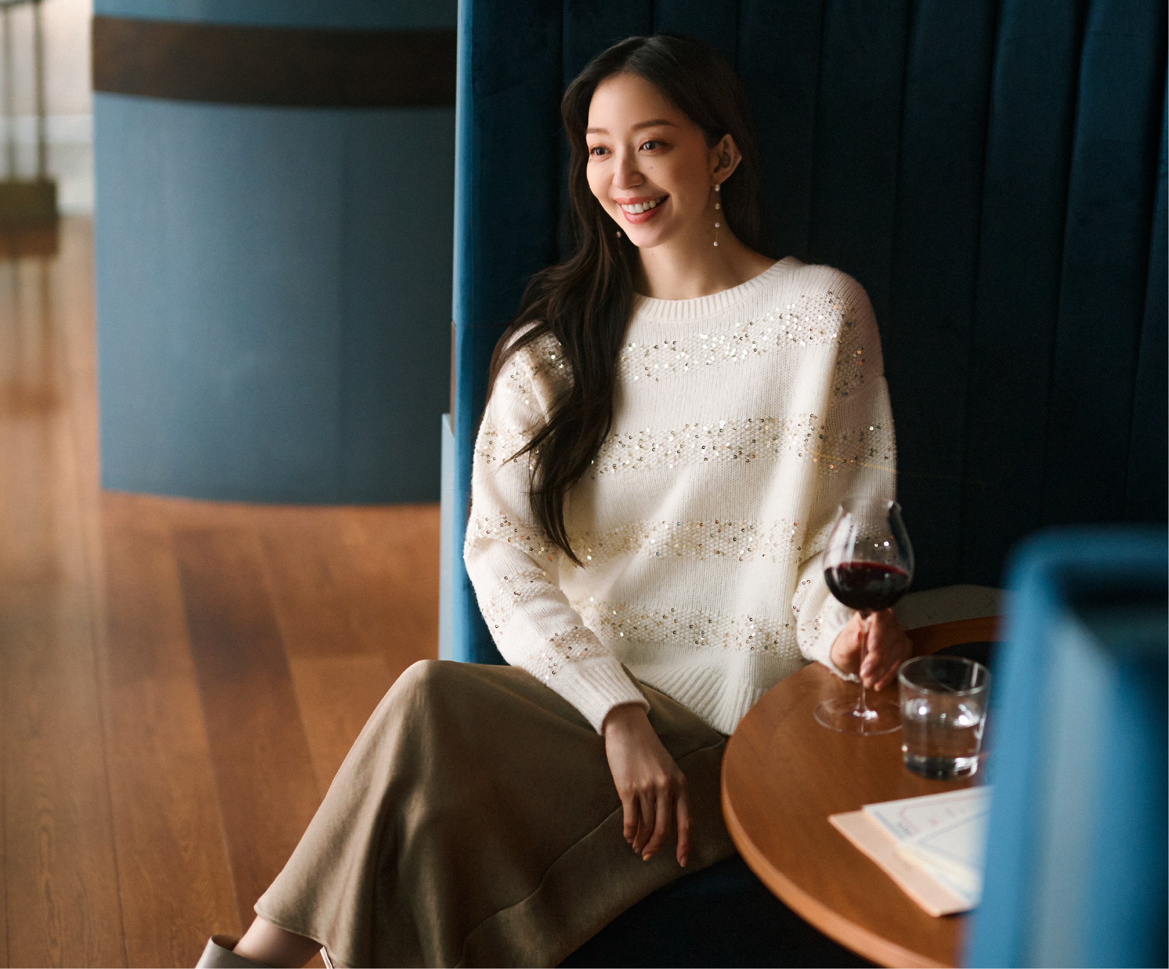 素敵なホテルでゆっくりと過ごす、新しい休日の楽しみ方。そんな日にはリラックスしつつもおしゃれでいたい、わがままを叶えるレイヤードニットを纏って。控えめなラメ感を活かすように、トーンを揃えてみる。