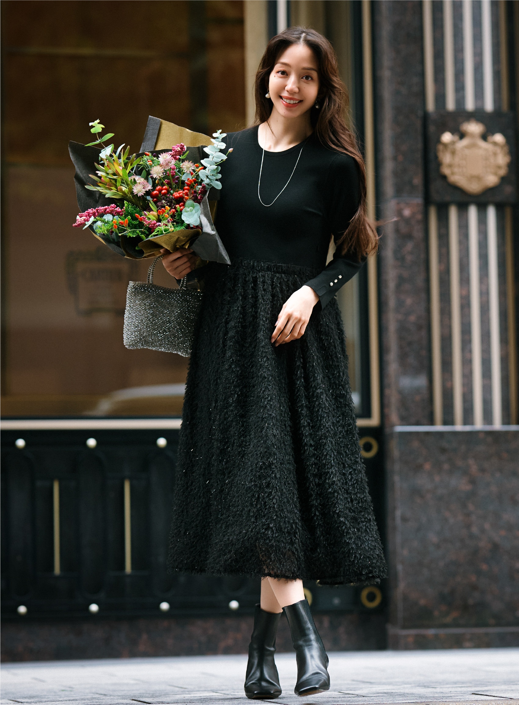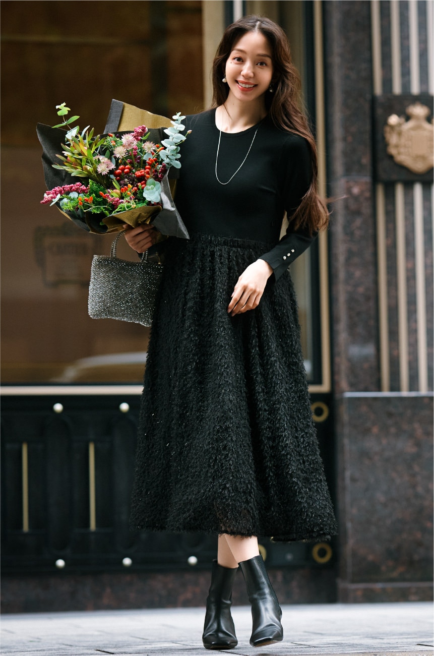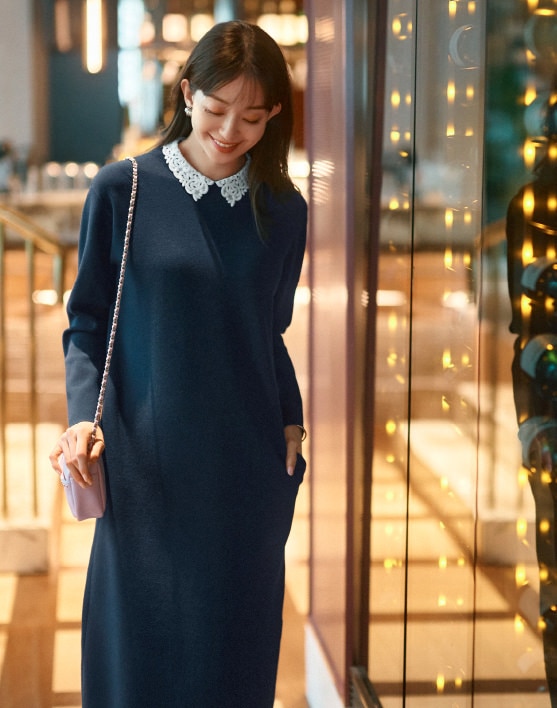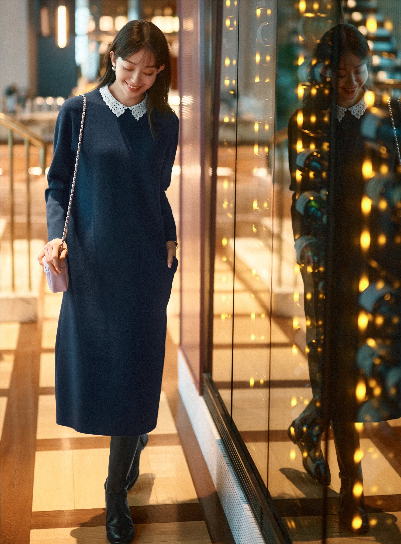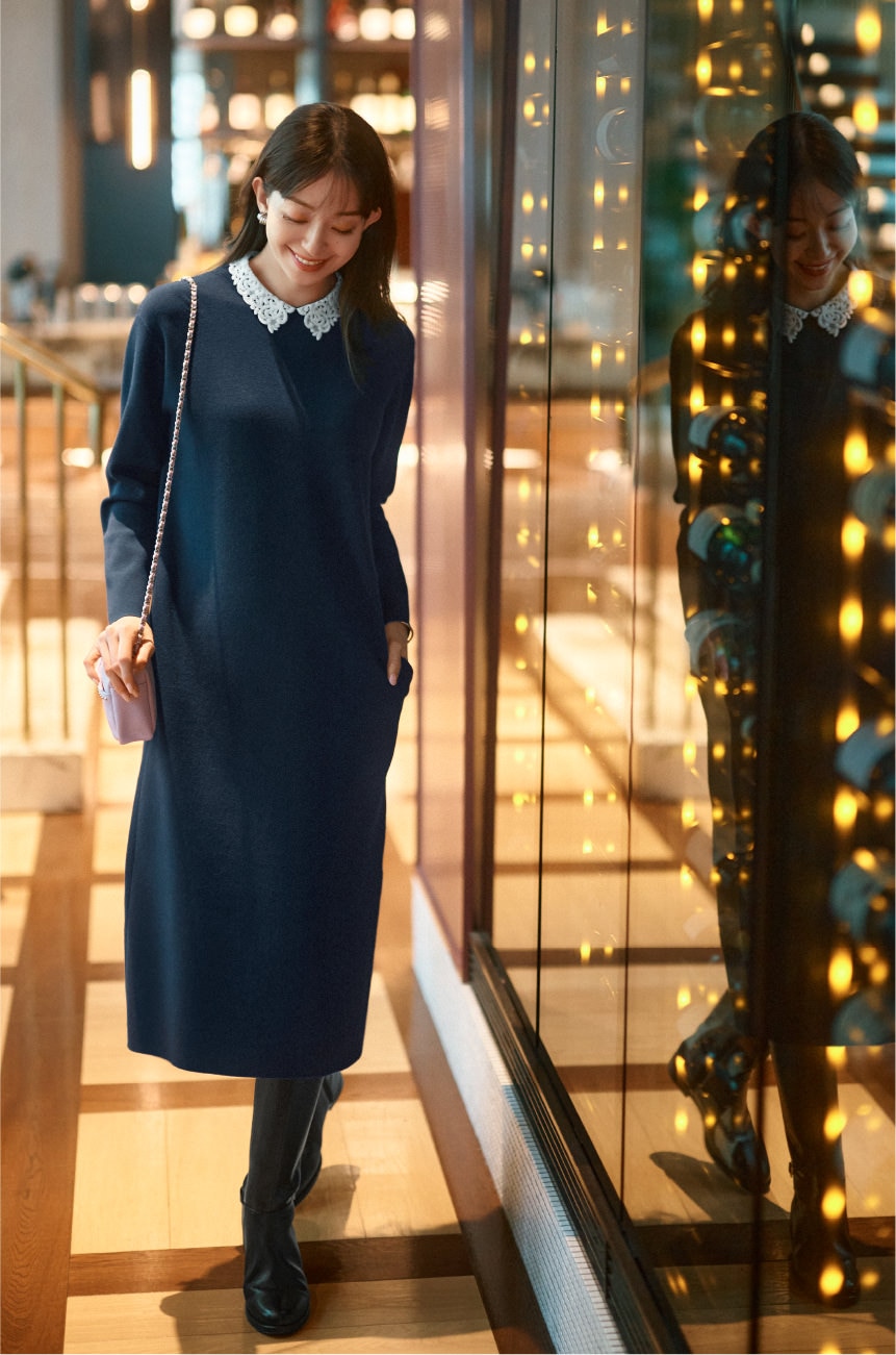 忘年会にはきちんと感と華やぎを重視したスタイリングでのぞみたい。レース襟のワンポイントで真面目な顔をしつつ、ニットワンピースだから気疲れせずに過ごせるはず。一枚でサッと着て美しい佇まいを演出してみて。