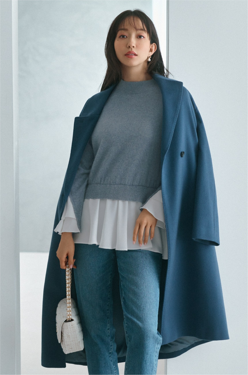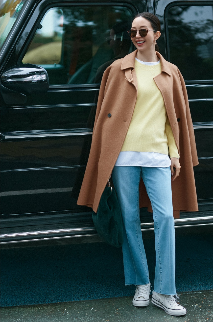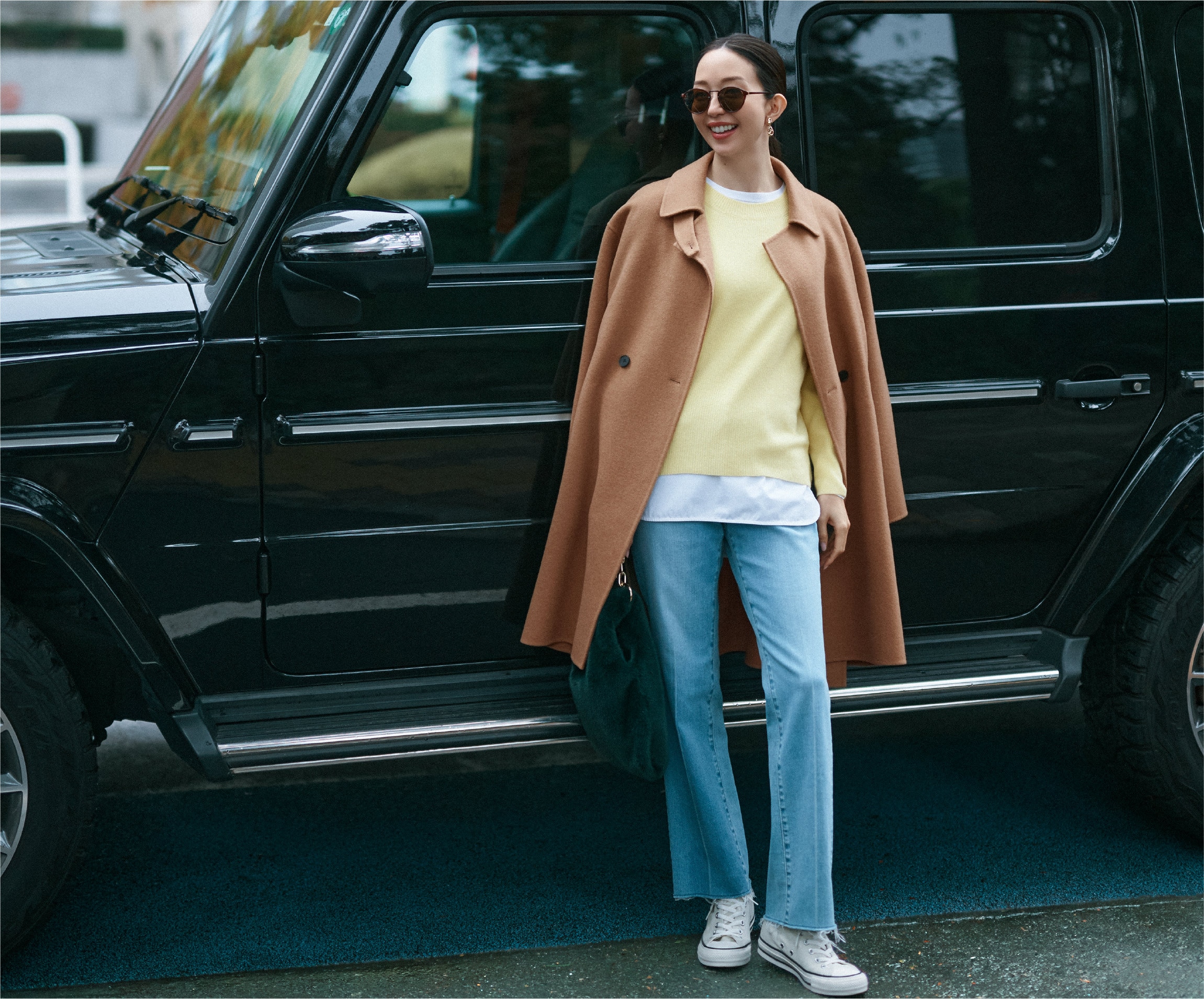 帰省すると親戚や友人、たくさんの人に会うから明るいカラーで華やぎたい。ニットは厚みがおさえめのものを選べば長時間の車移動にもぴったり。アウターをあえてウールにすることで、ニット×デニムでもカジュアルスタイルすぎない雰囲気に。