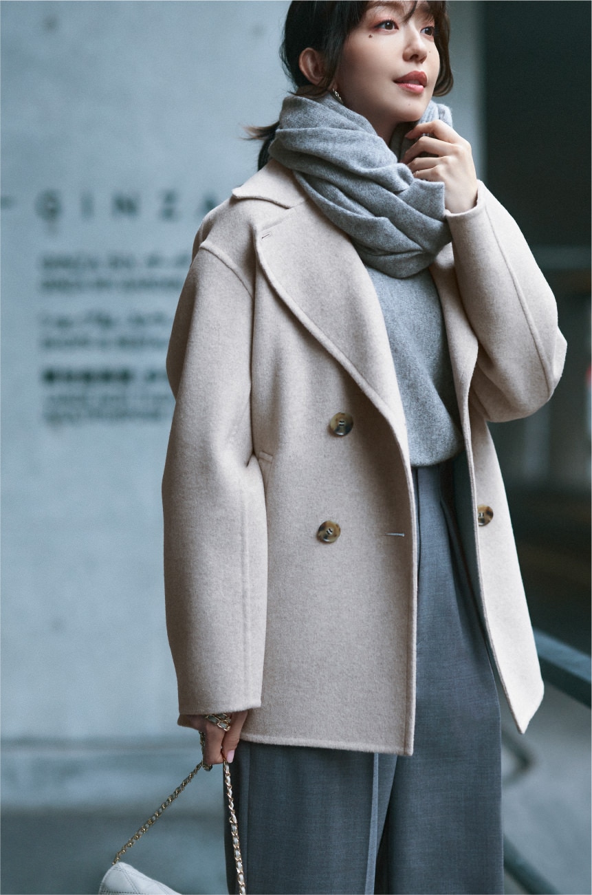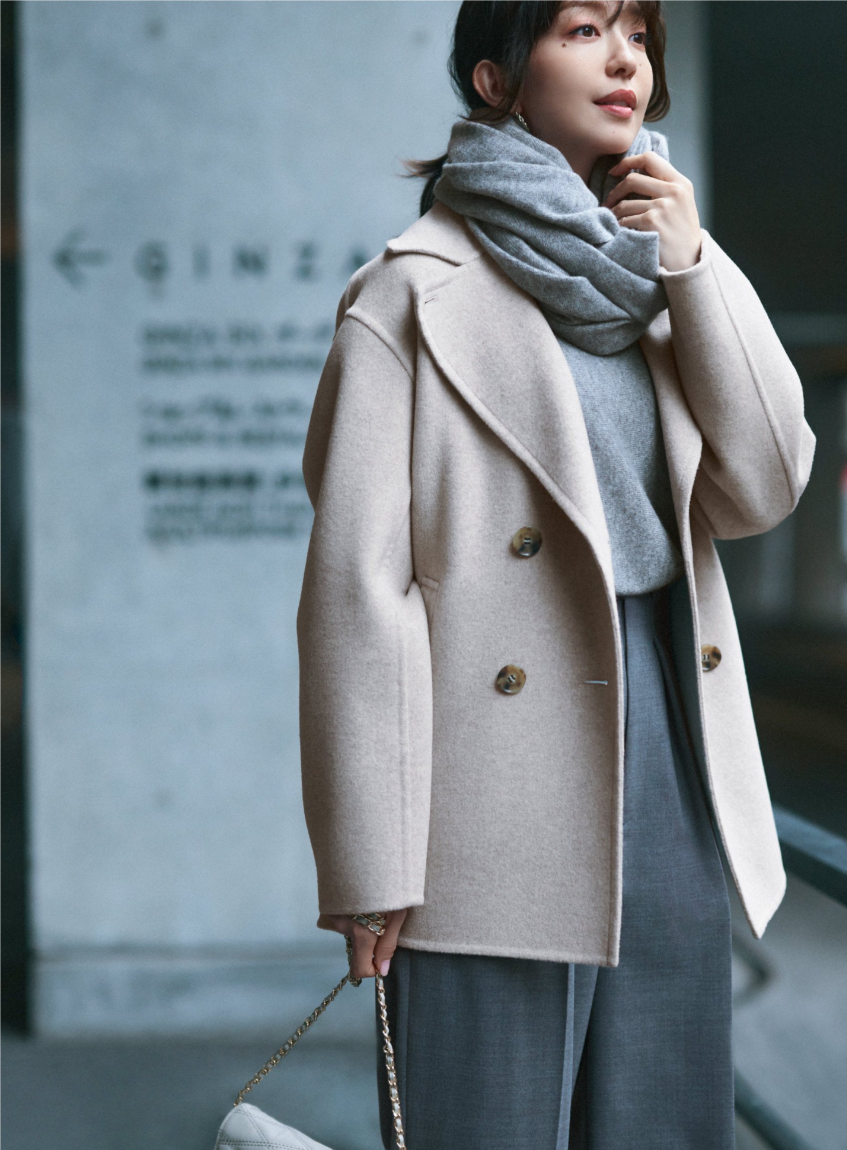 寒さが厳しい時期でも電車内は暑く感じるから、体温調節のできるストールがあるとベスト。かっちり見えが叶うPコートも明るいベージュを選べばON/OFF着回せる。トレンドのグレーとの掛け合わでシンプルながらも洗練されたスタイリング。