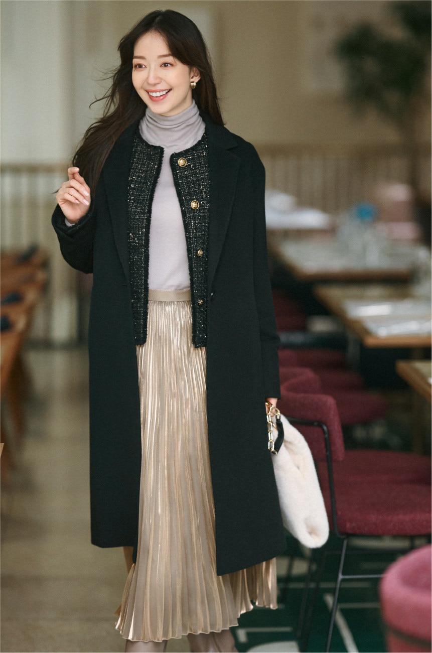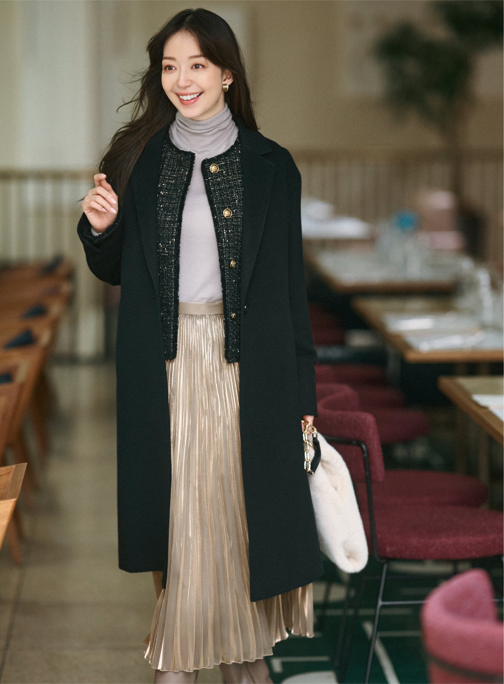 定番のチェスターコートはどんな時でも着まわせる、安心感が魅力。そんなアイテムの印象をスタイリングで変えてみて。上品なツイードジャケットを中に差し込んで、表情感をプラス。そこにトレンドのシャイニー素材を加えて華やかな佇まいに。