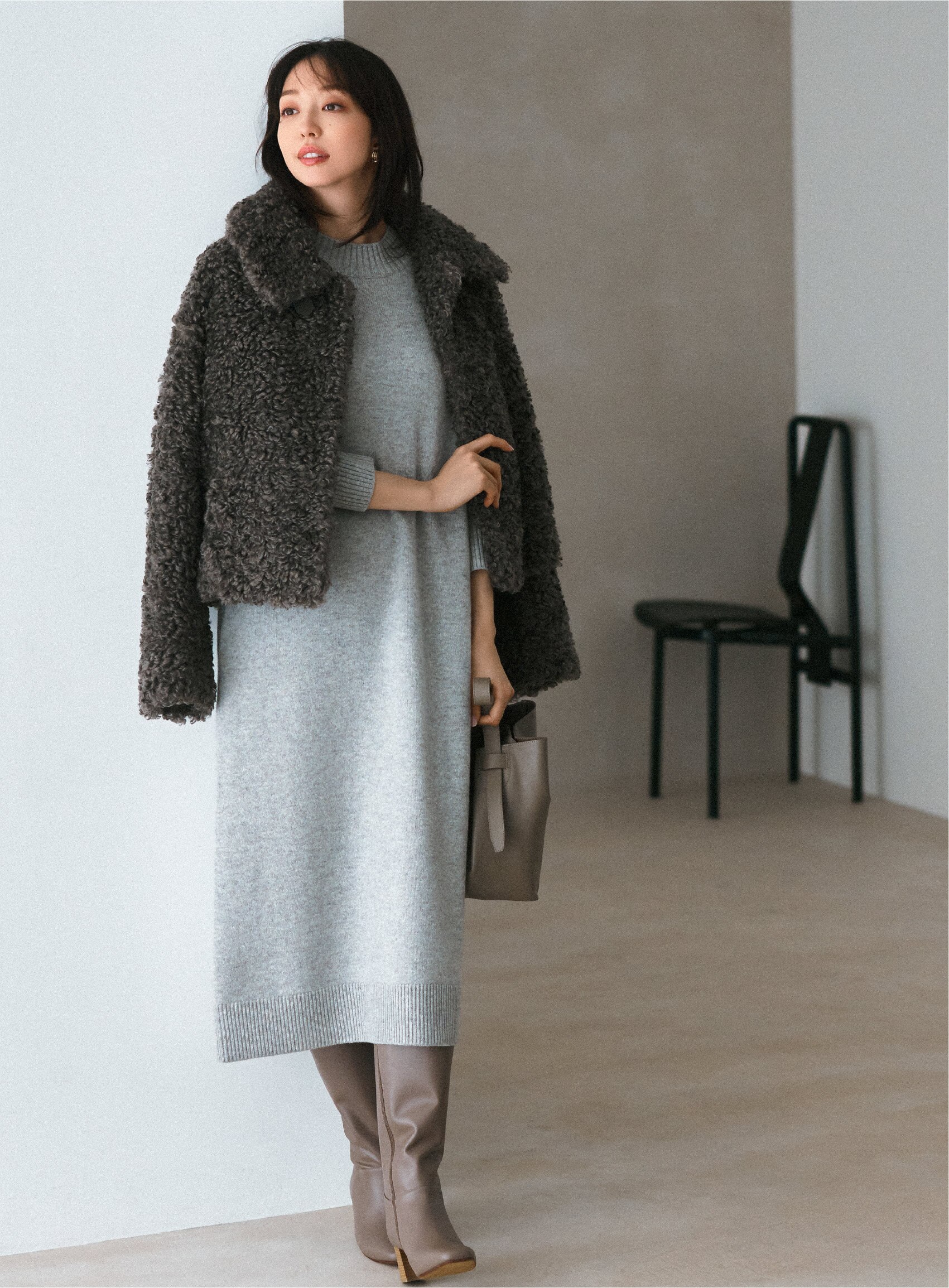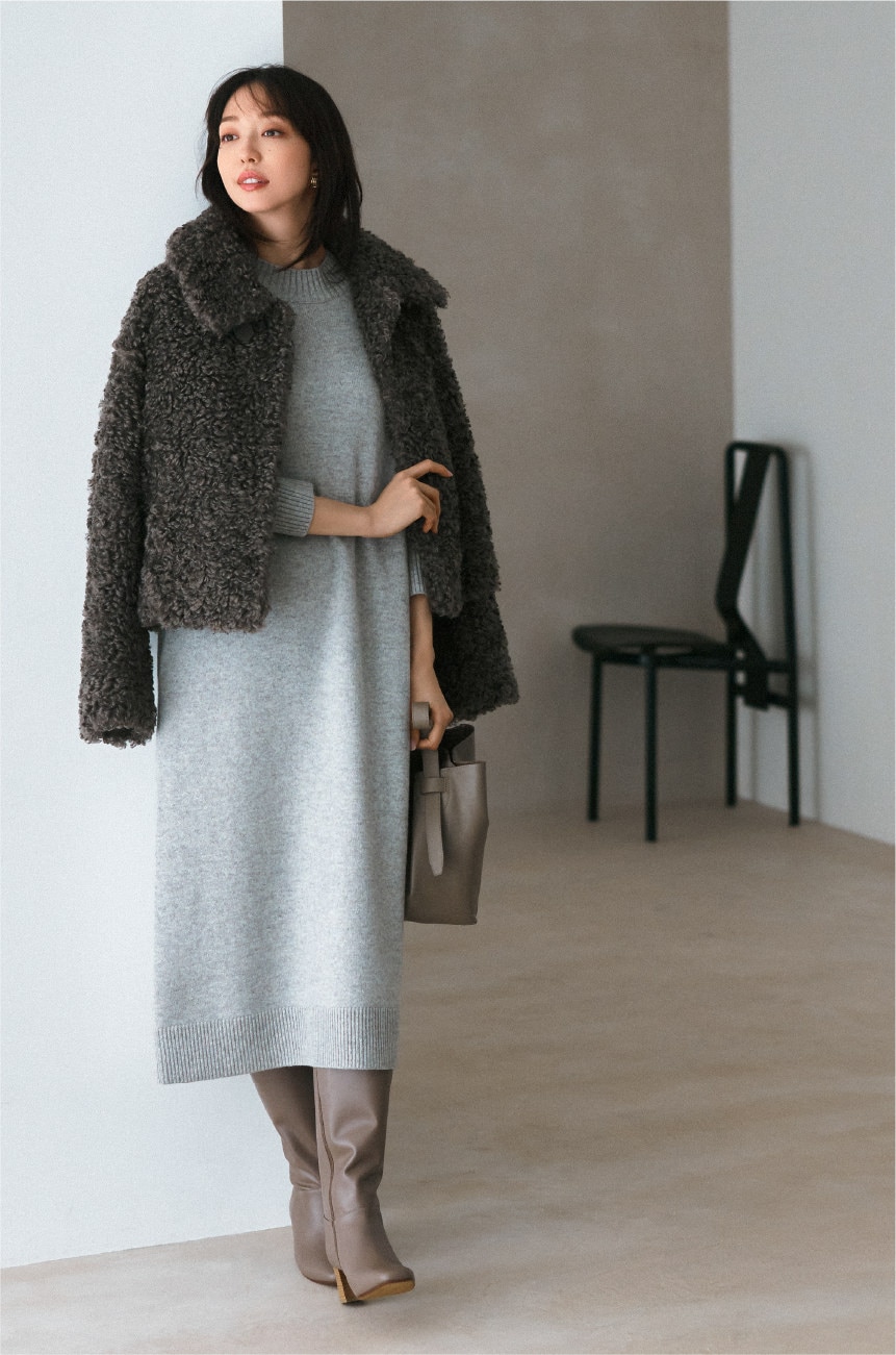 ゆっくりと過ごしたい日にはリラックスできるニットワンピースを手に取りがち。ラクだからこそ、ラフに見えないように色味でトレンドを取り入れて。表情感のあるアウターを羽織れば、ワンランク上の着こなしが叶う。