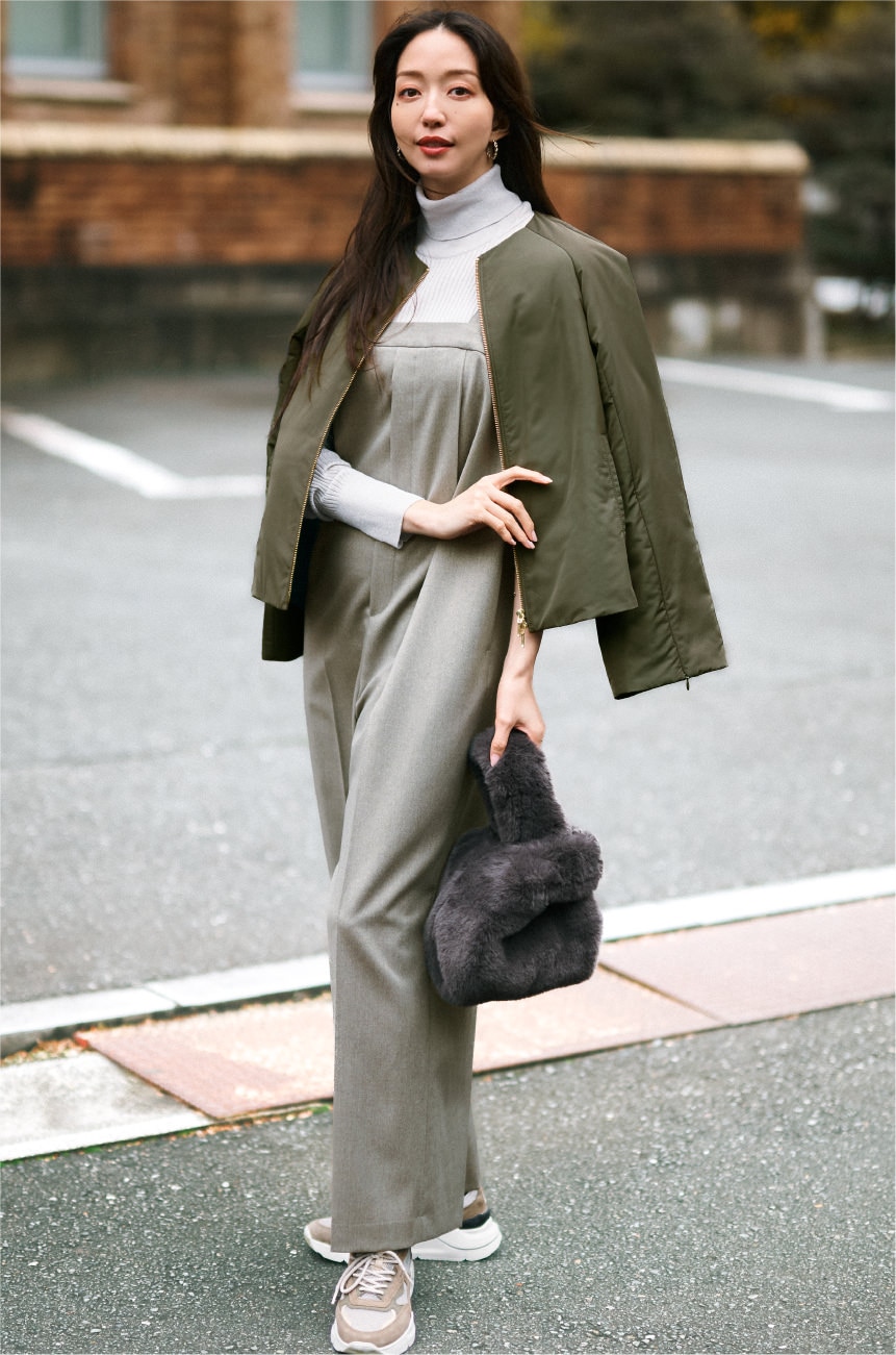 冬のワンピーススタイルはニットが多くなりがち。2月にもなると少しマンネリを感じてくる。そんな時にはサロペットで雰囲気をがらりと変えてみて。重ねるアイテム次第で、デイリーからきれいめまで幅広く着まわせる。