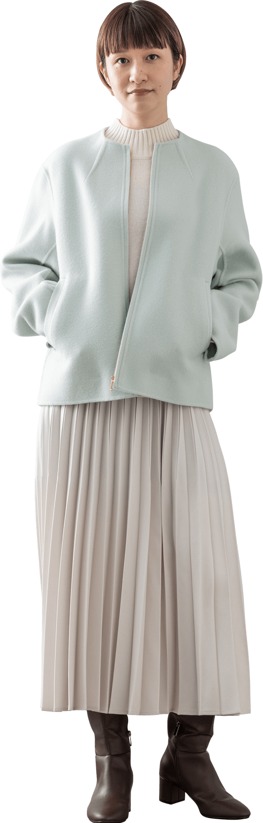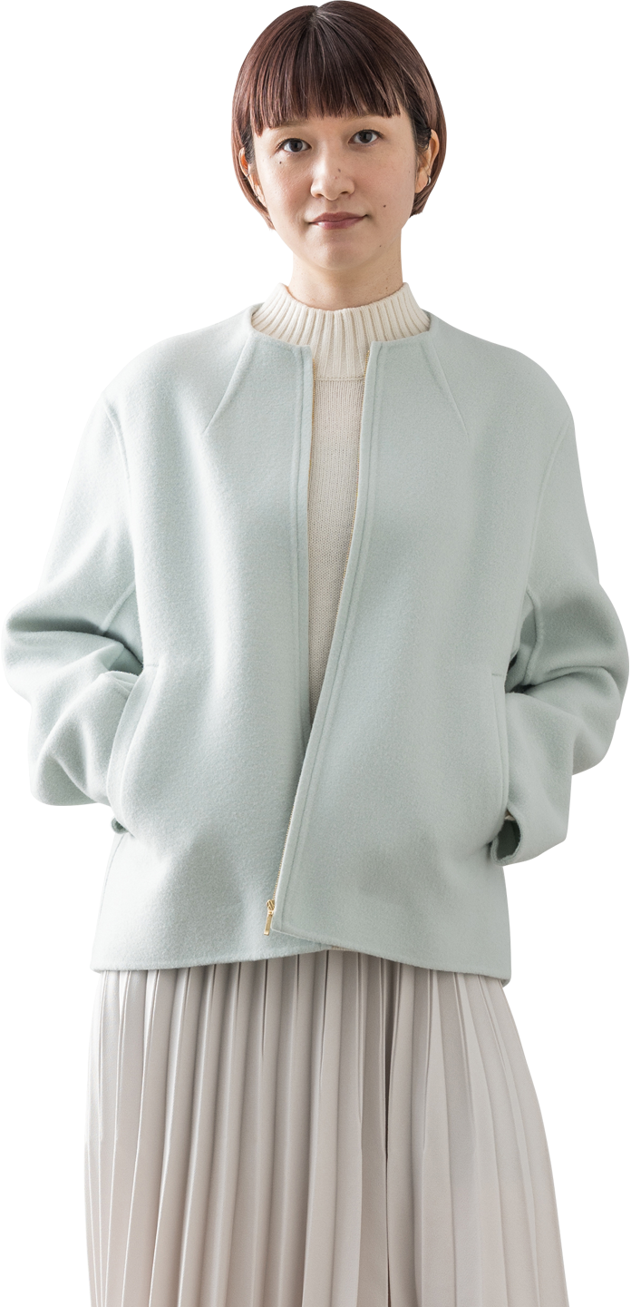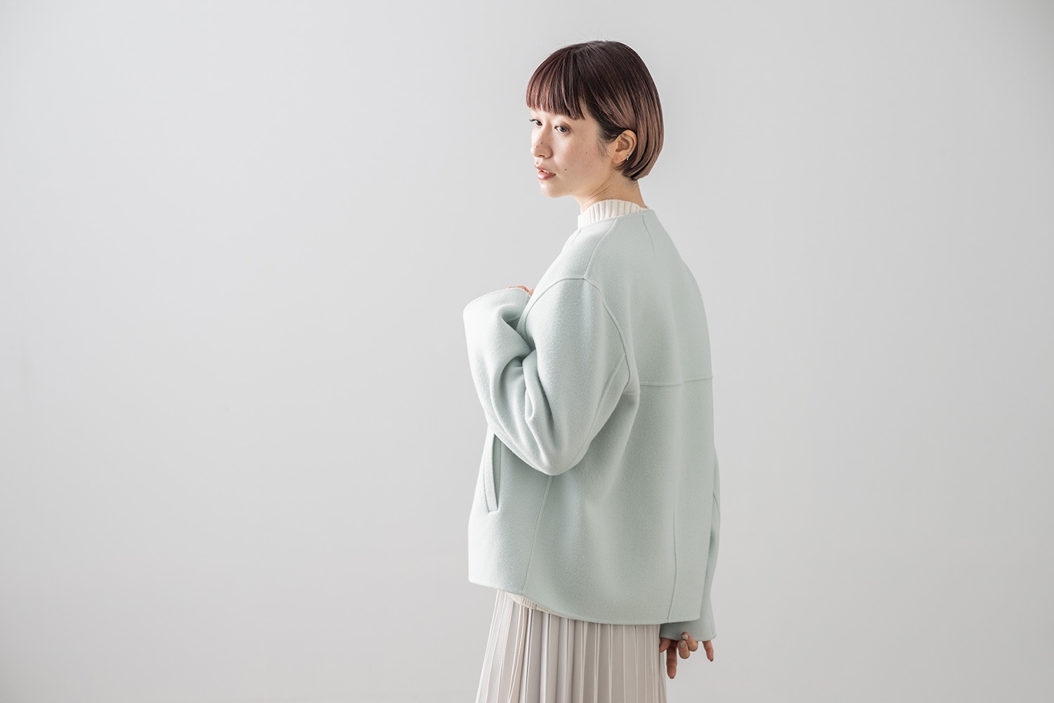 ふんわりとしたシルエットと淡いトーンが魅力のショートコート。軽やかに羽織れるのに、暖かい。プリーツスカートを合わせれば優しい印象に。明るい色味で季節の始まりにもぴったりな1枚。